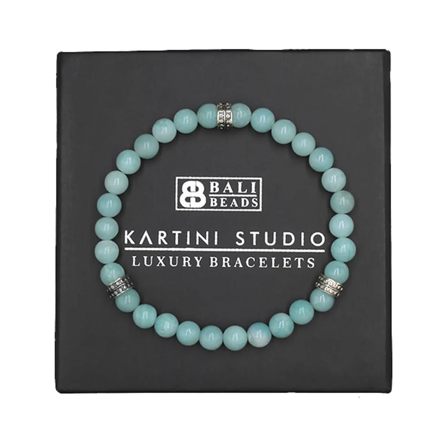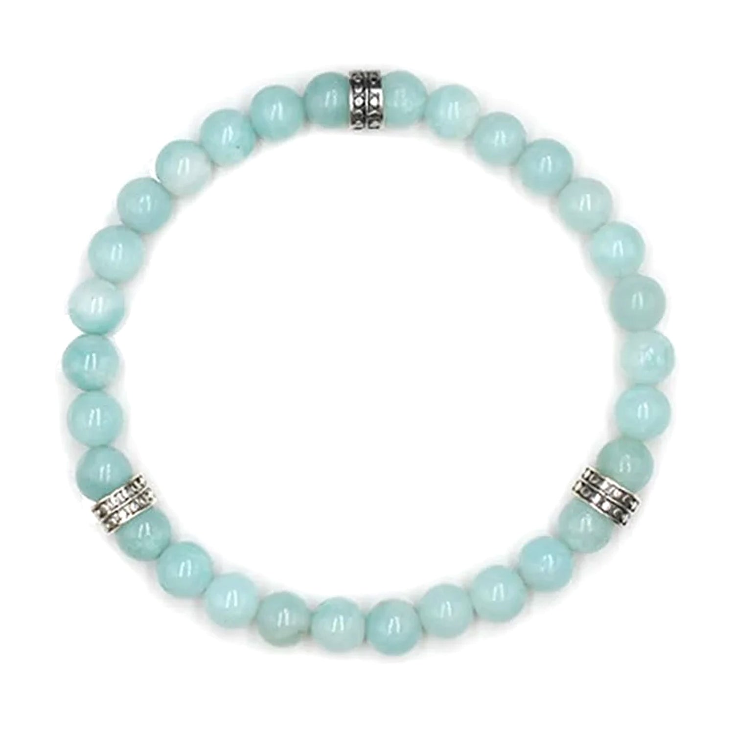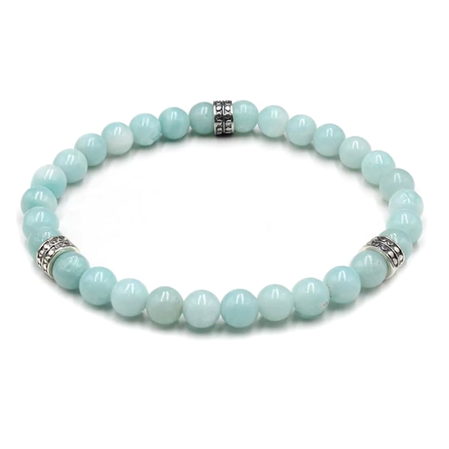 Dieses Armband besteht aus 6 mm großen Amazonitperlen, akzentuiert mit drei handgefertigten „Punkt“-Perlen aus Sterlingsilber.