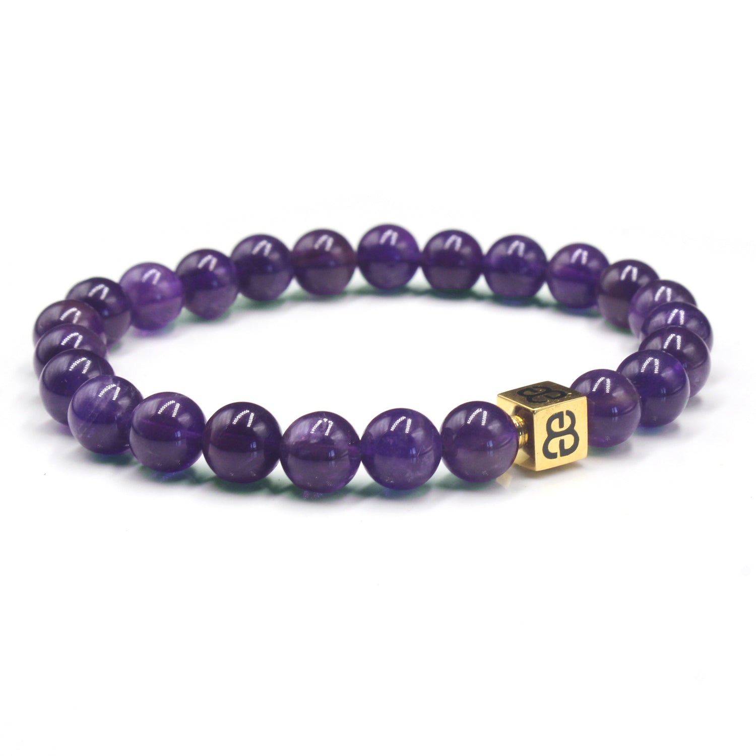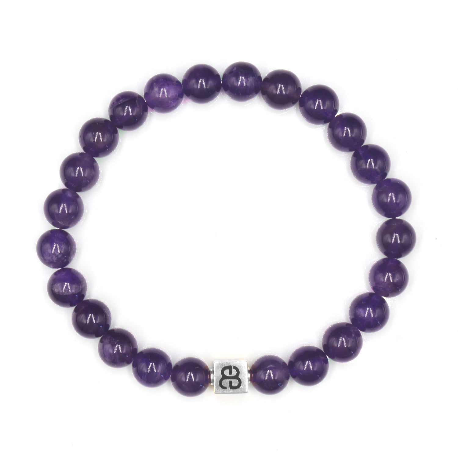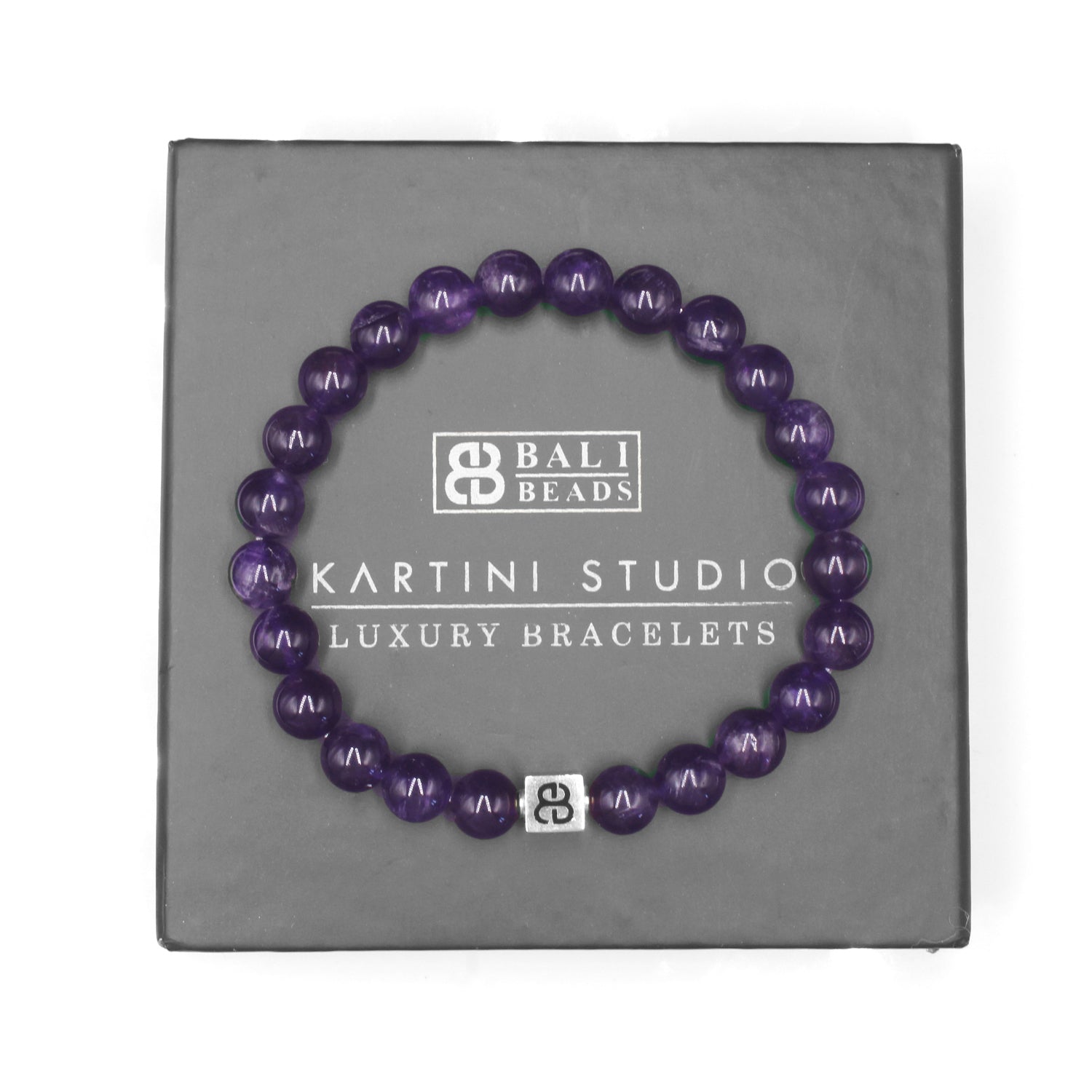 Dieses Armband besteht aus 8 mm großen Amethystperlen, akzentuiert mit einer 8 mm x 8 mm großen „Bali Beads“-Logoperle aus Sterlingsilber oder 22 Karat vergoldetem Sterlingsilber.