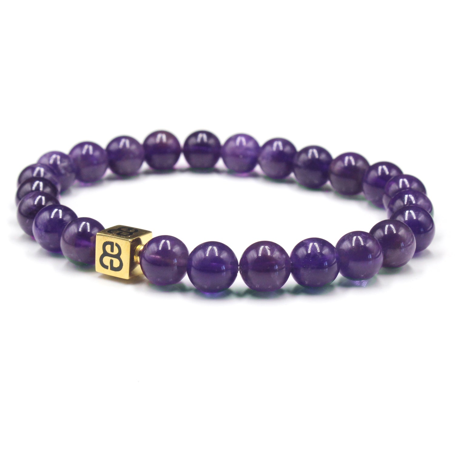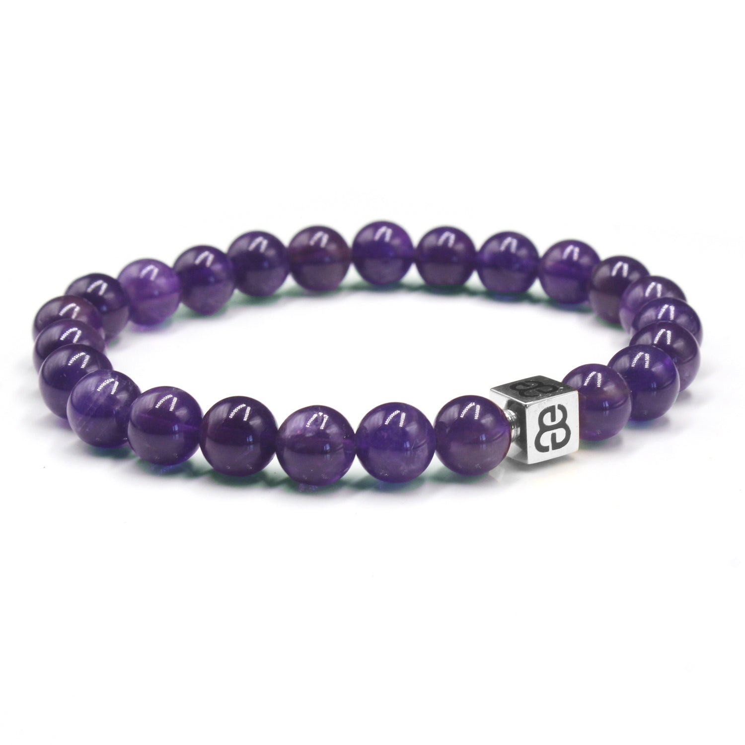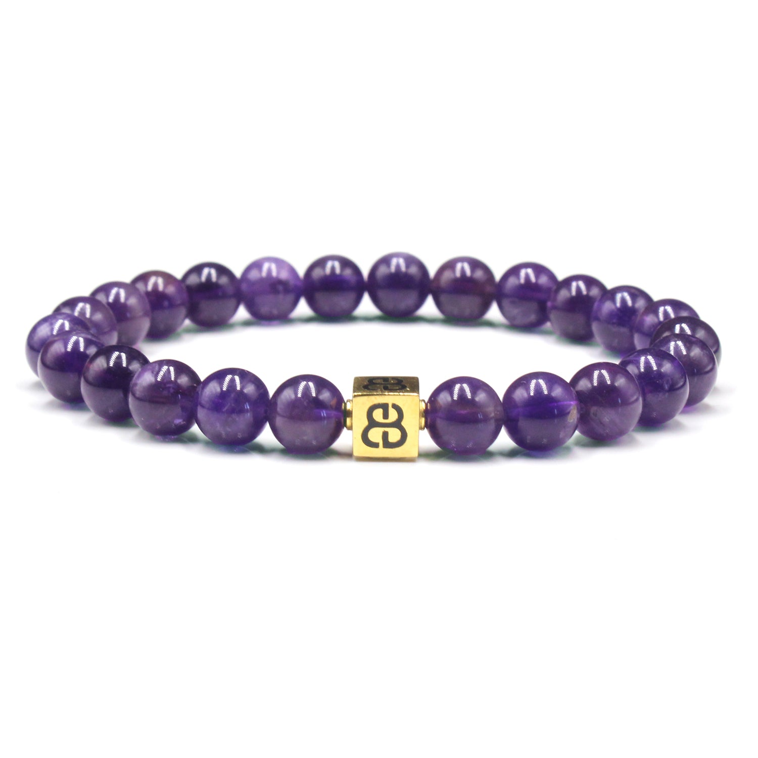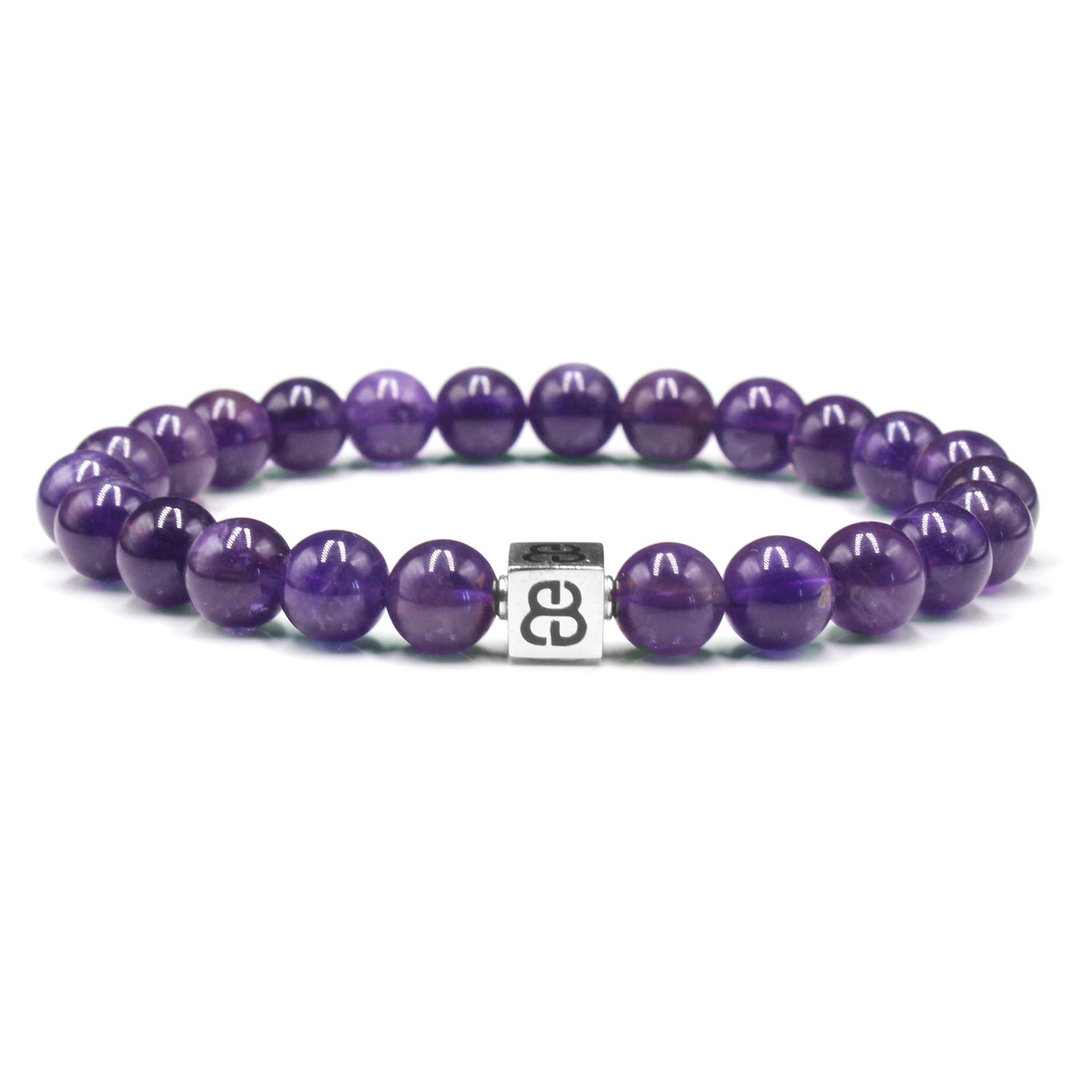 Dieses Armband besteht aus 8 mm großen Amethystperlen, akzentuiert mit einer 8 mm x 8 mm großen „Bali Beads“-Logoperle aus Sterlingsilber oder 22 Karat vergoldetem Sterlingsilber.