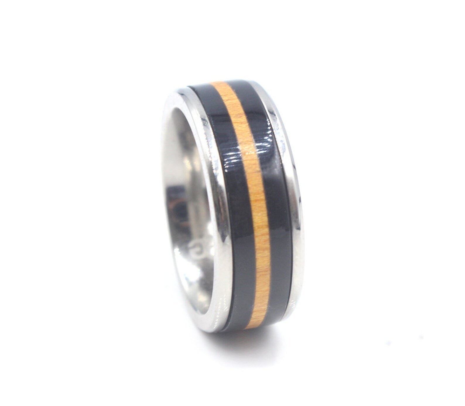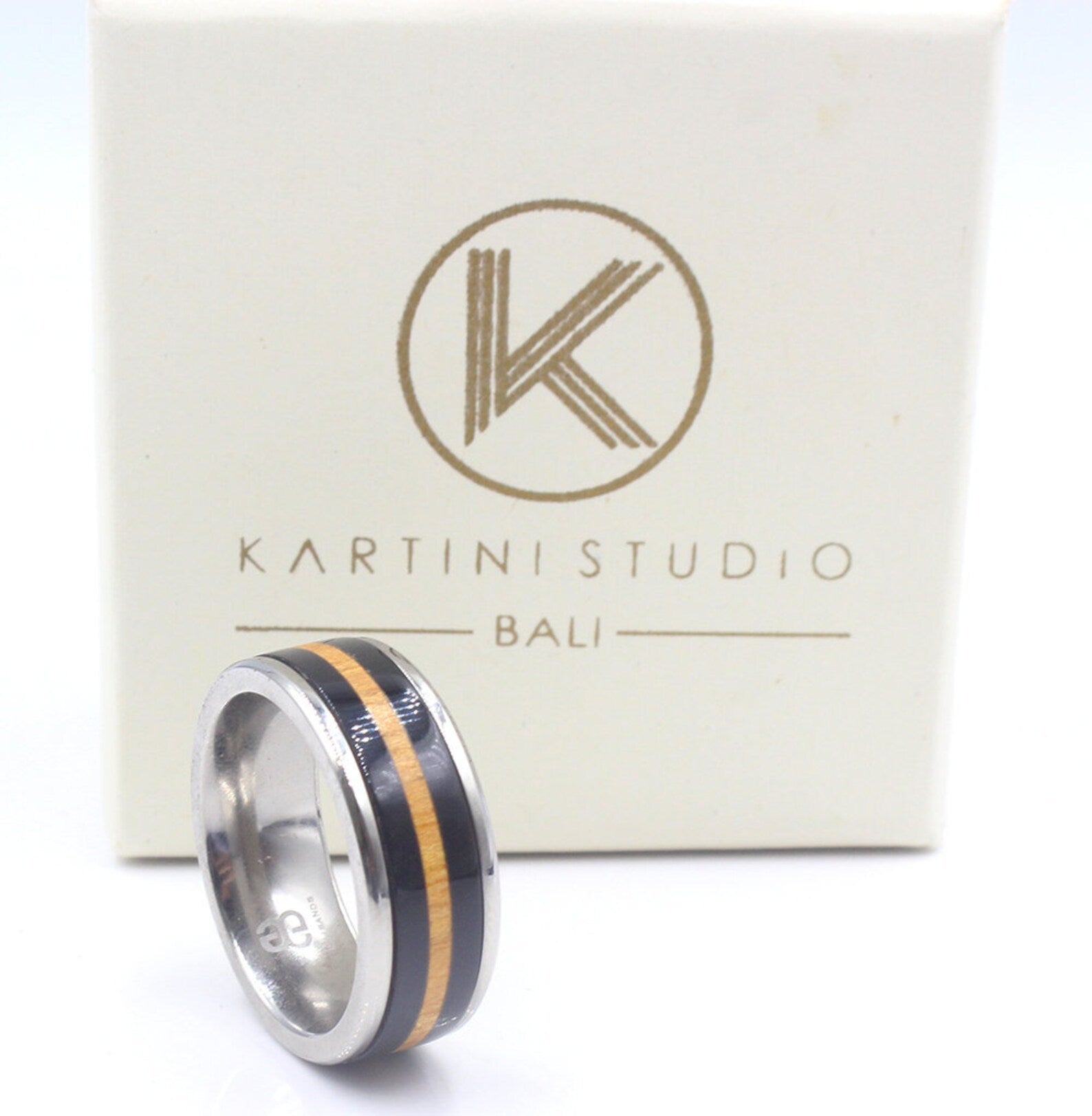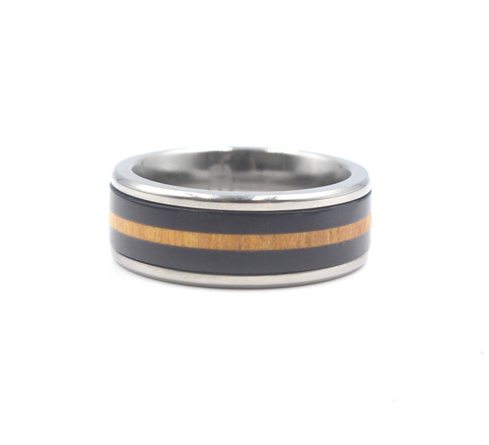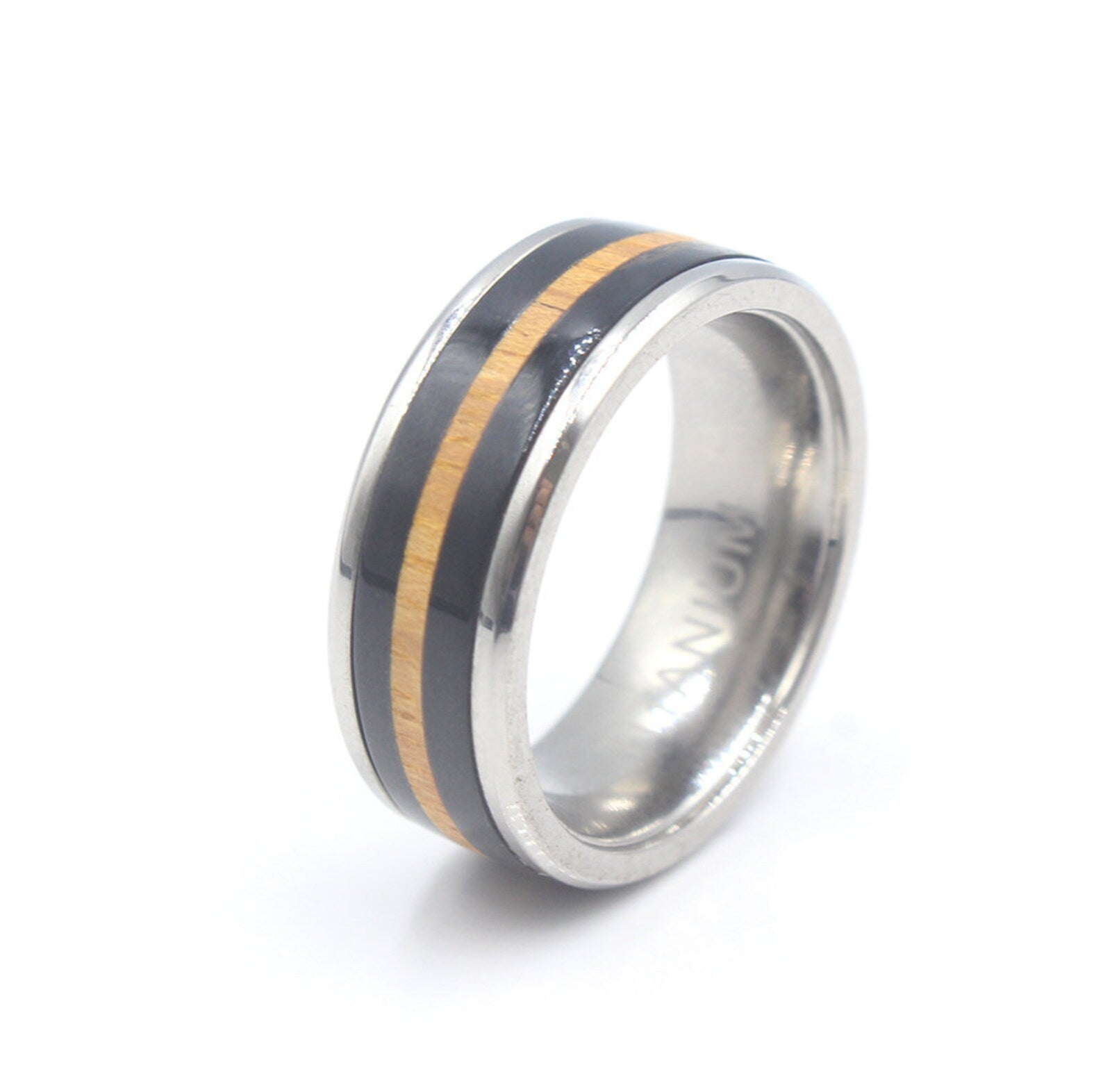 Dieser handgefertigte Herrenring aus Titan mit dreifacher Einlage ist unser eigenes, einzigartiges Design.