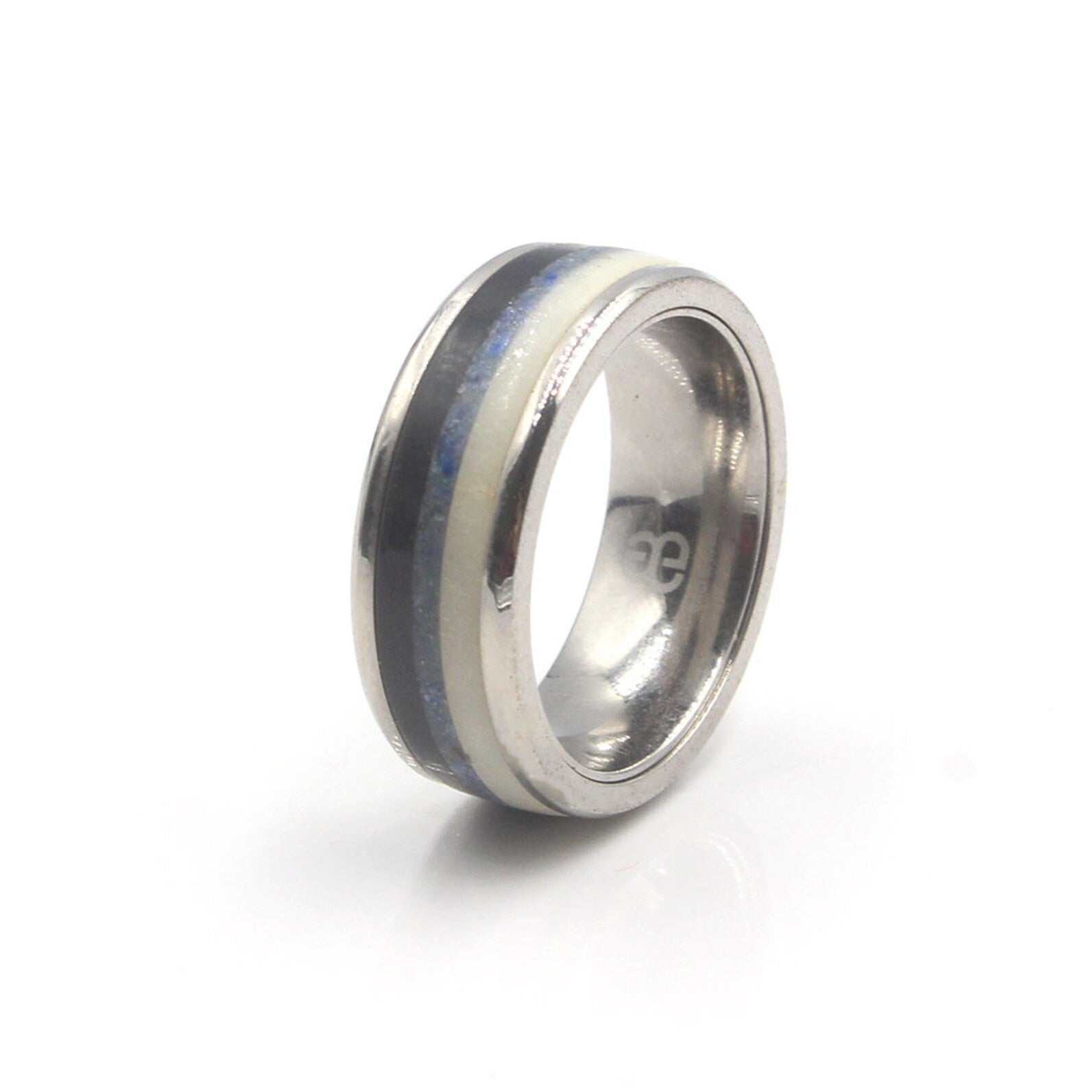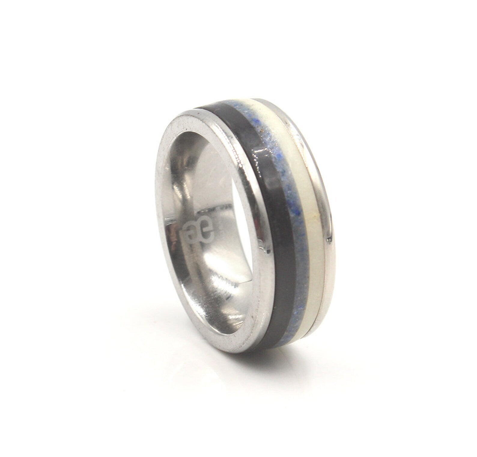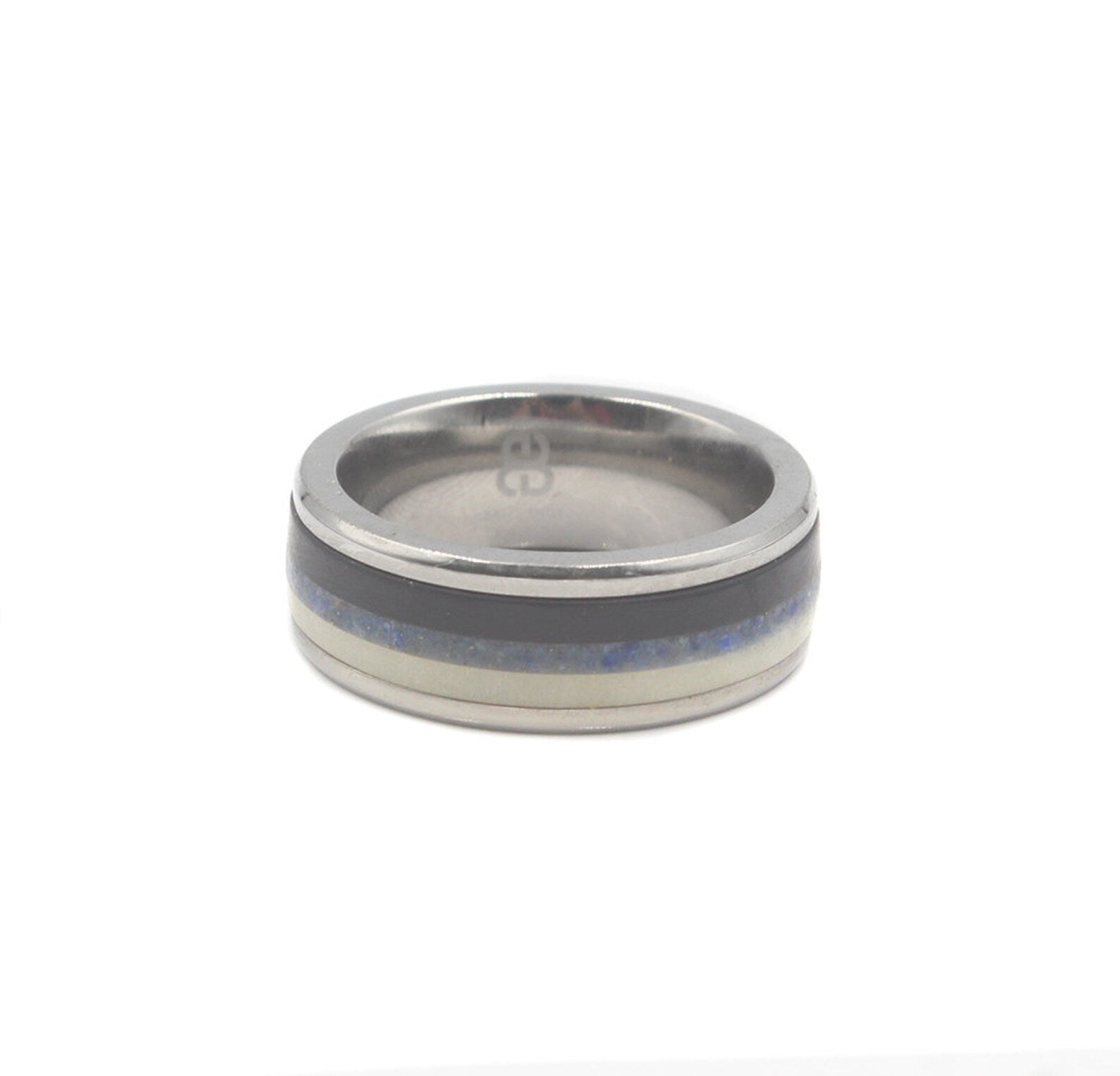 Dieser handgefertigte Herrenring aus Titan mit dreifacher Einlage ist unser eigenes, einzigartiges Design.