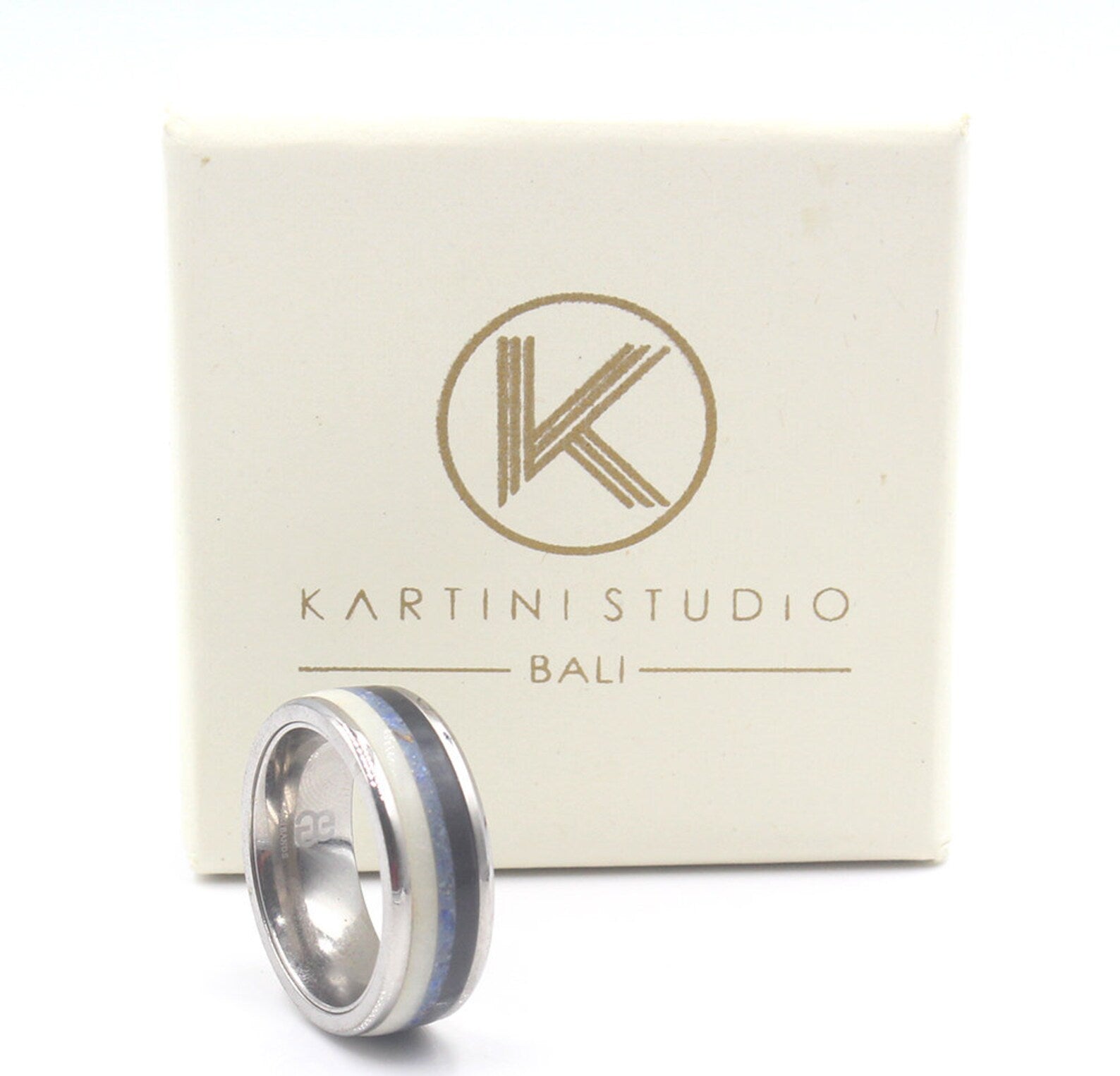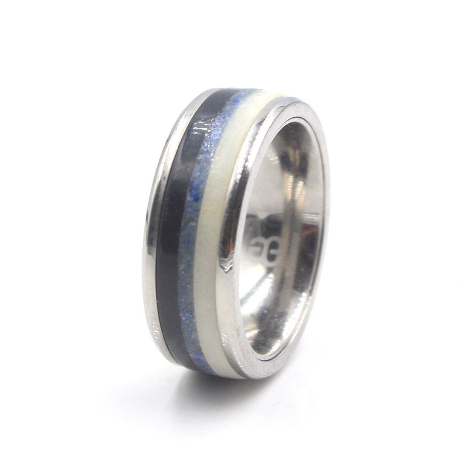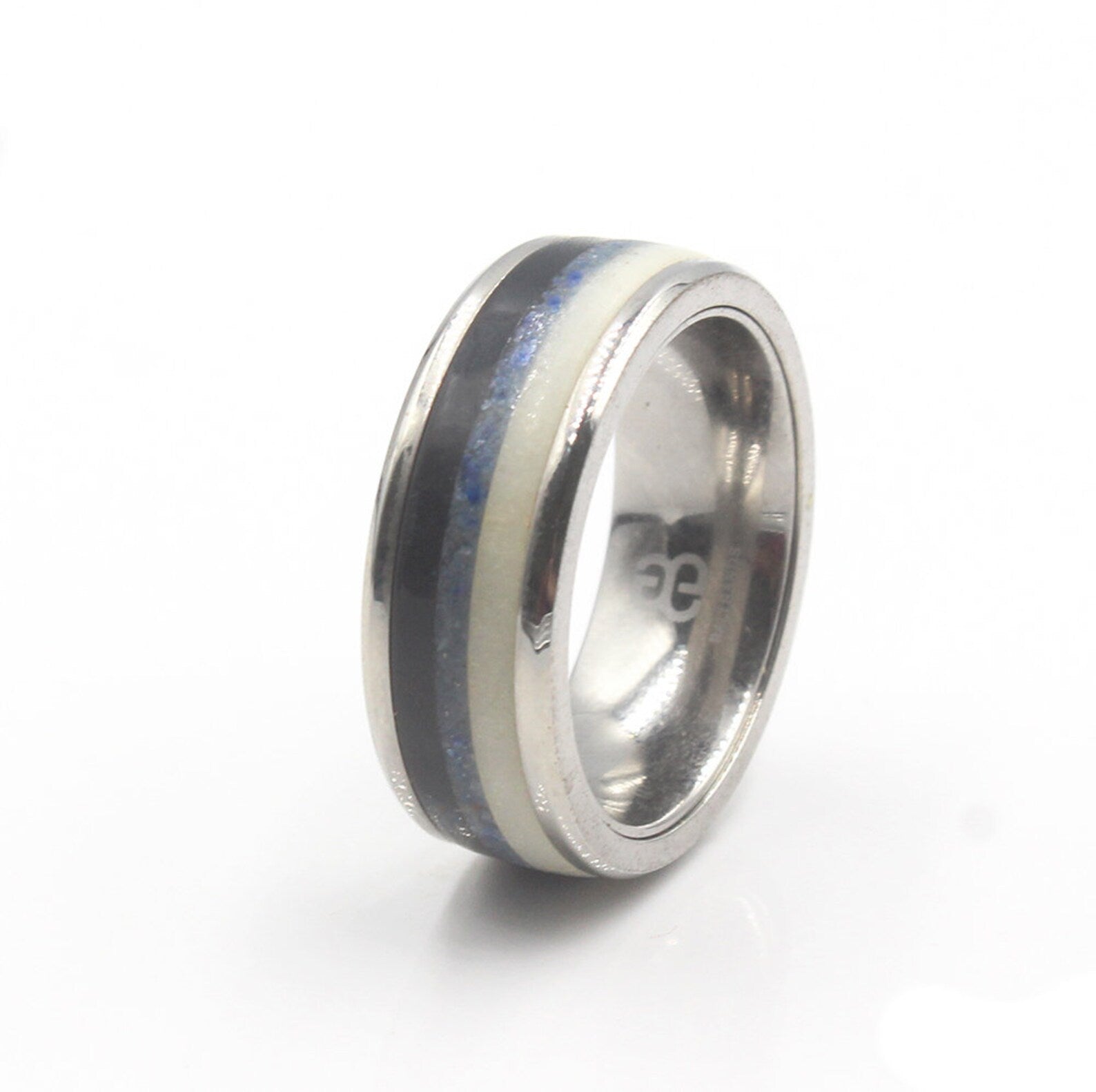 Dieser handgefertigte Herrenring aus Titan mit dreifacher Einlage ist unser eigenes, einzigartiges Design.