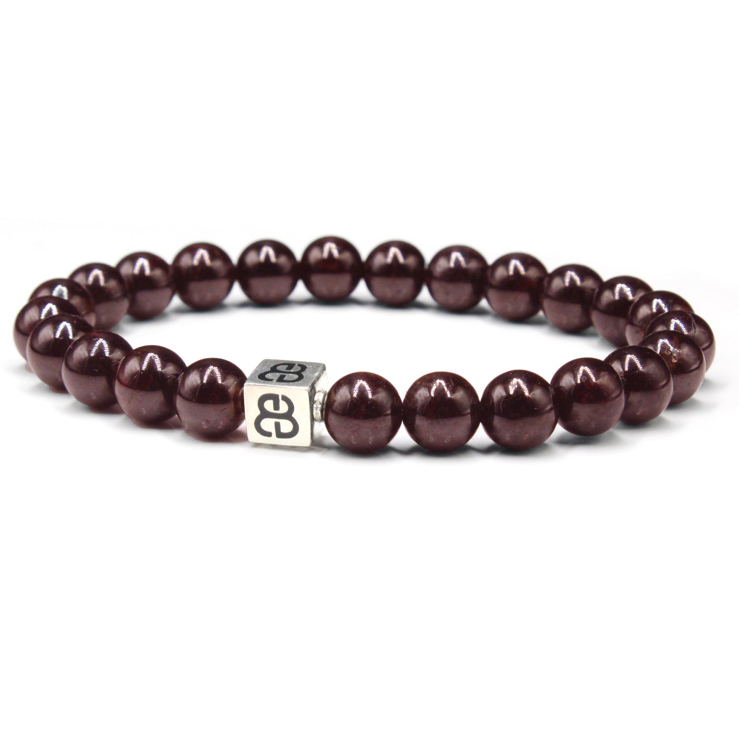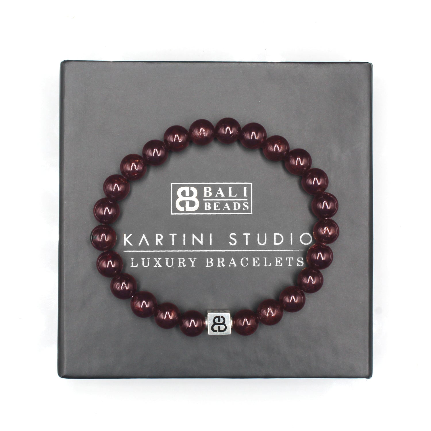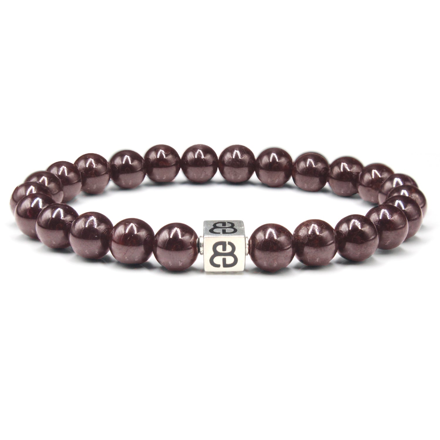 This bracelet features 8mm garnet beads accented with a 8mm x 8mm sterling silver "Bali Beads" logo bead.