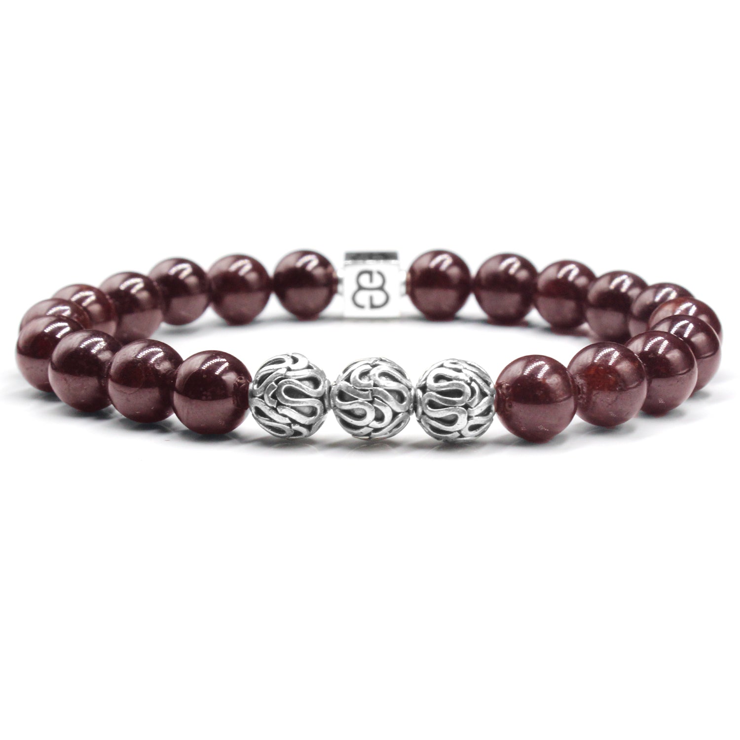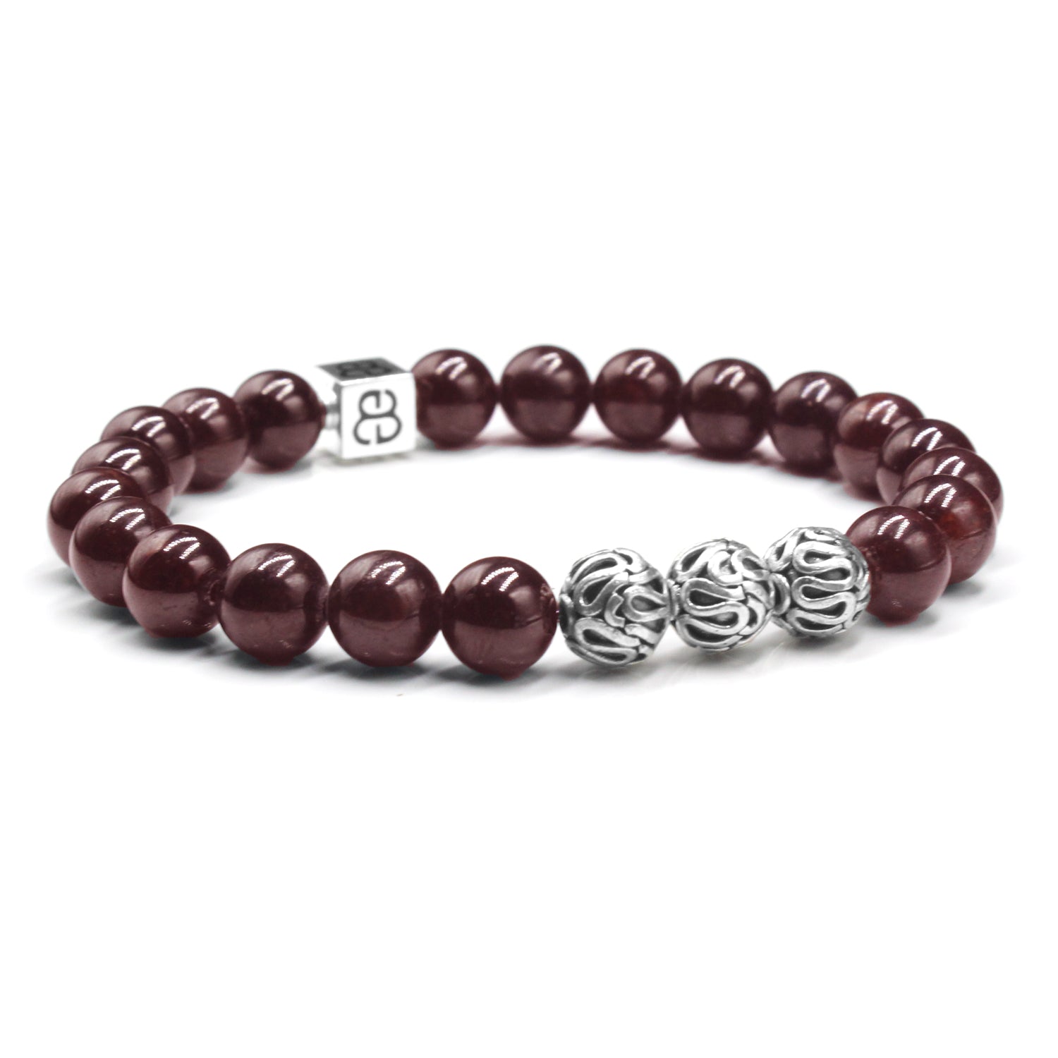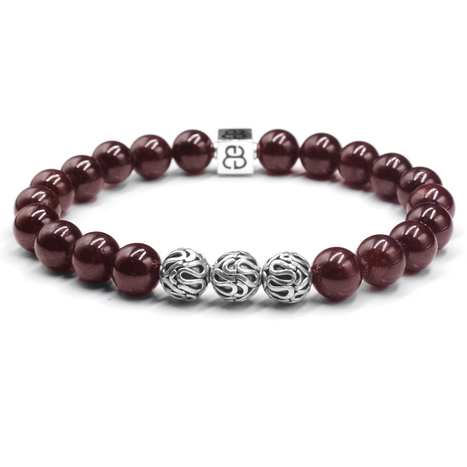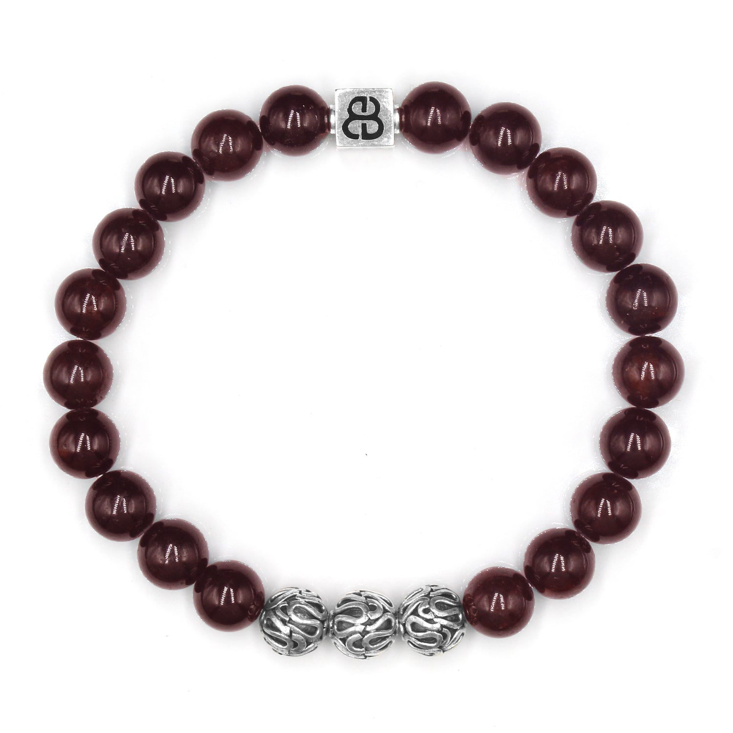 Dieses Armband besteht aus 8 mm großen Granatsteinperlen, akzentuiert durch drei handgefertigte 8 mm große Bali-Perlen aus Sterlingsilber und eine 8 mm große Ankerperle aus Sterlingsilber mit dem „Bali Beads“-Logo. Wir verwenden ein 1 mm dickes Silikon-Stretchband für zusätzliche Festigkeit und überlegene Belastbarkeit. Ihr Armband wird in einem Leinenbeutel geliefert.