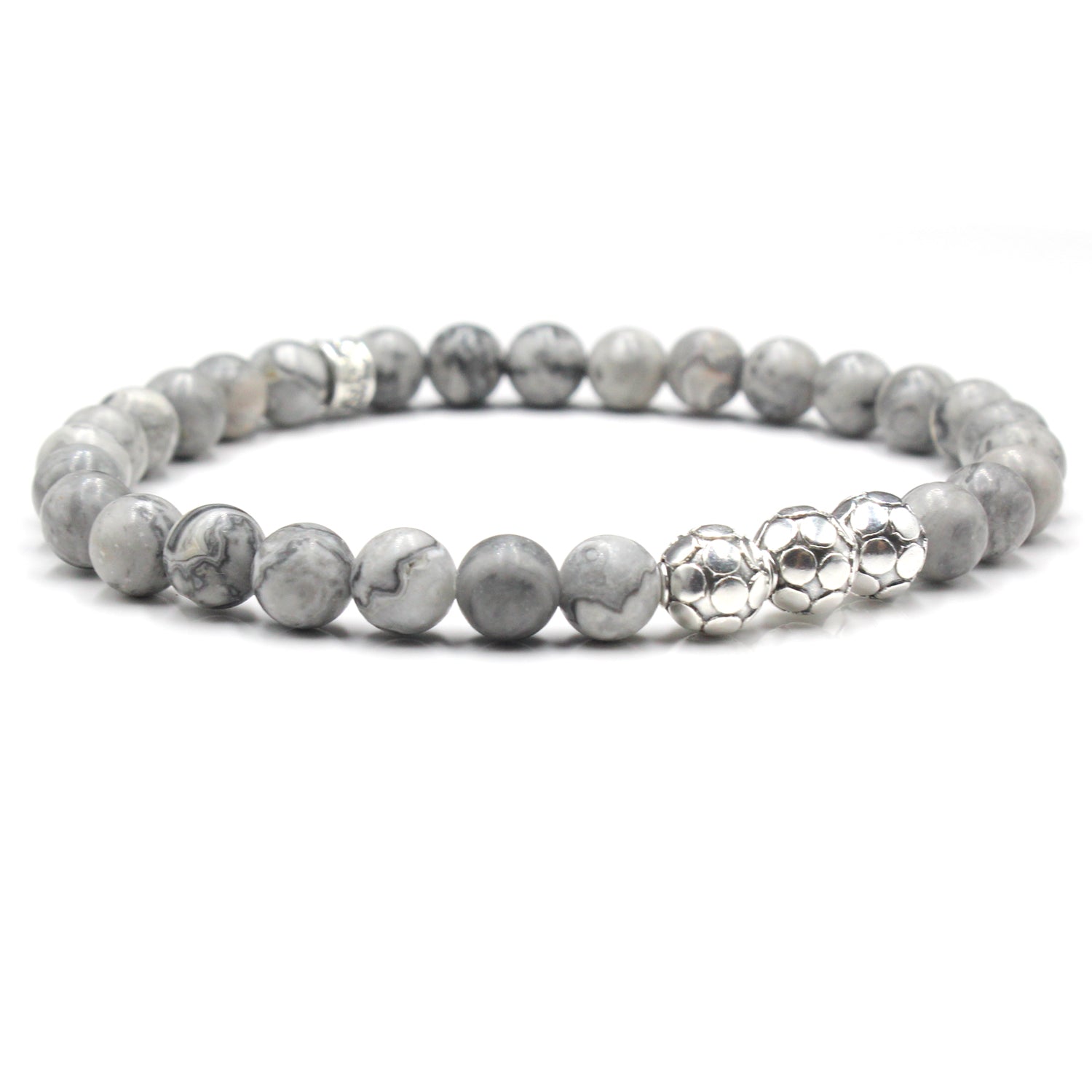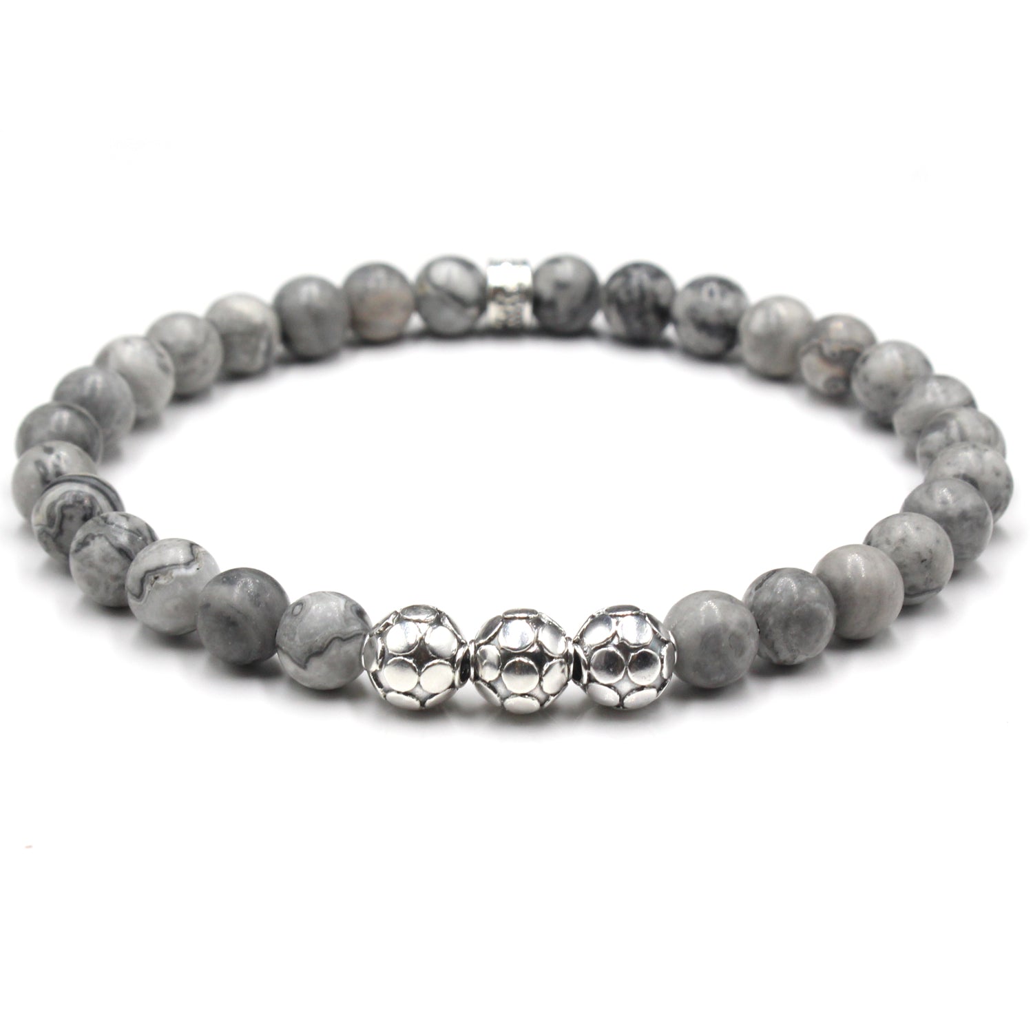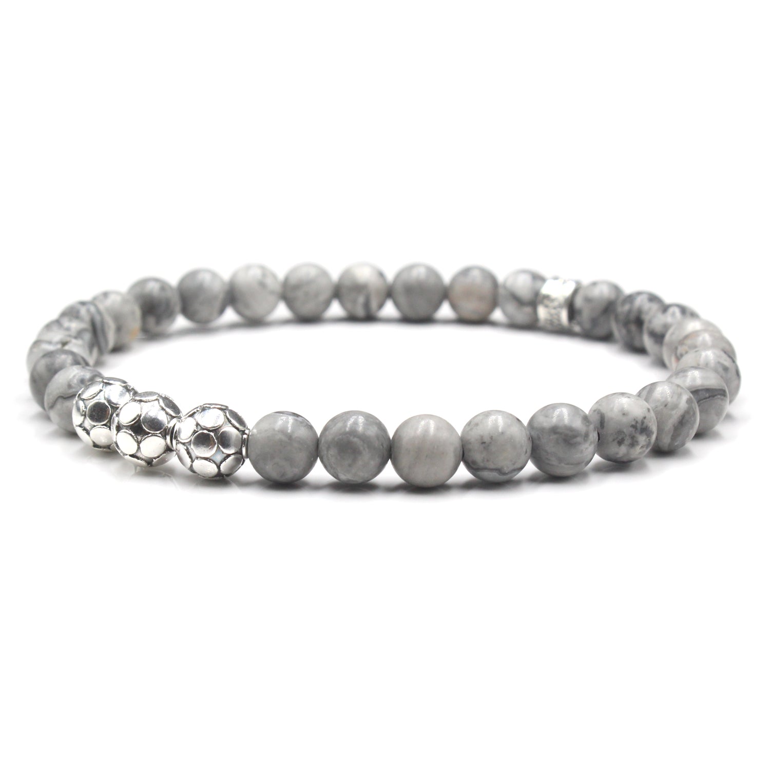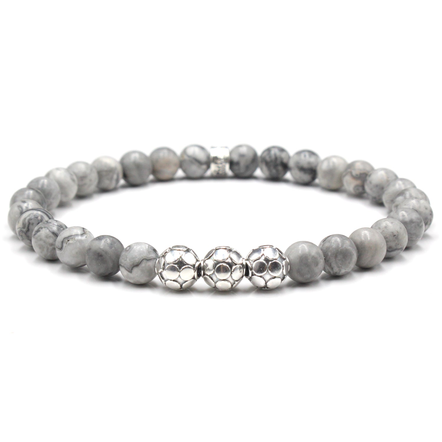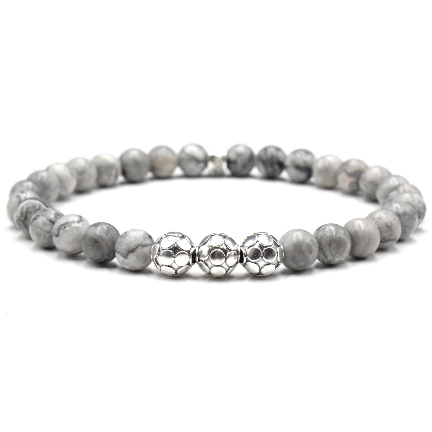 Dieses Armband besteht aus 6 mm großen Perlen aus grauem Jaspis, akzentuiert mit drei handgefertigten Bali-Perlen aus Sterlingsilber und einer Ankerperle aus Sterlingsilber.