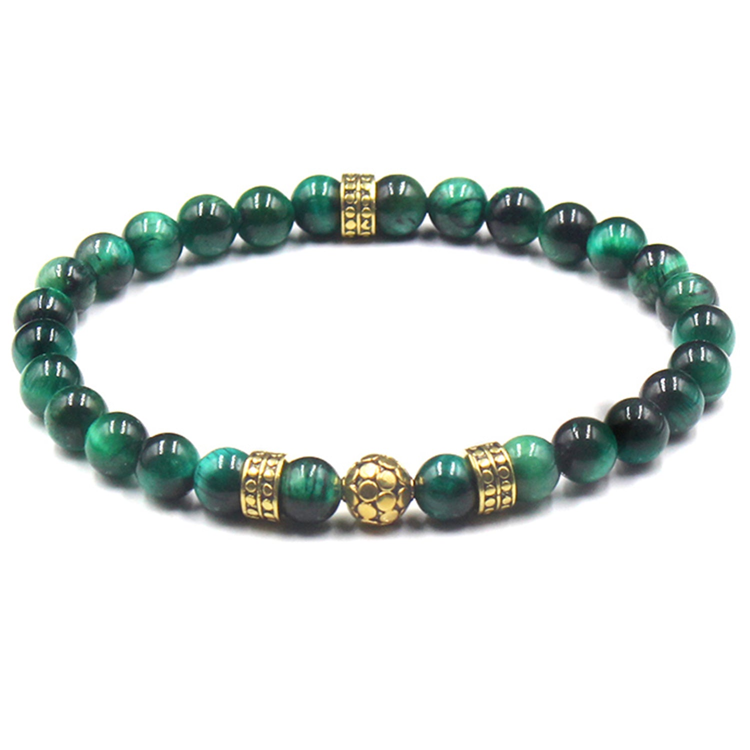 Dieses Armband besteht aus 6 mm großen Perlen aus grünem Tigerauge, akzentuiert mit einer handgemachten 6 mm großen Bali-Perle aus 22 Karat vergoldetem Sterlingsilber und drei Rondellperlen.