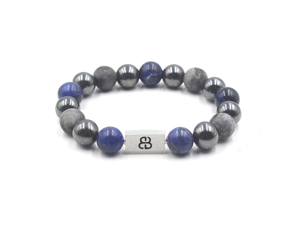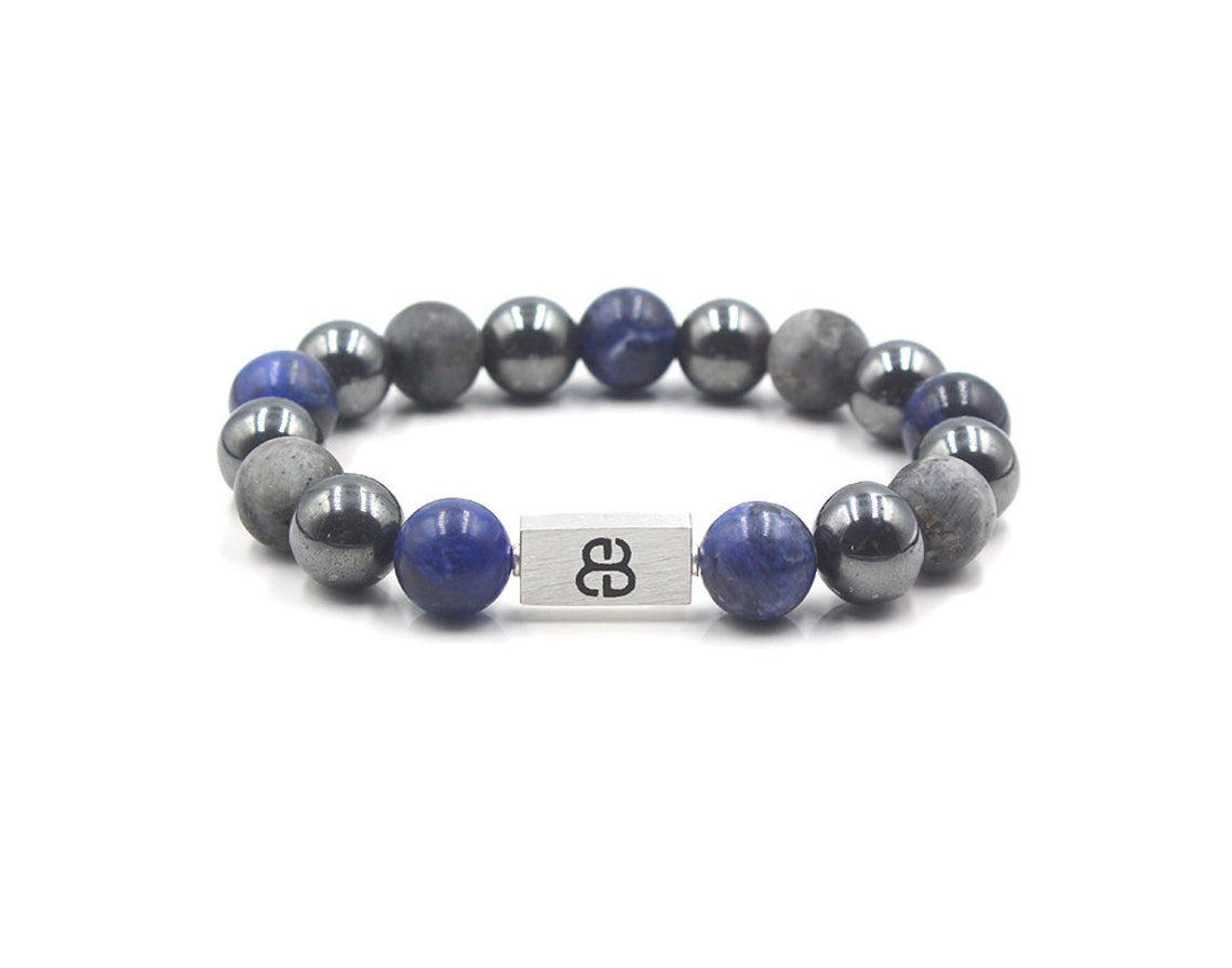 Dieses Armband besteht aus 12 mm großen Hämatitperlen, 12 mm großen matten Labradoritperlen und 12 mm großen Sodalithperlen, akzentuiert durch eine 16 mm x 8 mm x 6 mm große Perle mit dem „Bali Beads“-Logo aus gebürstetem Sterlingsilber.