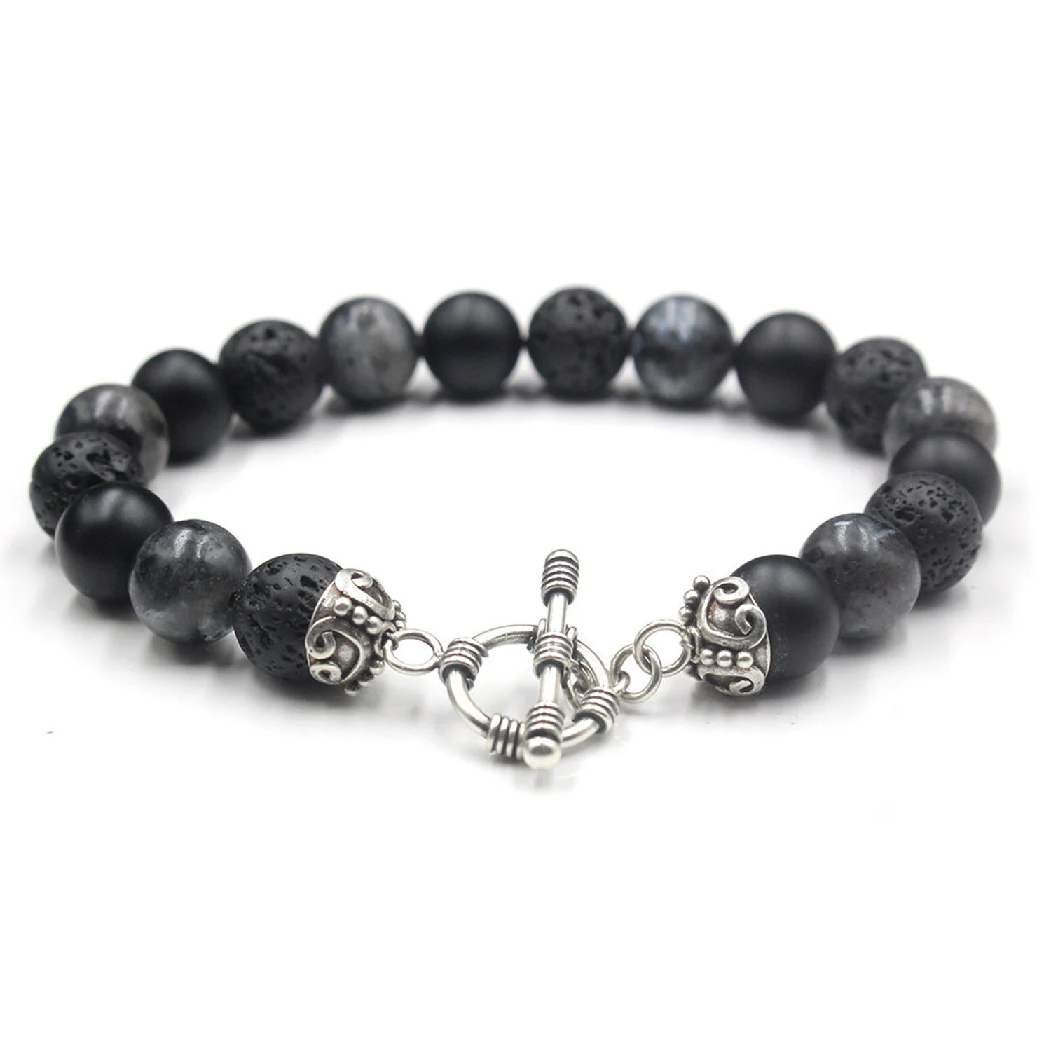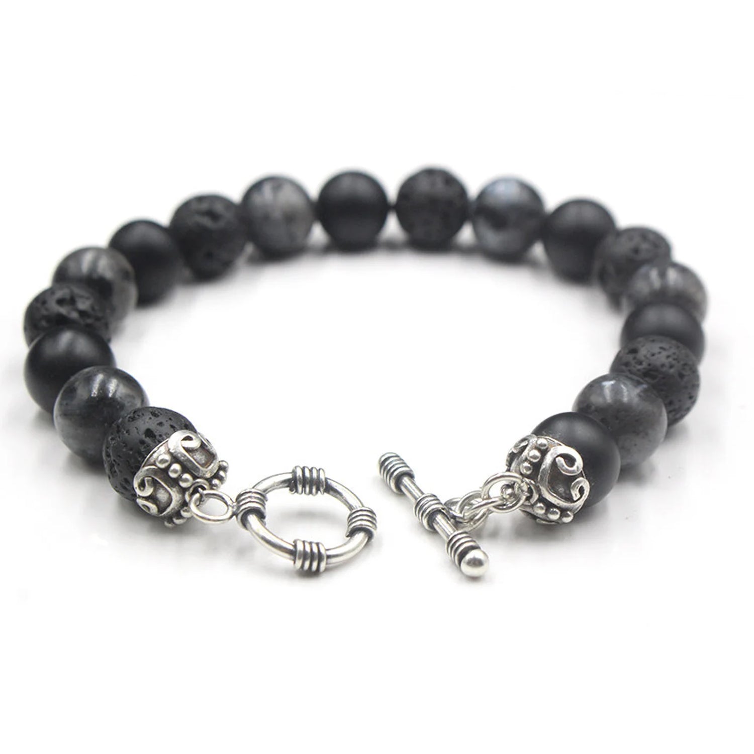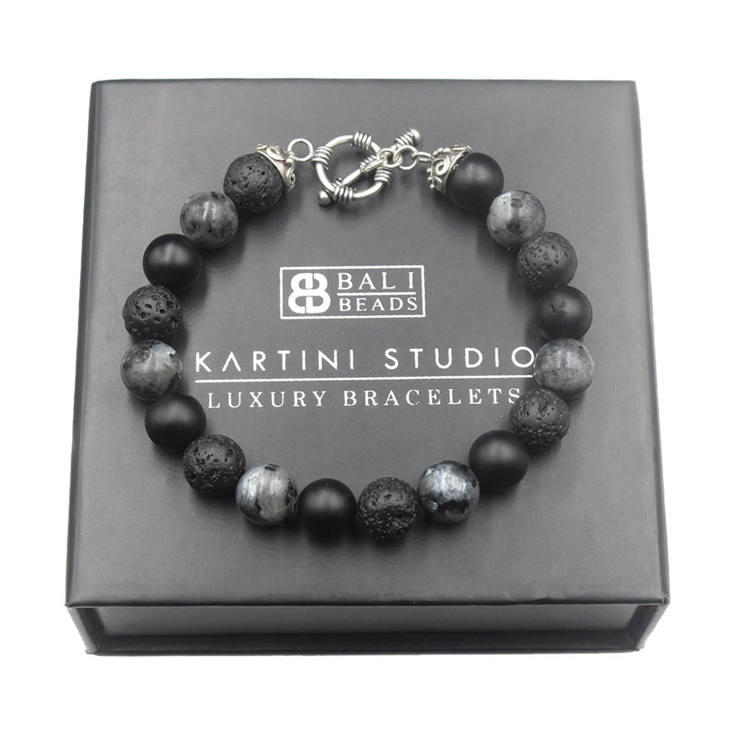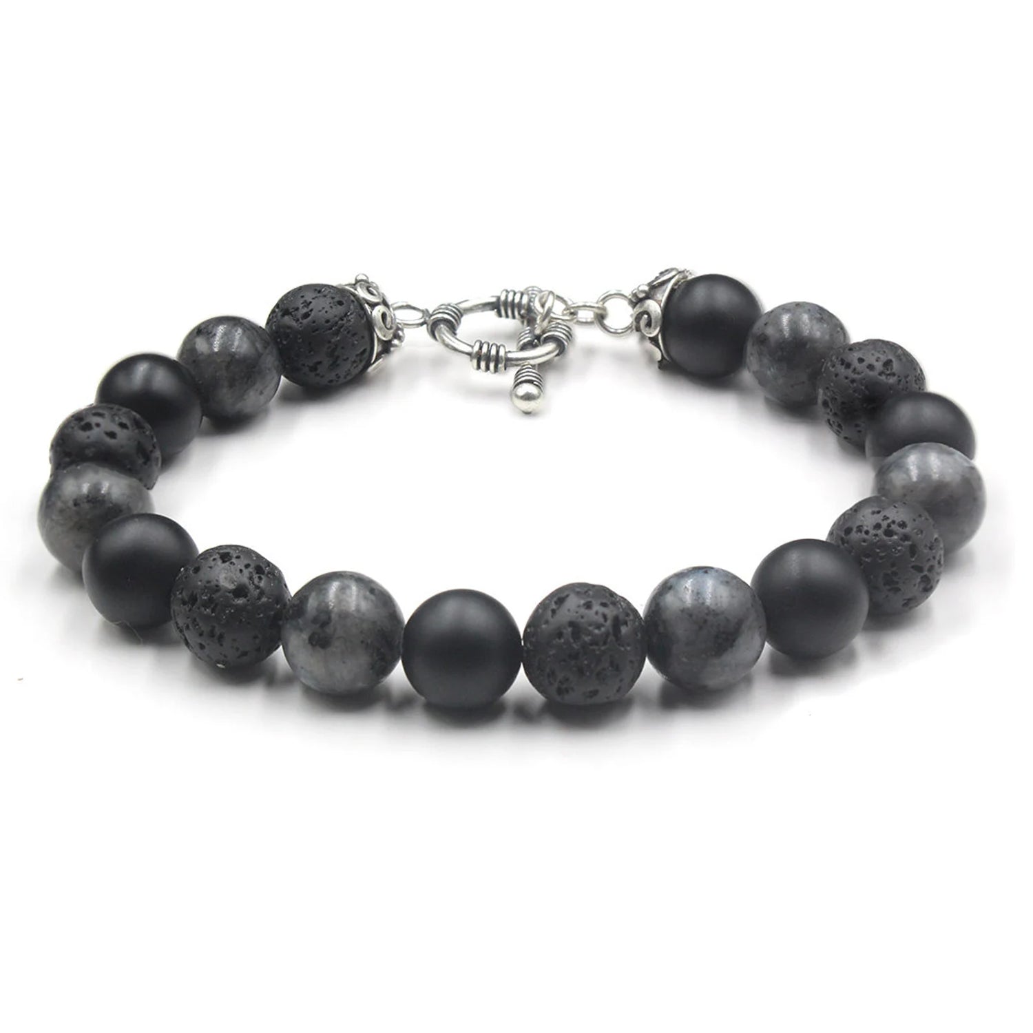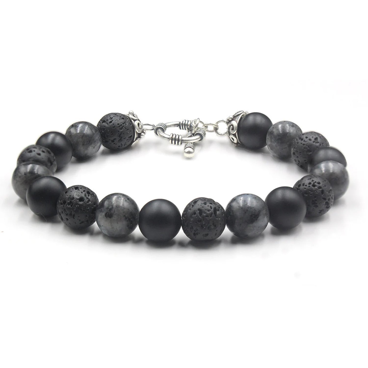 Dieses Herrenarmband besteht aus 10 mm großen Labradoritperlen, 10 mm großen Lavasteinperlen, 10 mm großen mattschwarzen Onyxperlen und Sterlingsilber-Perlenkappen. Es wird mit einem 16 mm großen Sterlingsilber-Bali-Knebelverschluss befestigt. Wir verwenden Edelstahldraht für höchste Festigkeit. Ihr Armband wird in einer Armband-Geschenkbox geliefert.