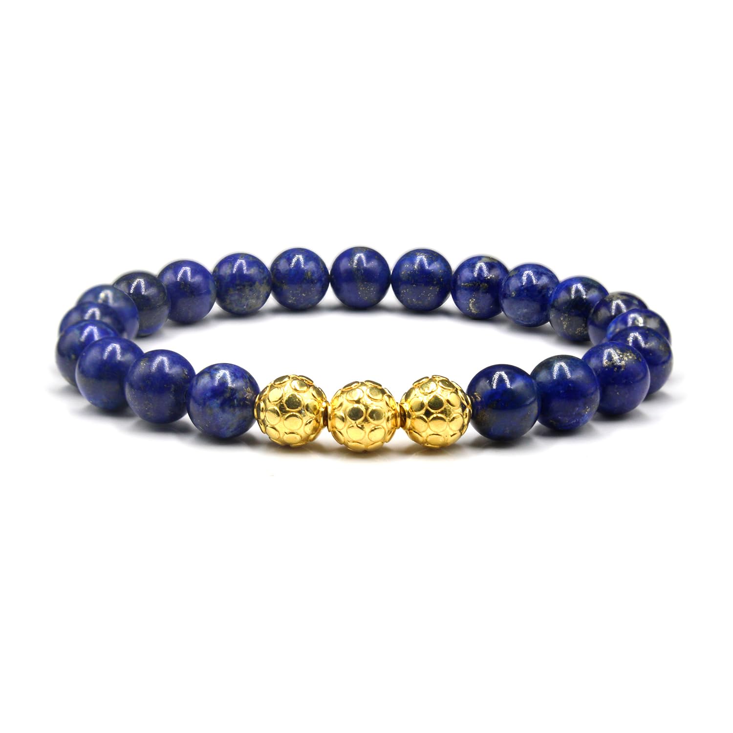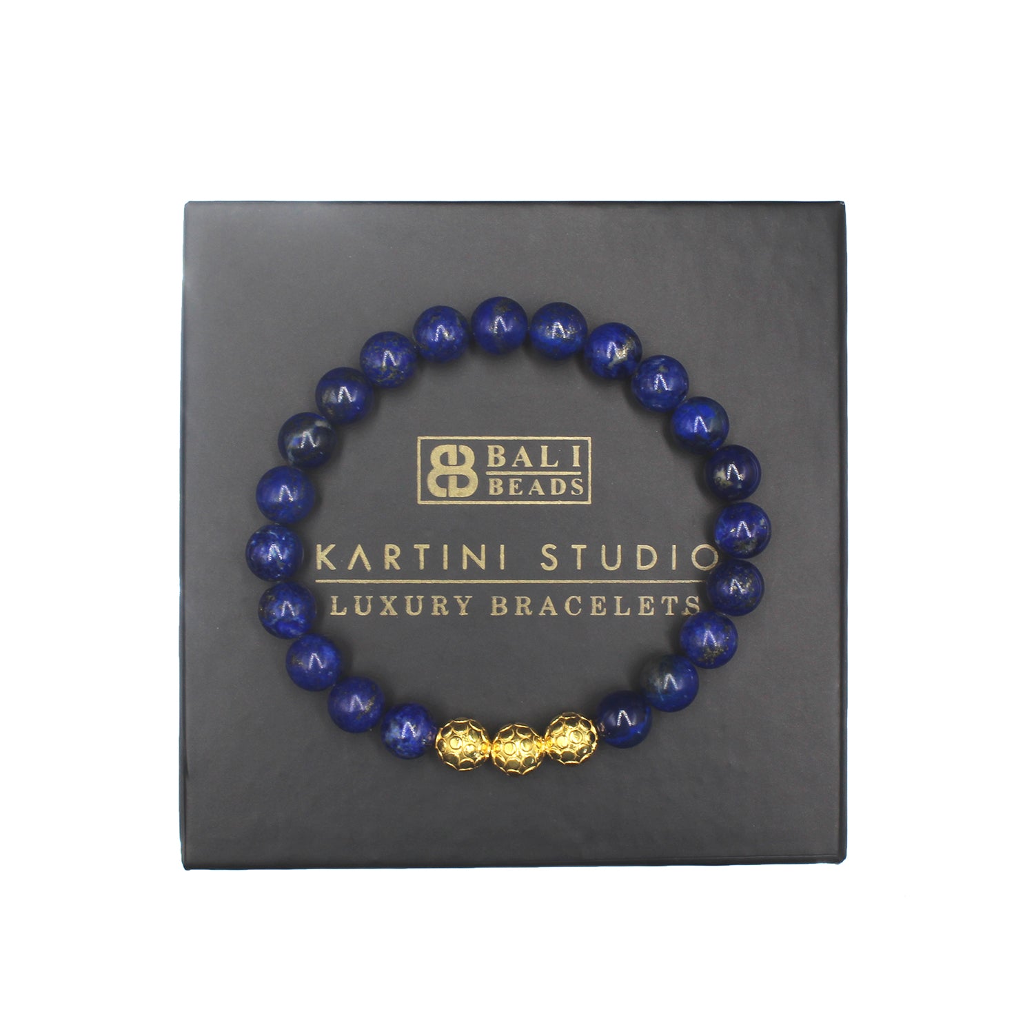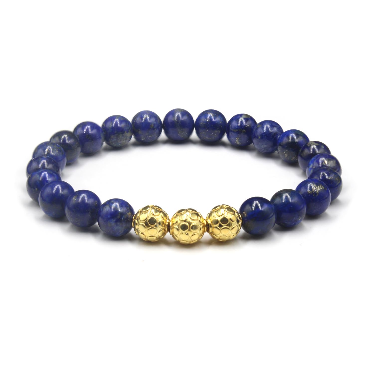 This bracelet features 8mm lapis lazulis beads accented with three handmade 8mm 22 karat gold plated sterling silver hammered "dots" beads.