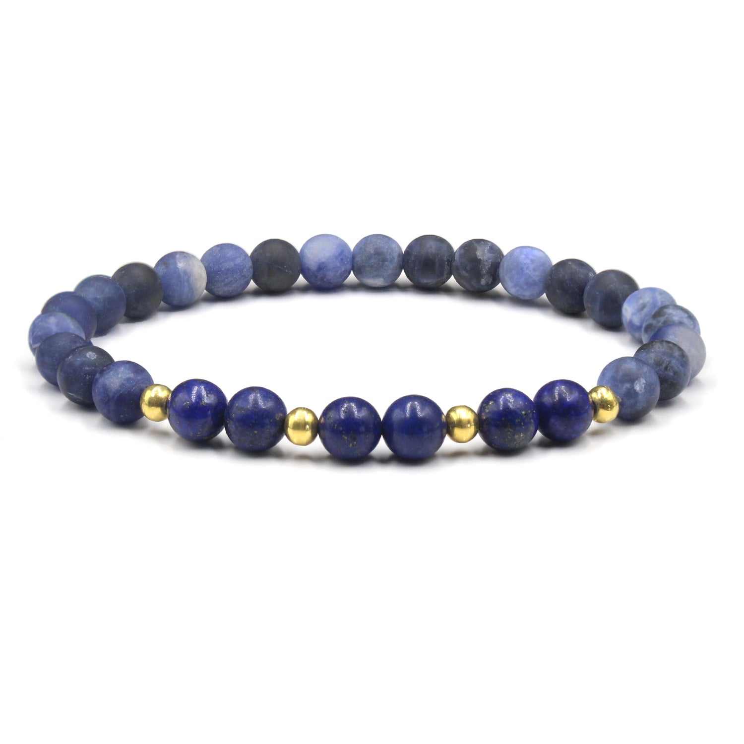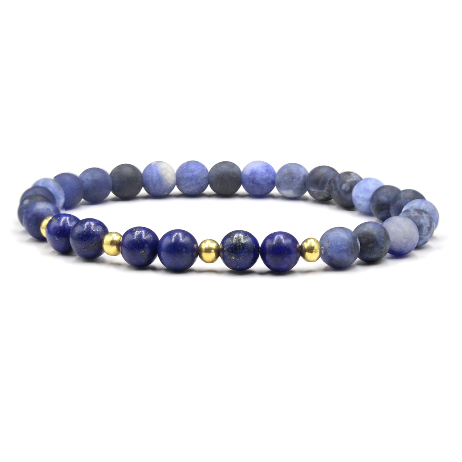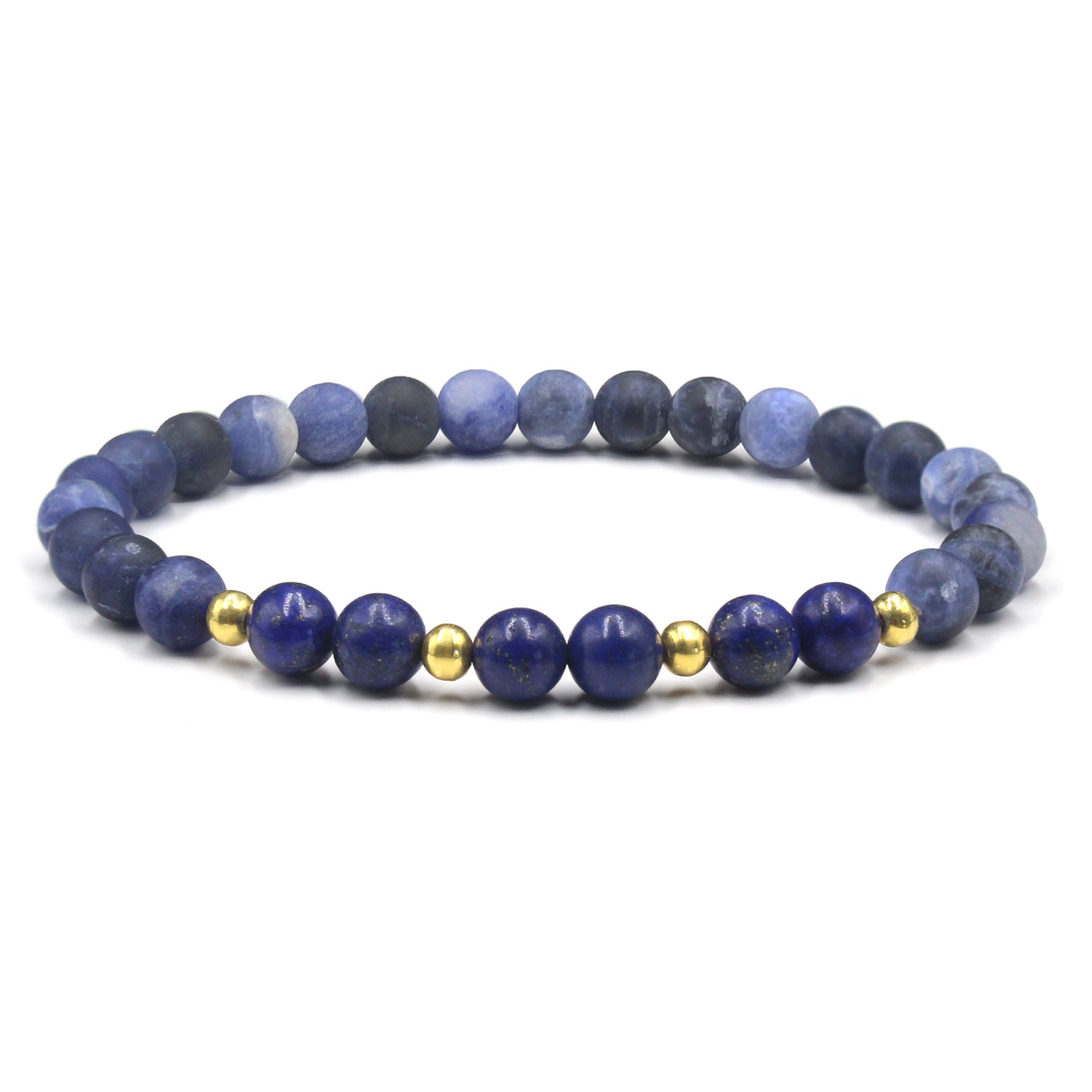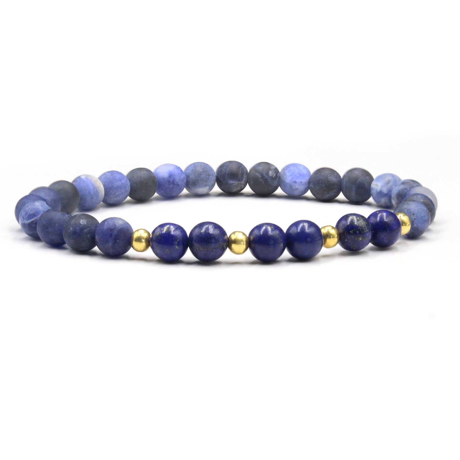 Dieses Armband besteht aus 6 mm großen Lapislazuli- und 6 mm großen matten Sodalith-Steinperlen, akzentuiert mit handgefertigten, 22 Karat vergoldeten Sterling-Silberperlen.