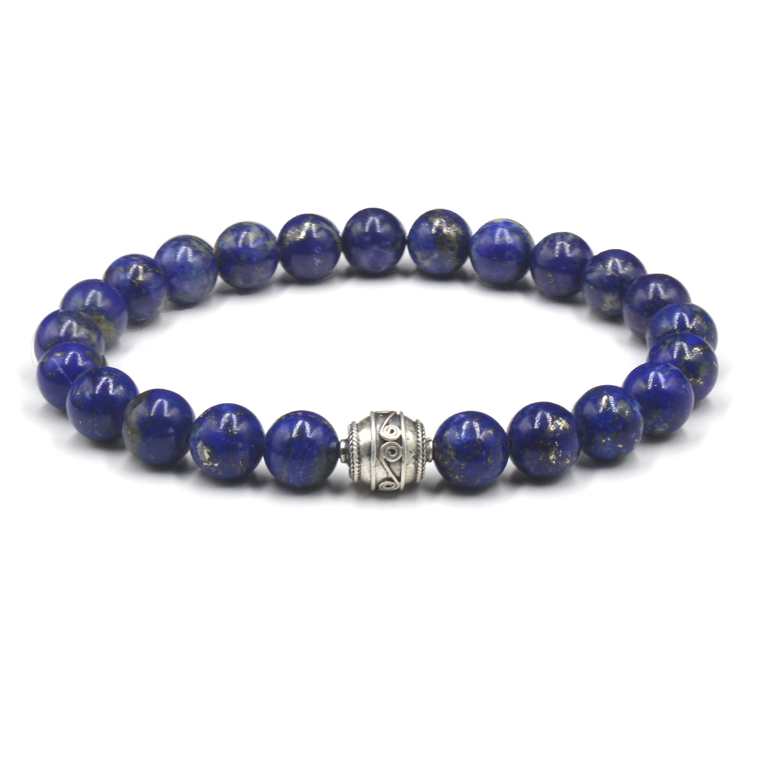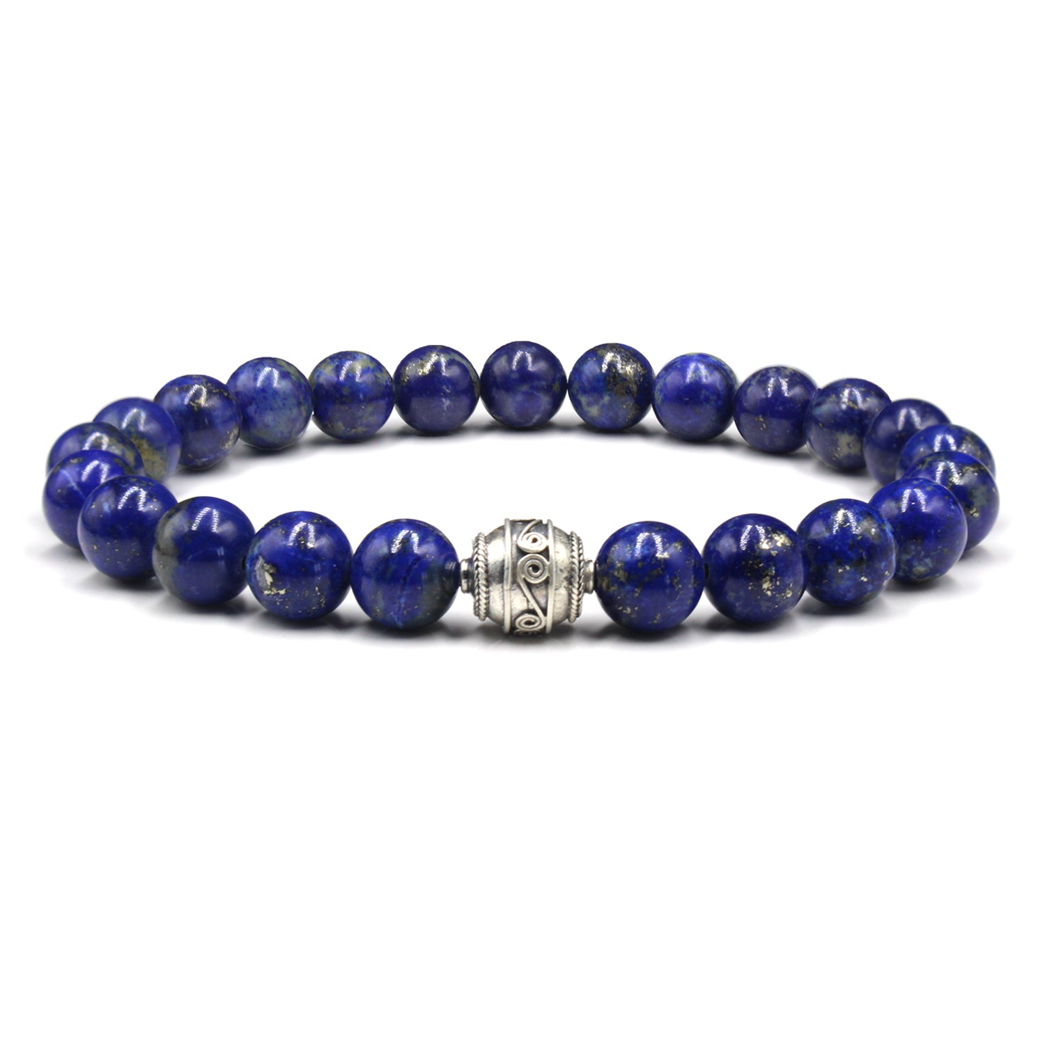 Dieses Armband besteht aus 8 mm großen Lapislazuli-Perlen, die mit einer Bali-Perle aus Sterlingsilber akzentuiert sind. Wir verwenden ein elastisches Silikonband für höchste Festigkeit. Wählen Sie Ihre Handgelenkgröße aus dem Dropdown-Menü. Ihr Armband wird in einem Leinenbeutel geliefert.