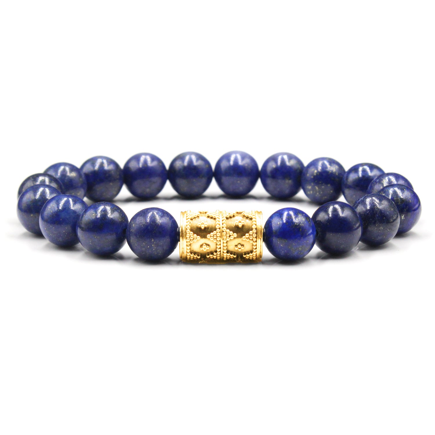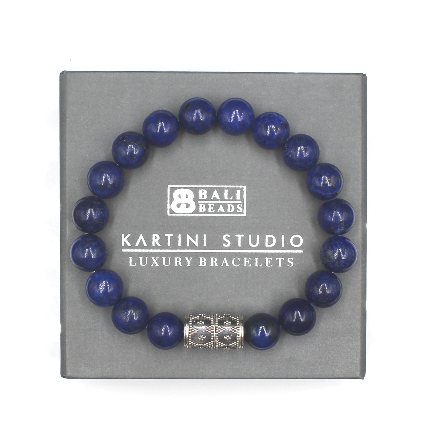 Dieses Armband besteht aus 10 mm großen Lapislazuli-Steinperlen, akzentuiert mit handgefertigten Säulenperlen aus Sterlingsilber.
