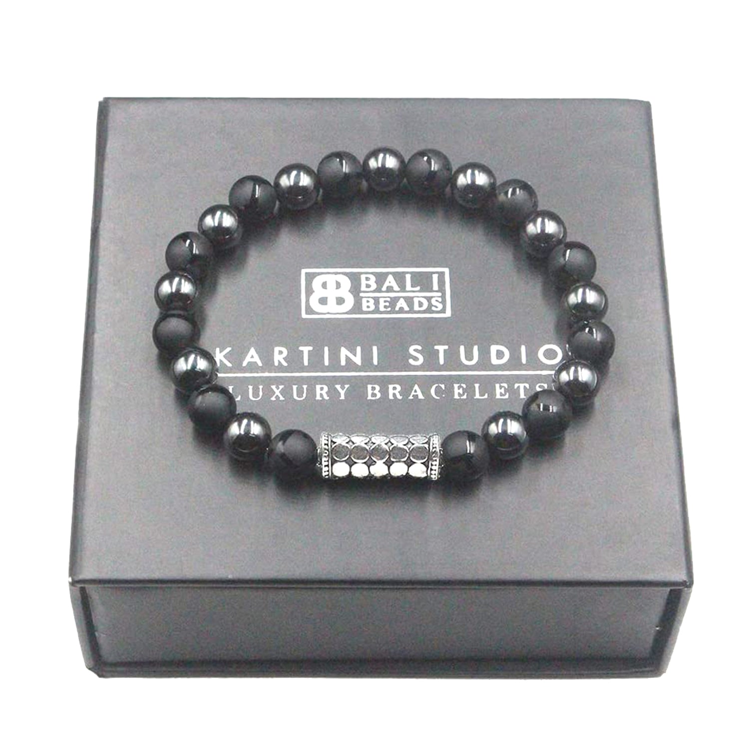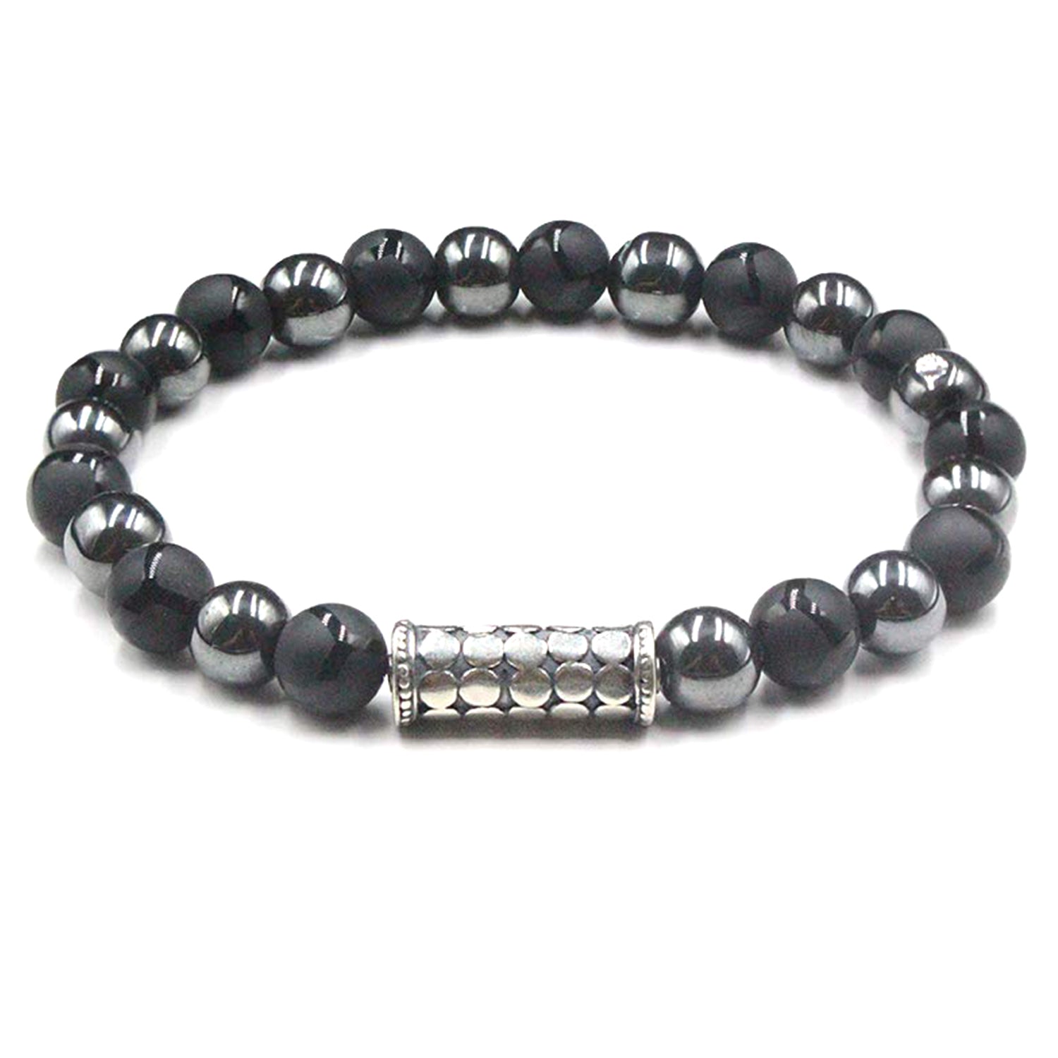 Unsere Armbänder sind auf einer transparenten Hochspannungsschnur auf Silikonbasis befestigt, die für überragende Festigkeit und Haltbarkeit sorgt und jahrelang hält. Dieses Armband aus schwarzem Onyx und Hämatit wird in einer Geschenkbox geliefert.