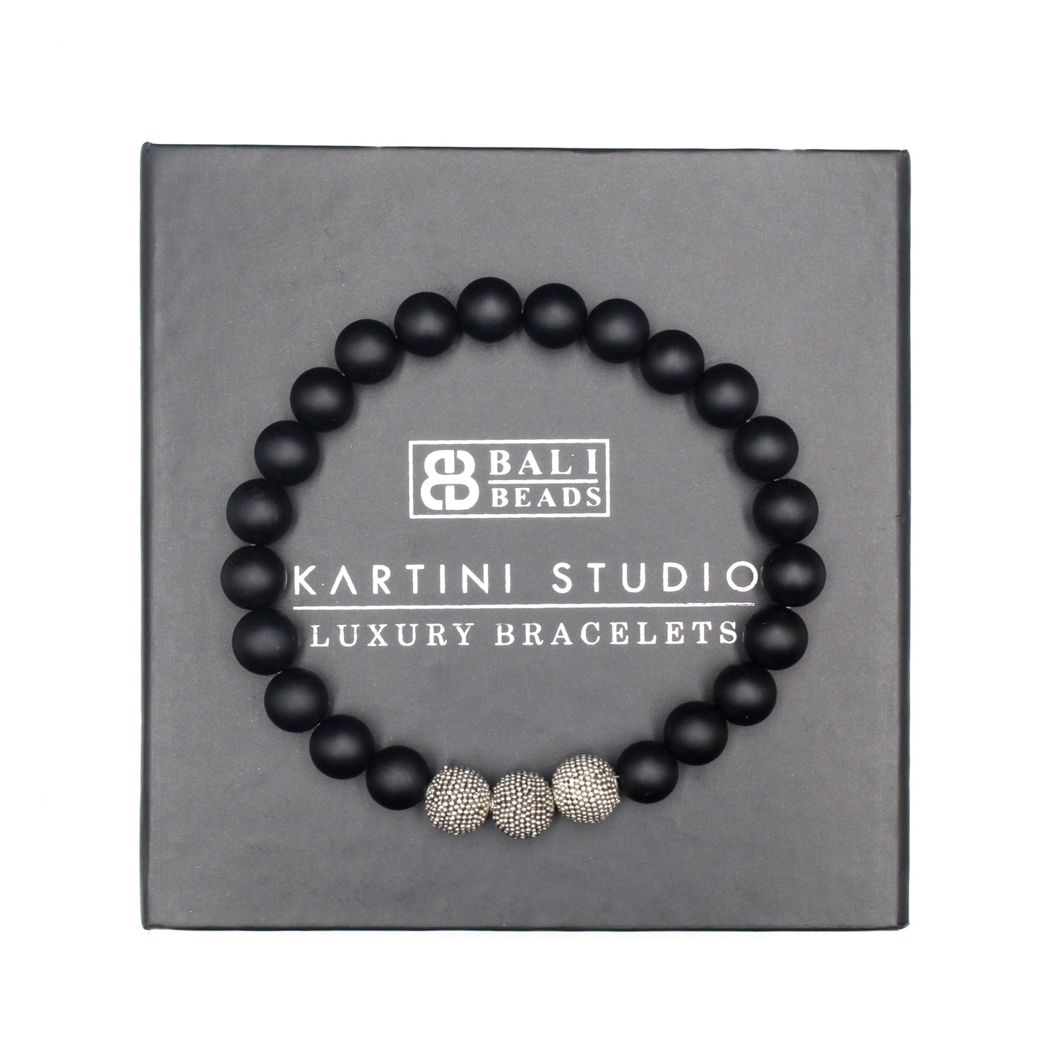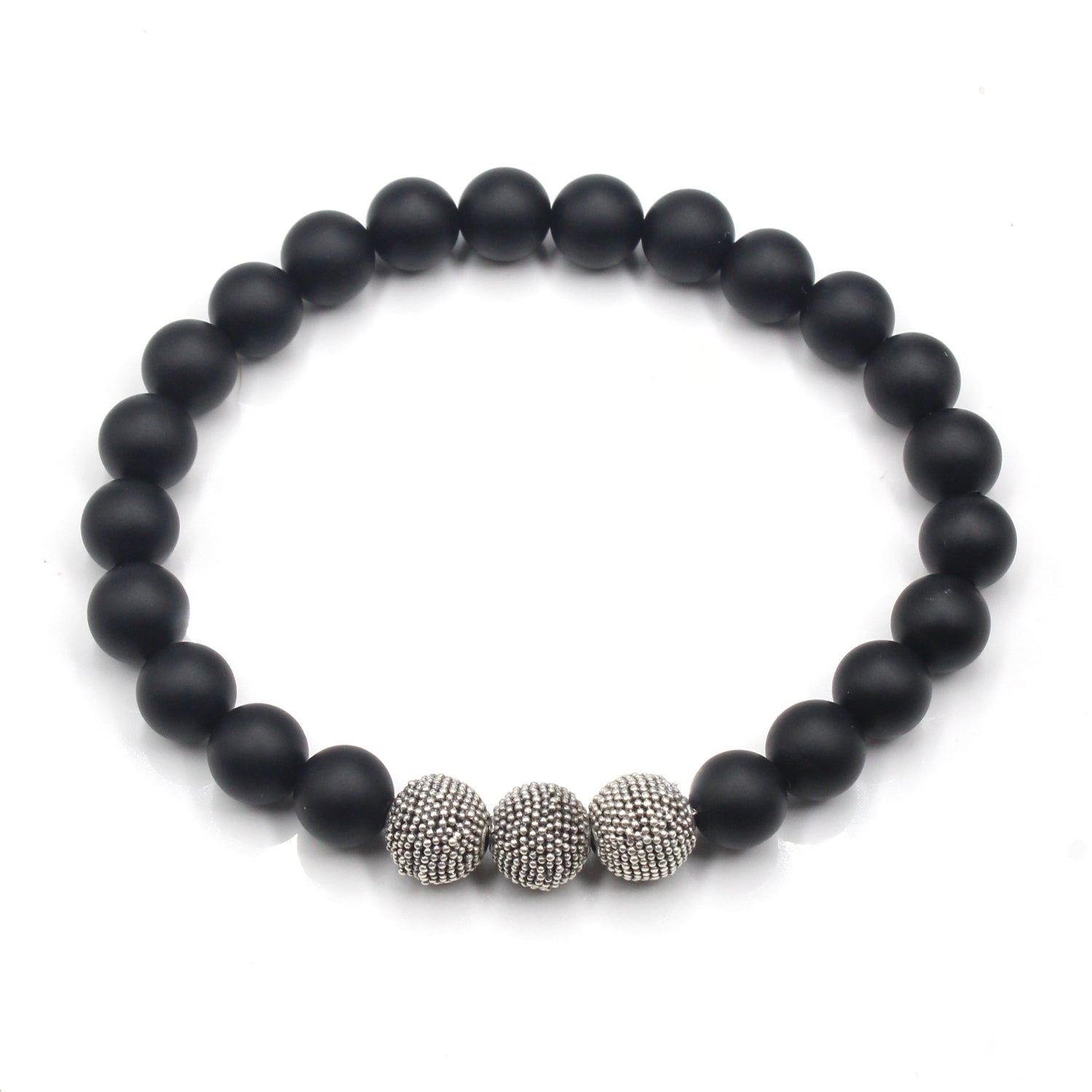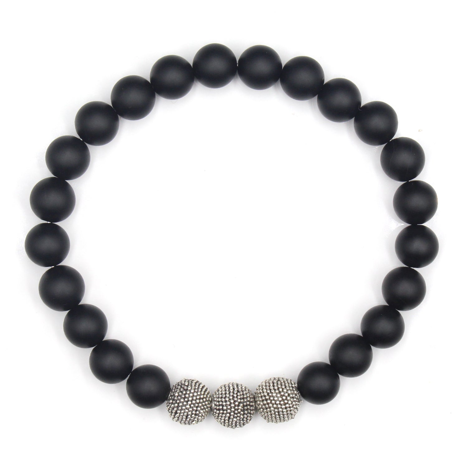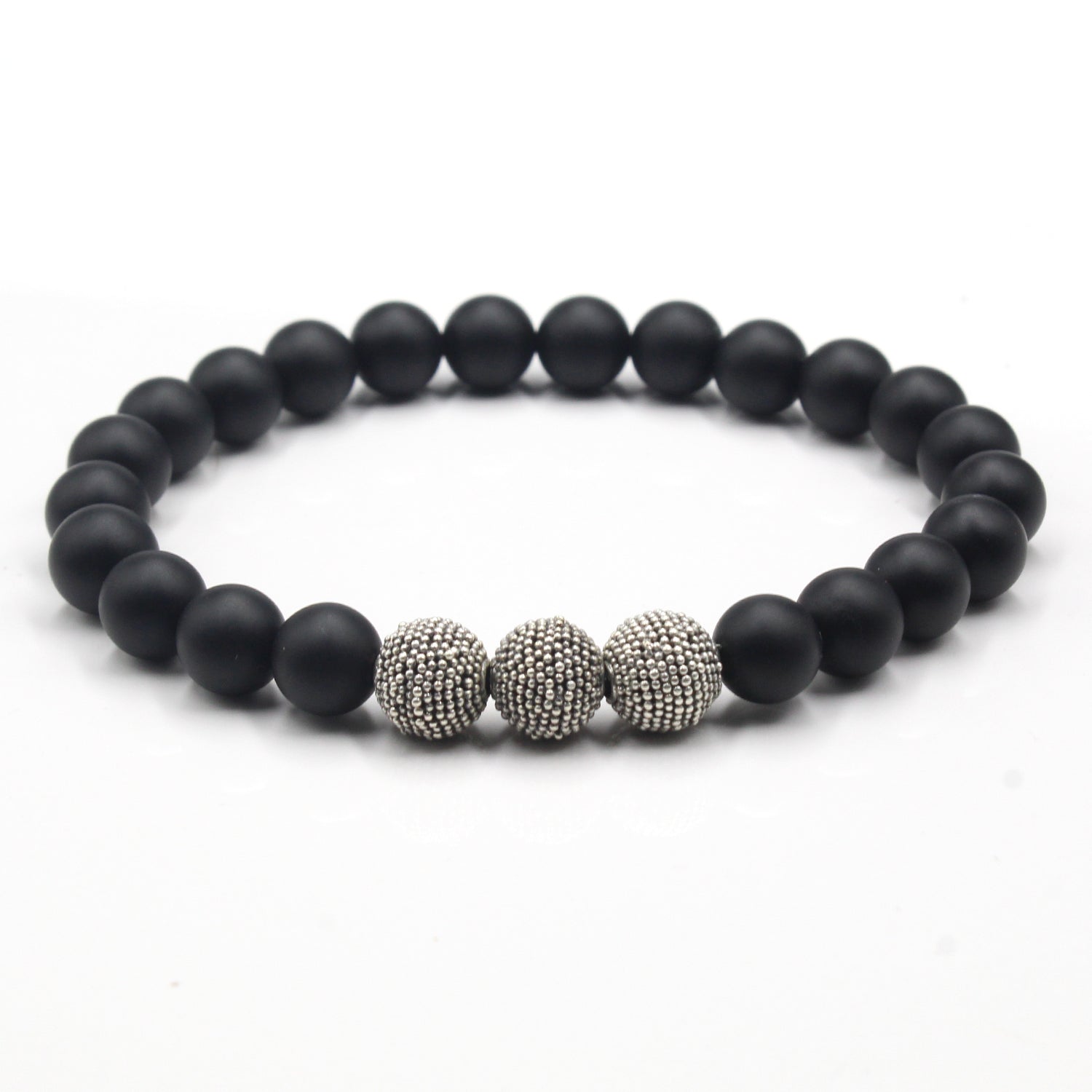 Dieses Armband besteht aus 8 mm großen schwarzen Onyxperlen, akzentuiert mit drei handgefertigten „gehämmerten Punkten“-Perlen aus Sterlingsilber.