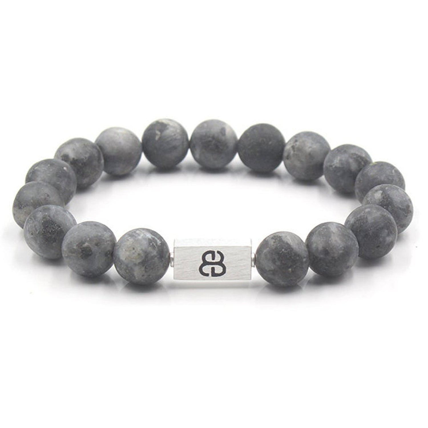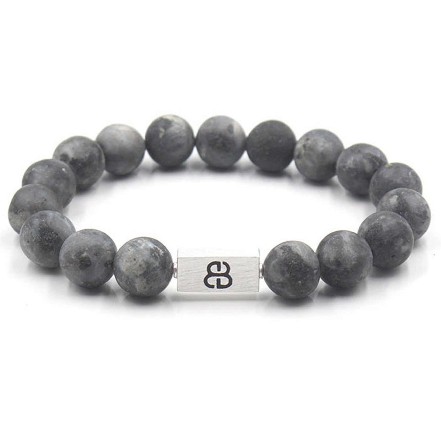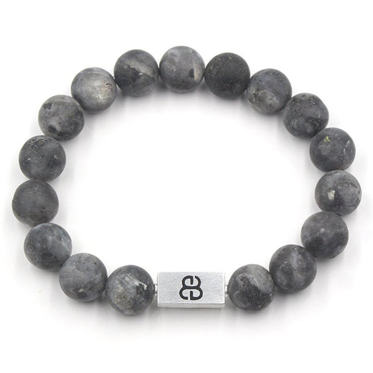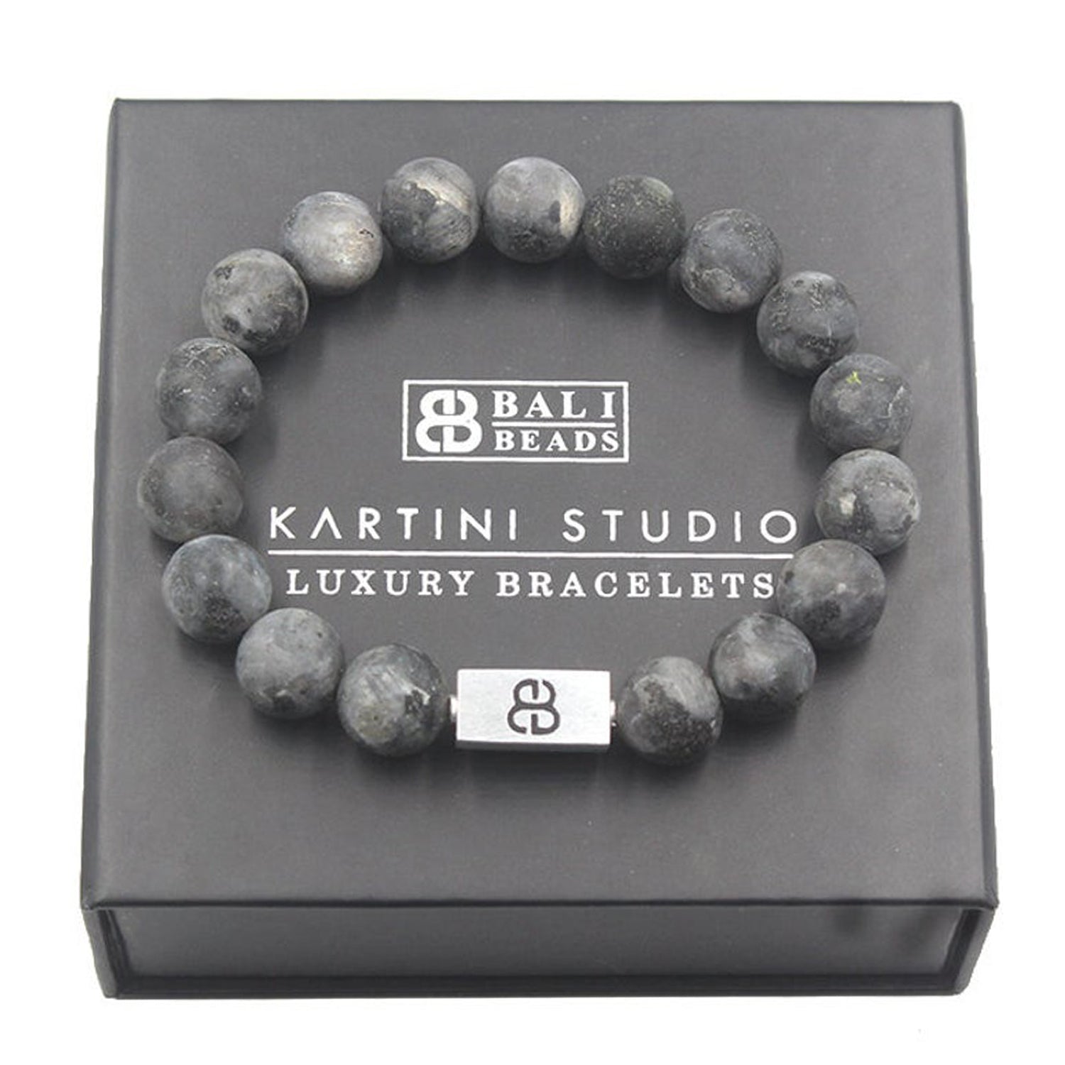 Dieses Armband besteht aus matten 12 mm großen Labradoritperlen, akzentuiert mit einer 16 mm x 8 mm großen Perle mit dem „Bali Beads“-Logo aus gebürstetem Sterlingsilber.