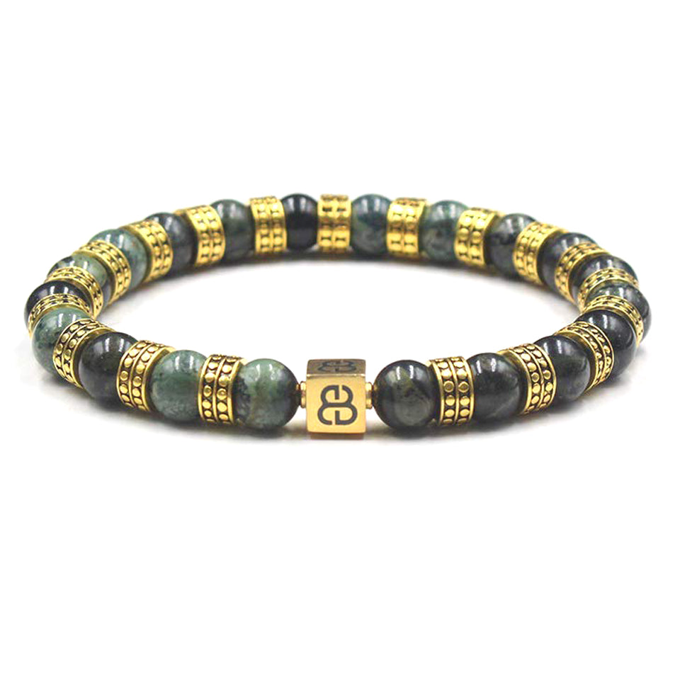 Dieses Armband verfügt über 8mm Nephrit Jade Perlen akzentuiert mit handgefertigte „Dots“-Perlen aus massivem Sterlingsilber mit 22 Karat Goldplattierung und eine 8 mm x 8 mm große „Bali Beads“-Logoperle aus Sterlingsilber mit 22 Karat Goldplattierung .