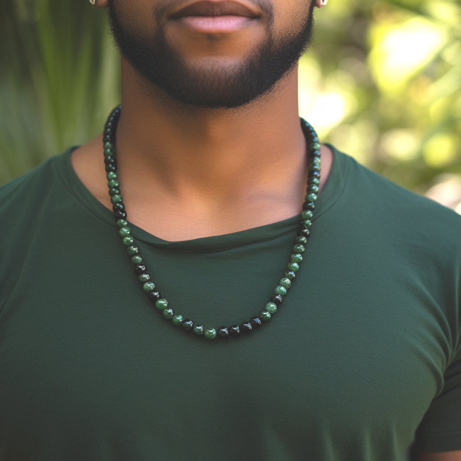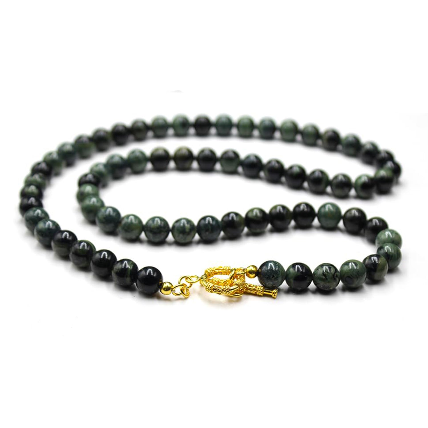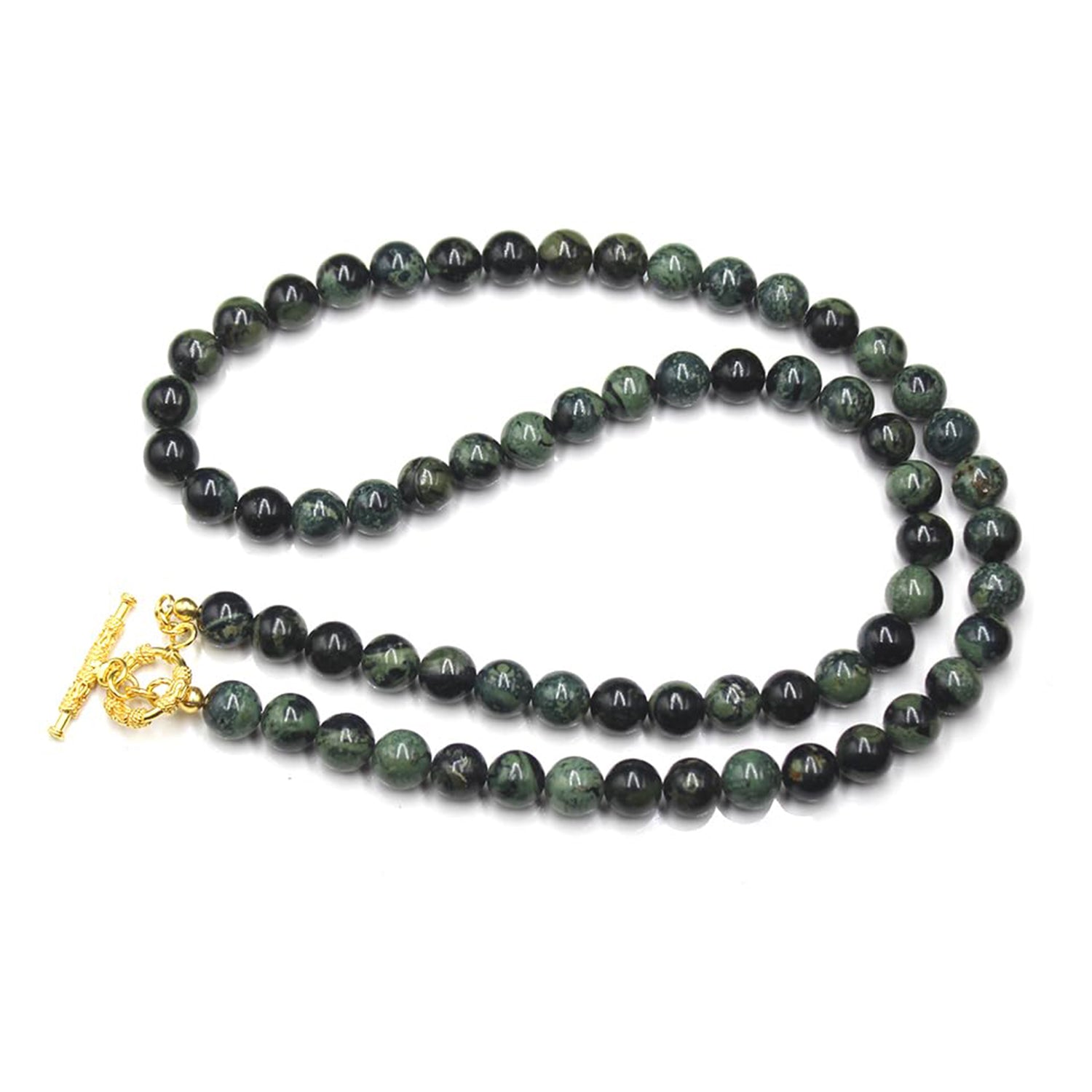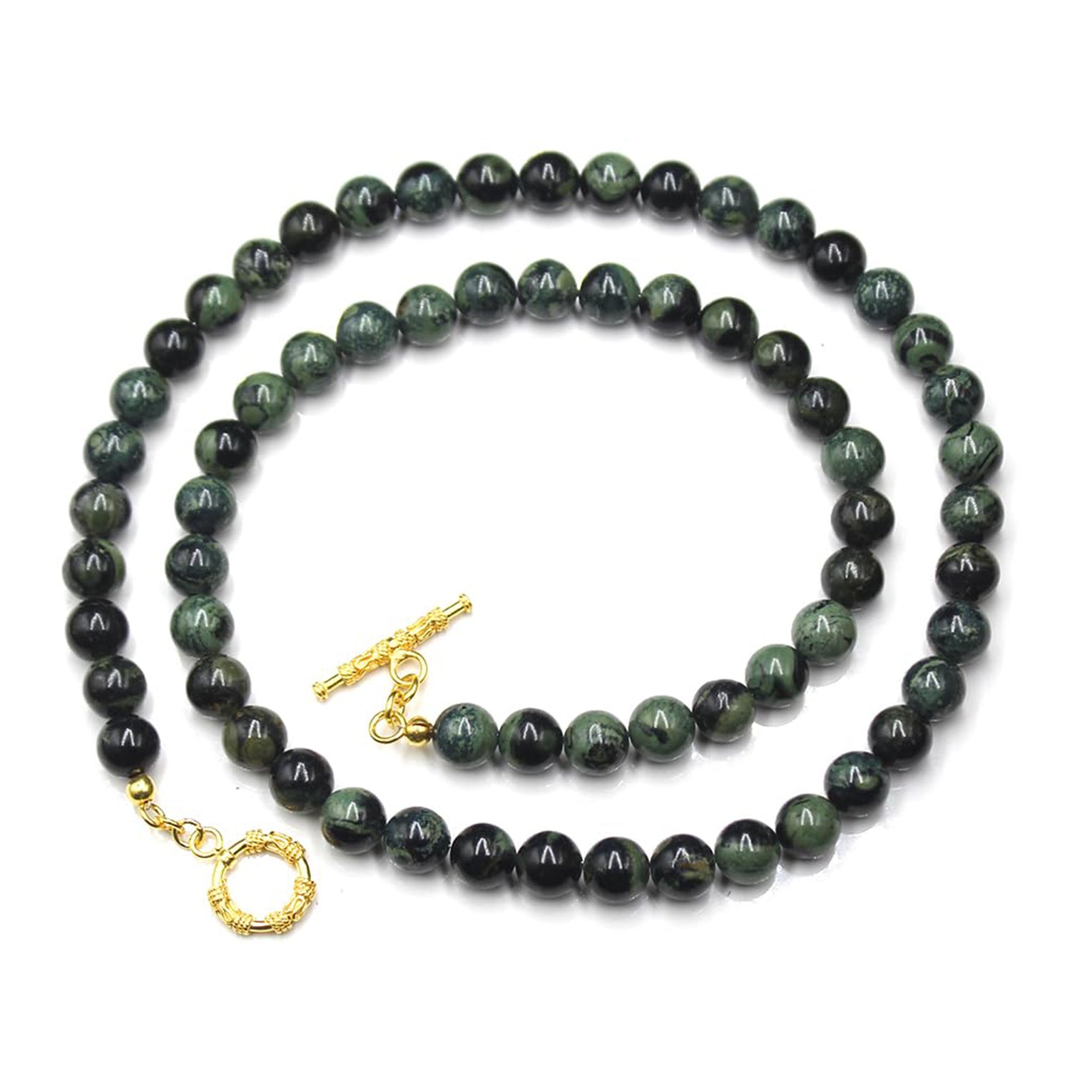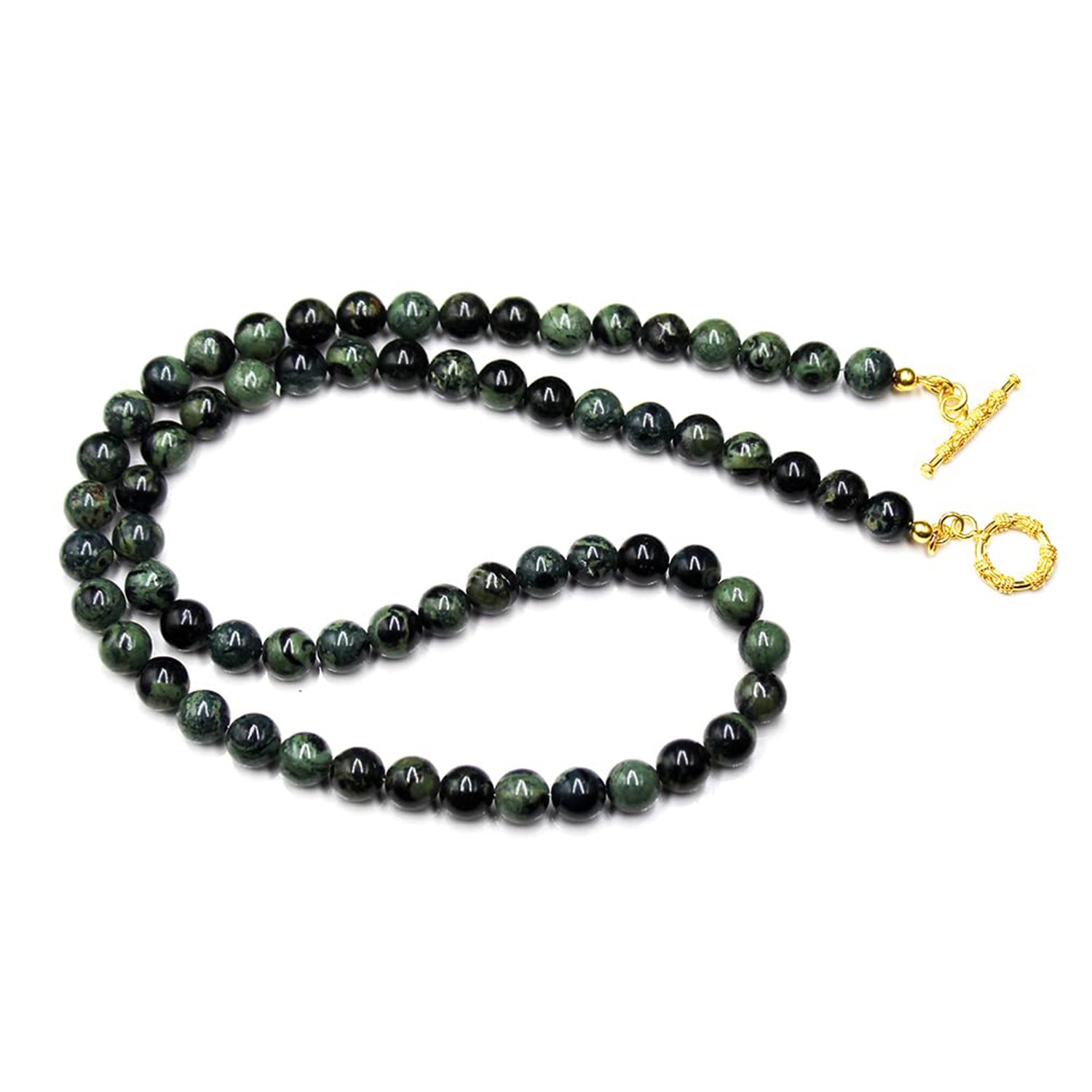 Diese Halskette besteht aus 8 mm großen dunkelgrünen Nephrit-Jadeperlen, die auf Edelstahldraht aufgefädelt sind. Sie wird mit einem verzierten Bali-Knebelverschluss aus Sterlingsilber mit 22 Karat Goldauflage befestigt. Wählen Sie Ihre Halskettenlänge aus dem Dropdown-Menü.