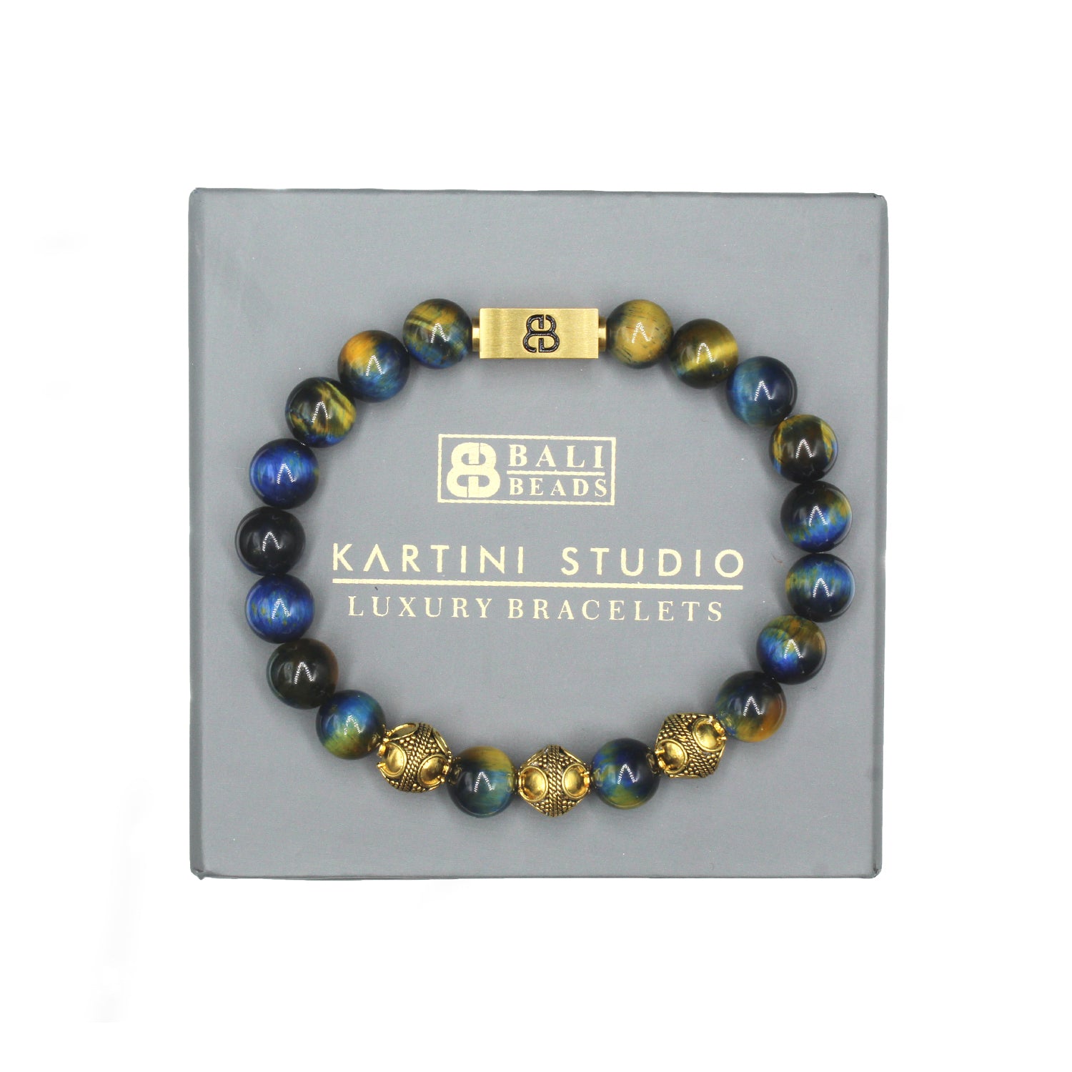 - This bracelet features 8mm mixed tiger's eye stone beads accented with three 8mm 22 karat gold plated sterling silver Bali beads, and a 15mm x 8mm brushed stainless steel “Bali beads” logo bead.