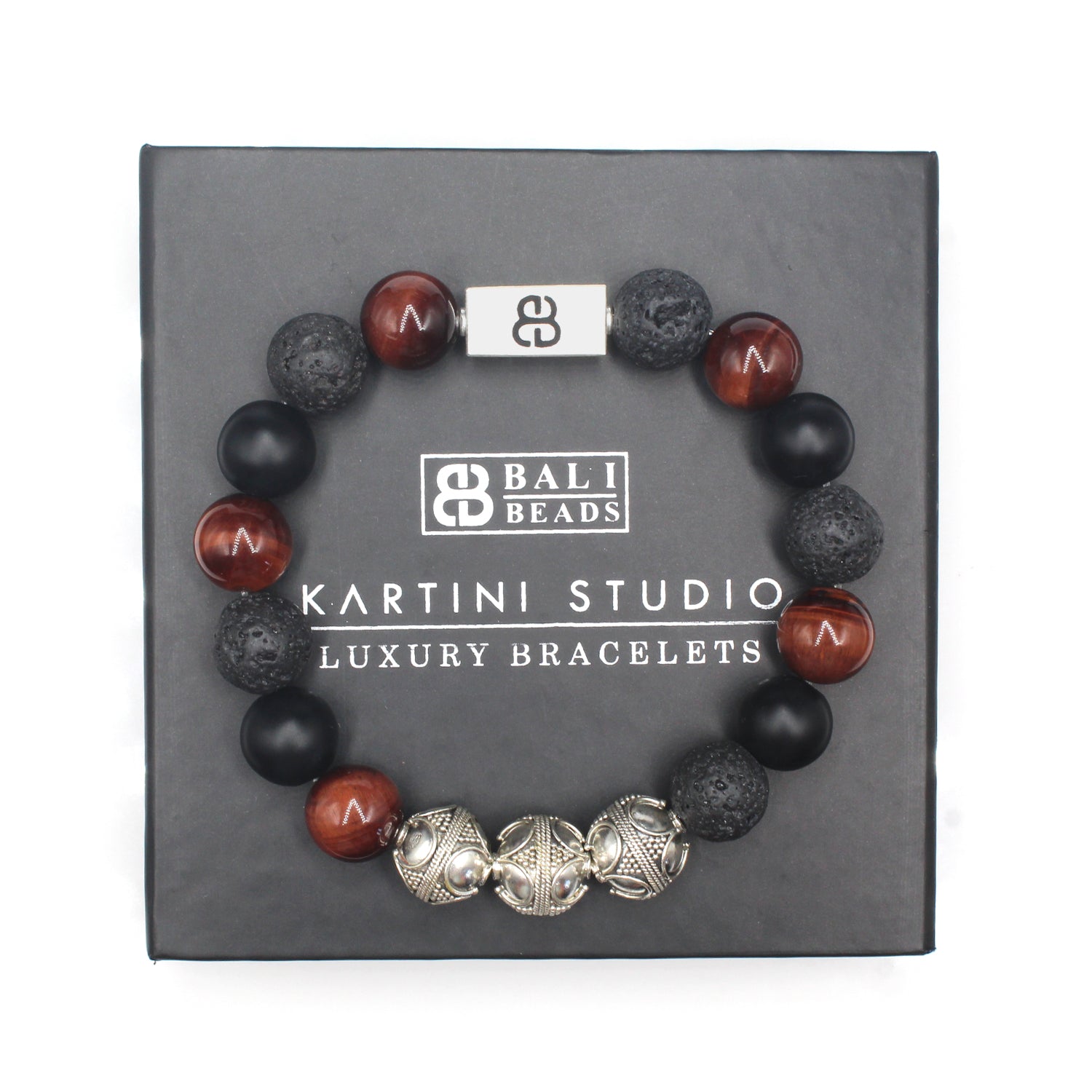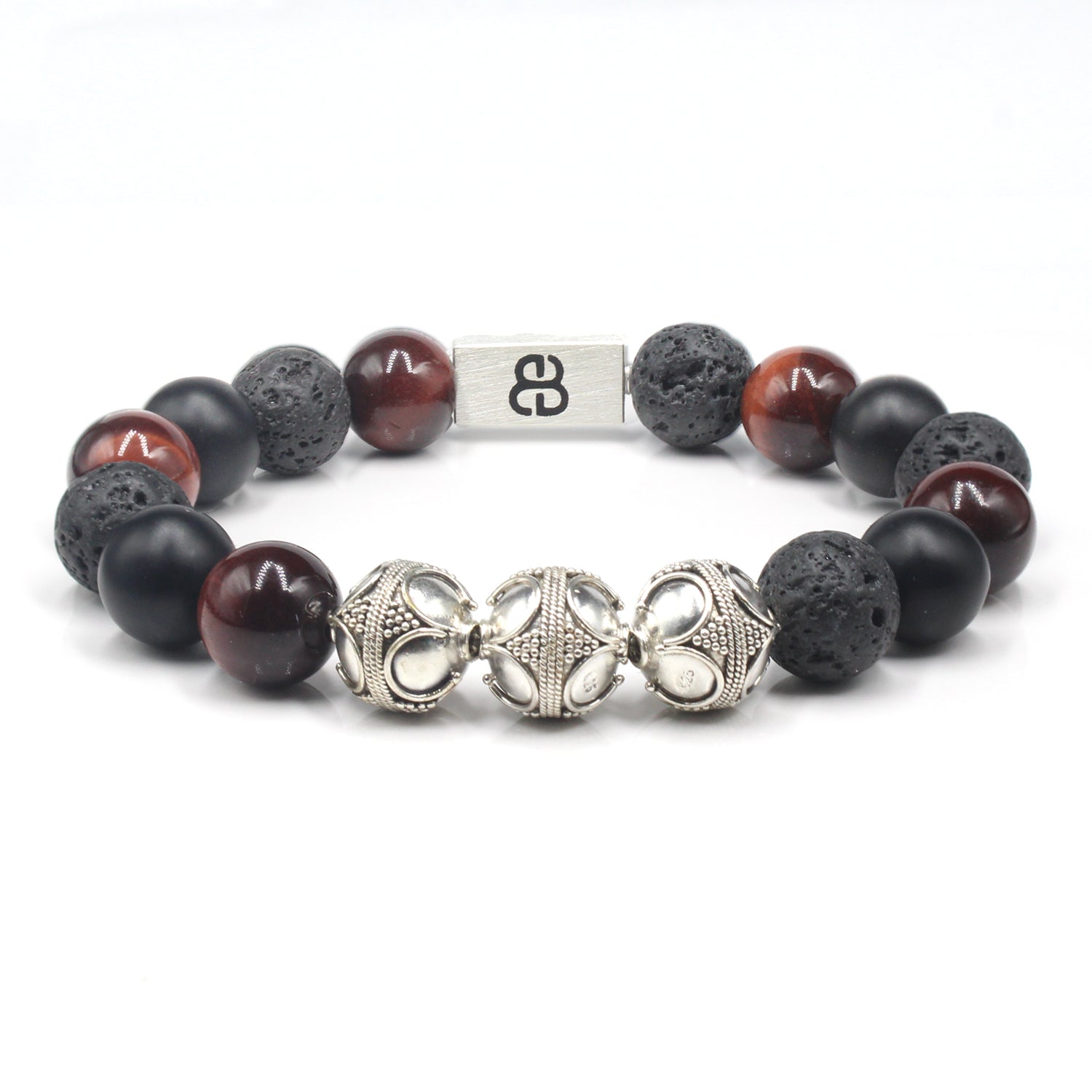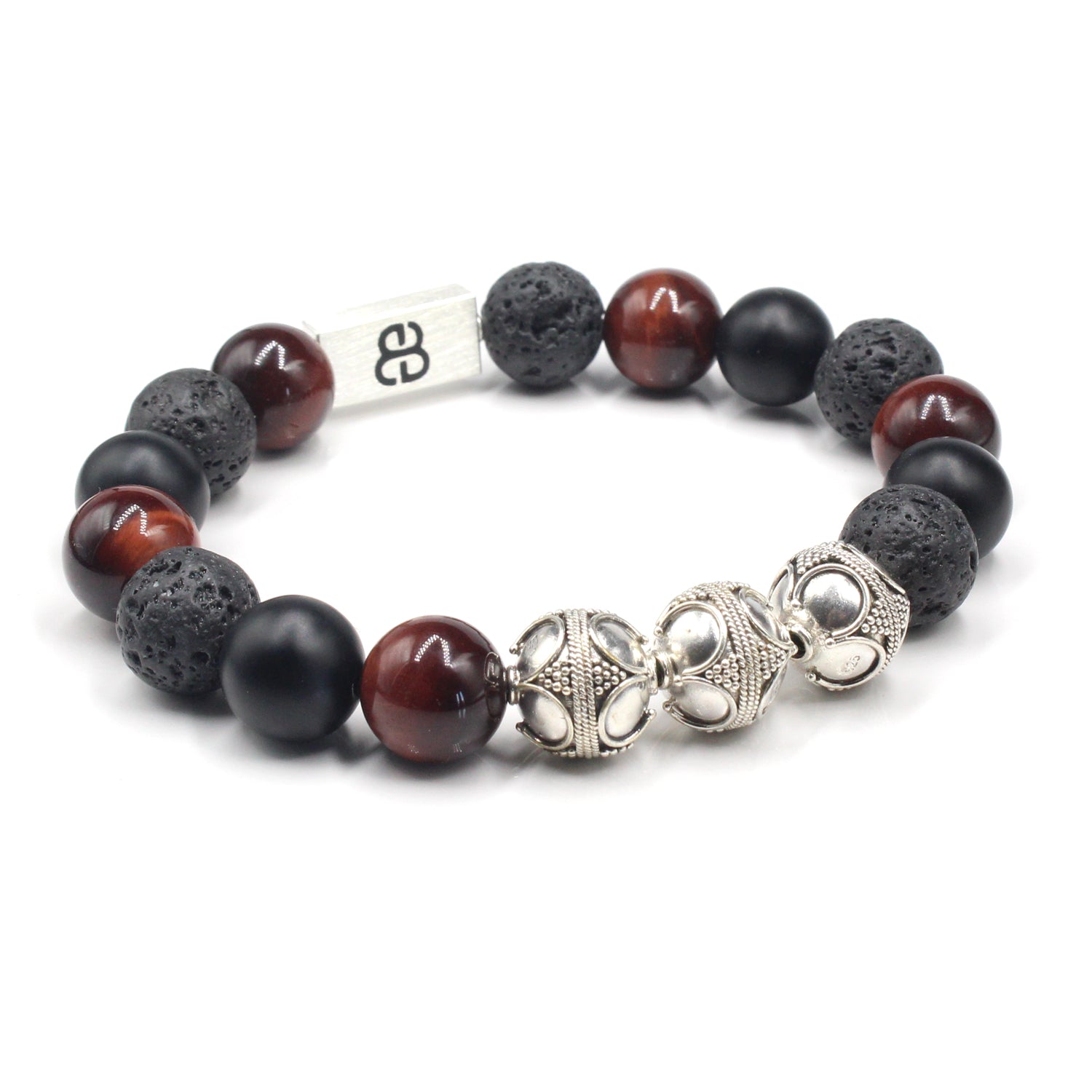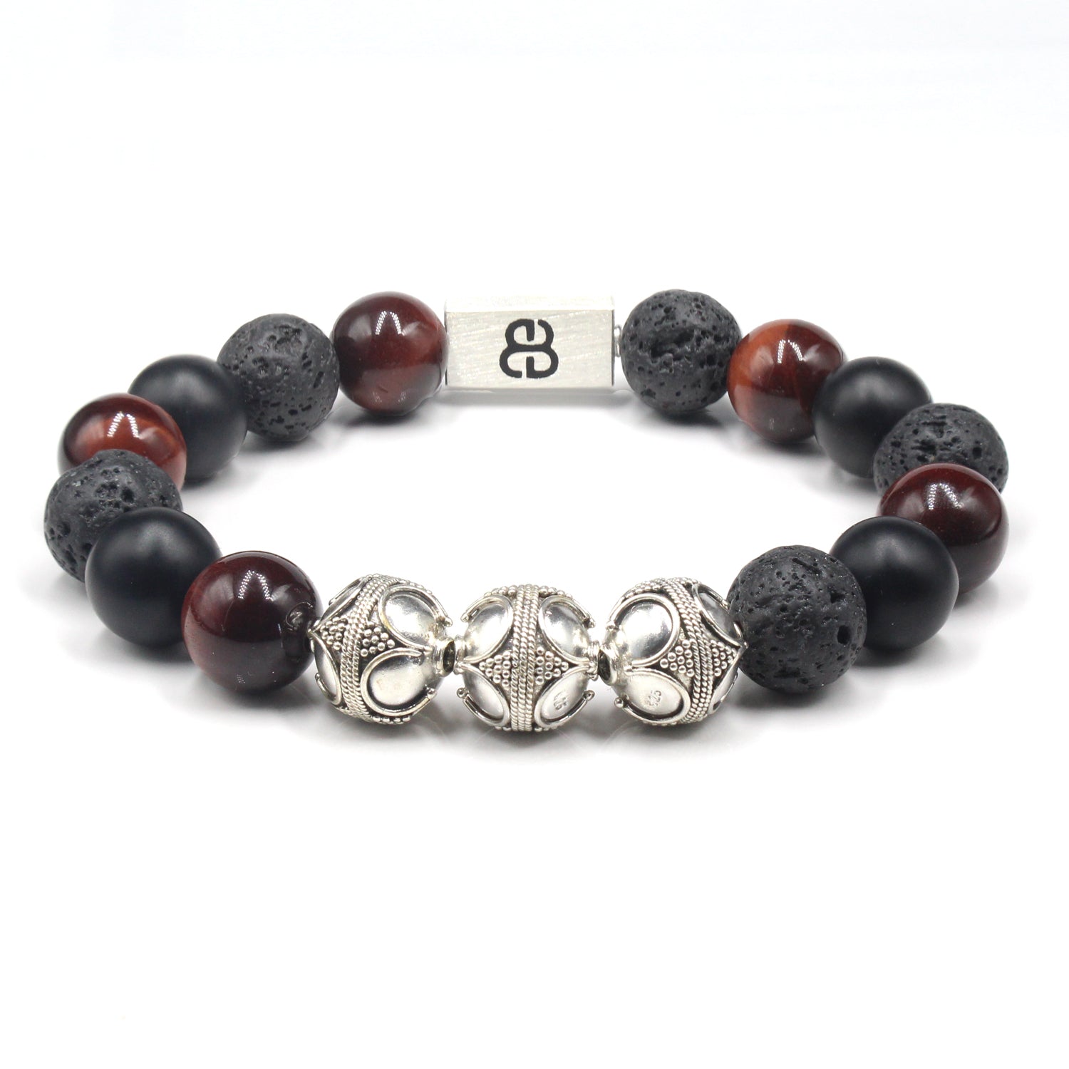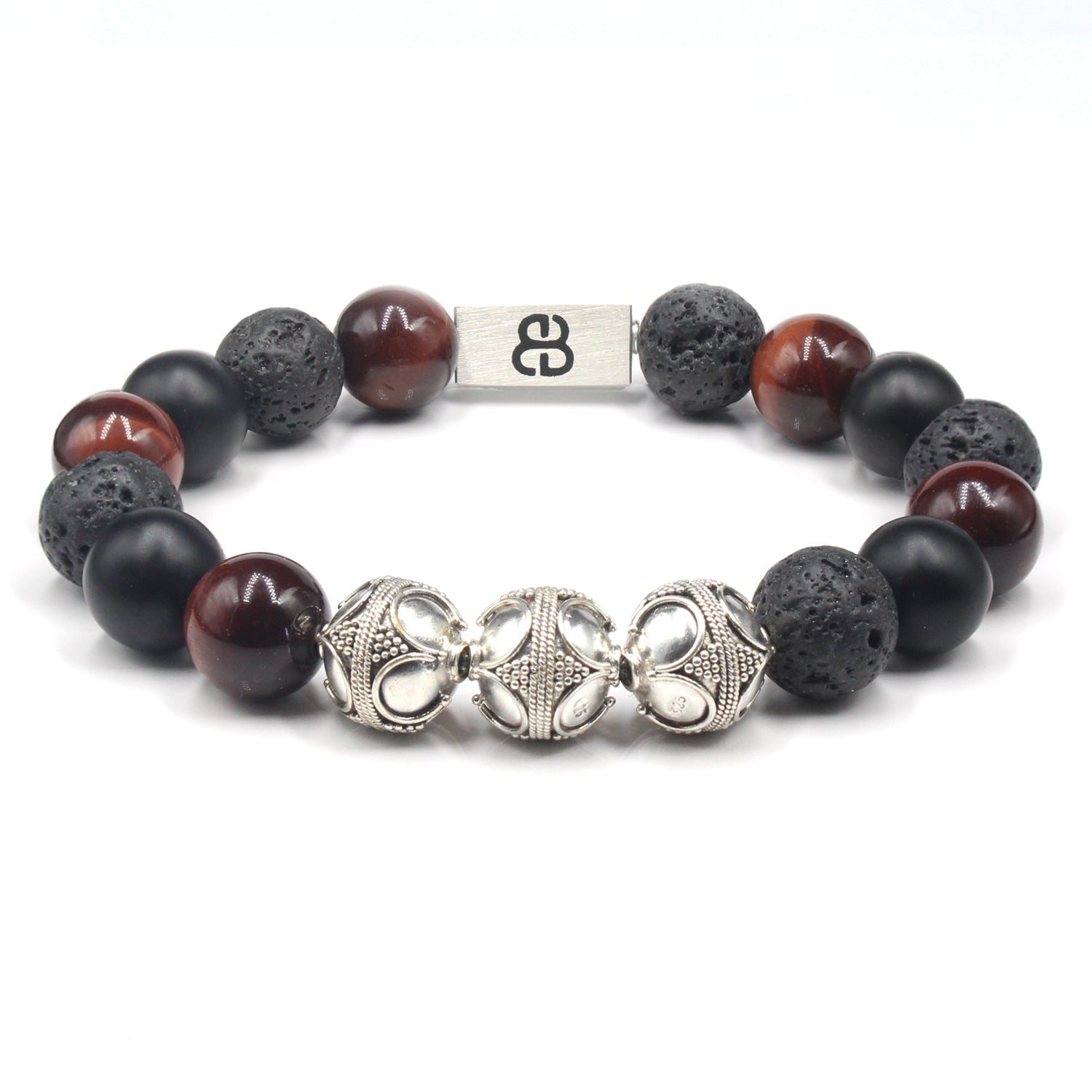 Dieses Premium-Armband für Herren besteht aus 12 mm großen Perlen aus rotem Tigerauge, 12 mm großen Perlen aus mattschwarzem Onyx und 12 mm großen Perlen aus vulkanischem Lavastein, akzentuiert mit drei handgefertigten 12 mm großen Bali-Perlen aus Sterlingsilber und einer 16 mm x 8 mm x 6 mm großen gebürsteten „Bali Beads“-Logoperle aus Sterlingsilber. Wir verwenden ein Silikon-Stretchband für zusätzliche Festigkeit und Belastbarkeit. Wählen Sie Ihre Handgelenkgröße aus dem Dropdown-Menü. Wir fertigen Ihr Armband passend an. Ihr Armband wird in einer speziellen Geschenkbox geliefert.