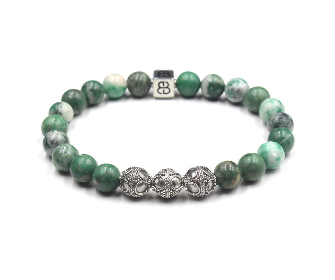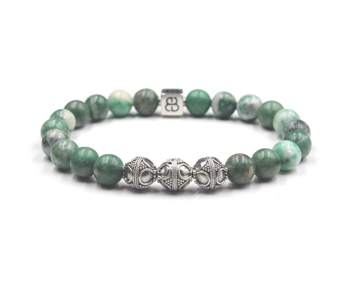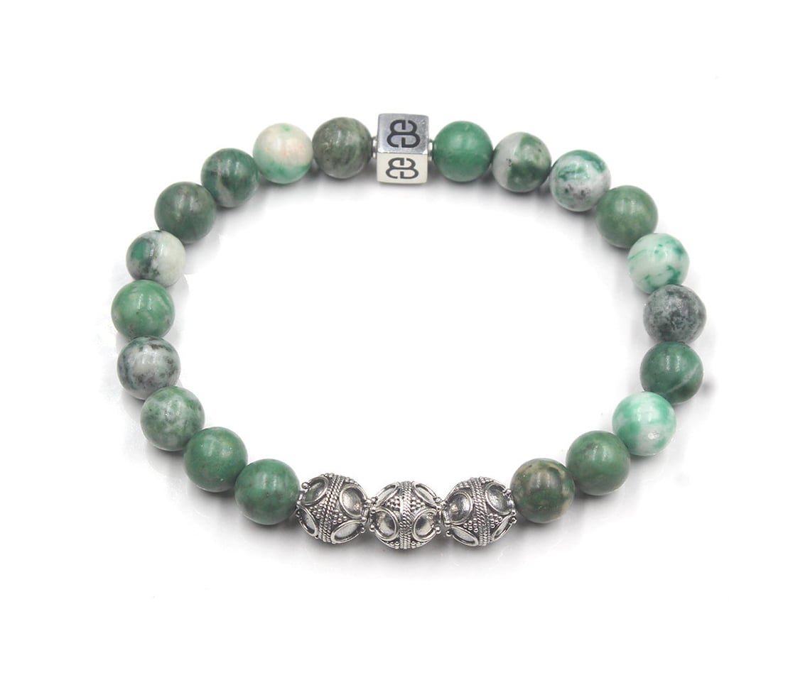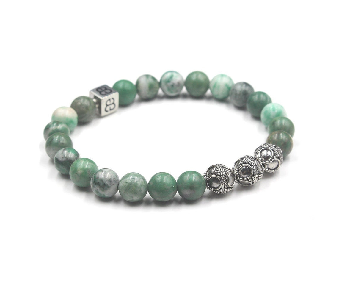 Dieses Armband besteht aus 8 mm großen Perlen aus natürlicher Qinghai-Jade, akzentuiert mit drei 8 mm großen Bali-Perlen aus Sterlingsilber und einer einzelnen 8 mm x 8 mm großen Perle aus Sterlingsilber mit dem „Bali Beads“-Logo.