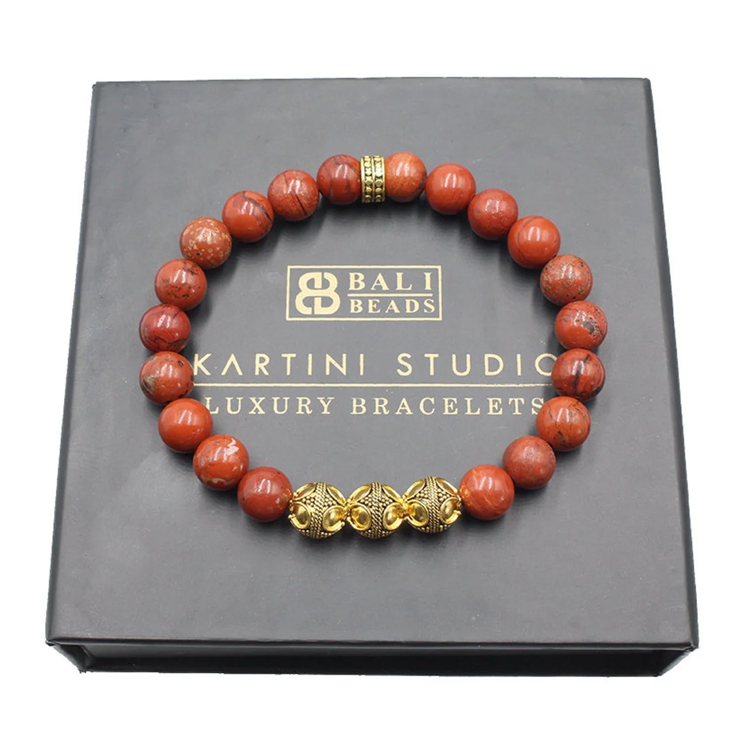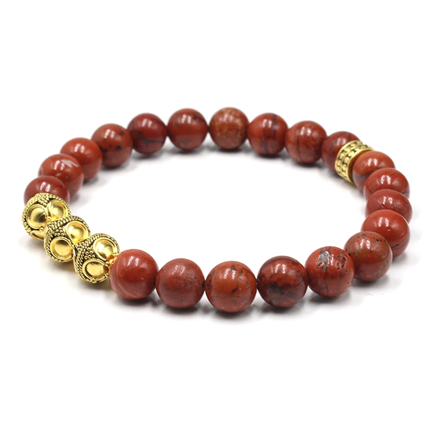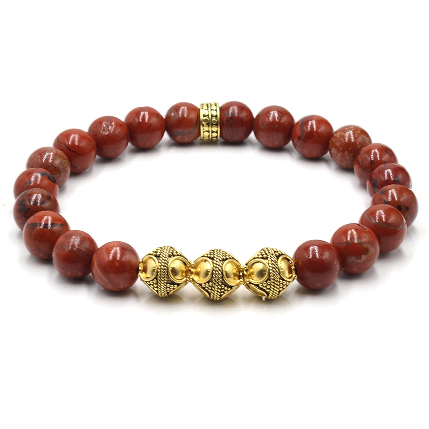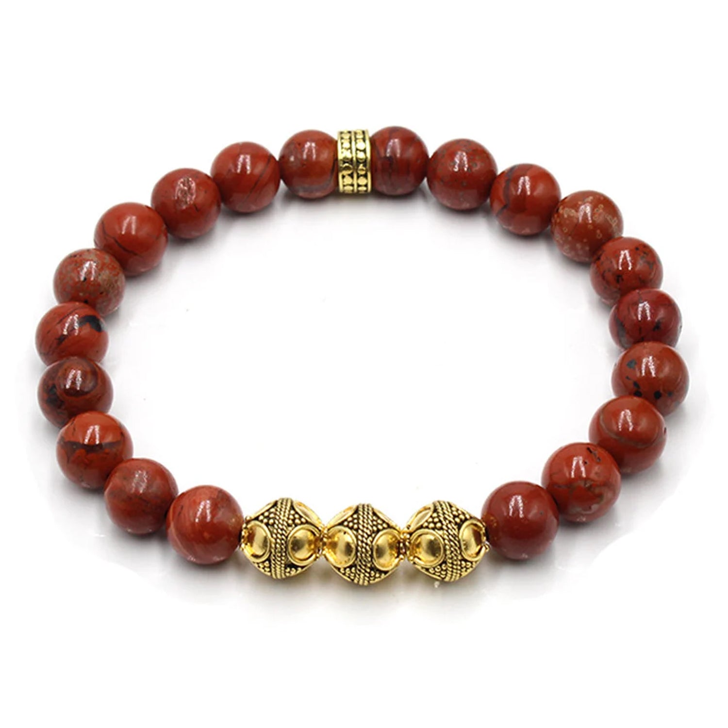 Dieses Armband besteht aus 8 mm großen Perlen aus rotem Jaspis, akzentuiert mit drei 8 mm großen, 22 Karat vergoldeten Bali-Perlen aus Sterlingsilber und einer 8 mm großen, 22 Karat vergoldeten, gehämmerten „Punkt“-Perle aus Sterlingsilber.