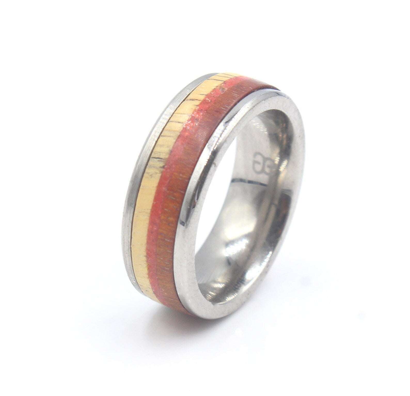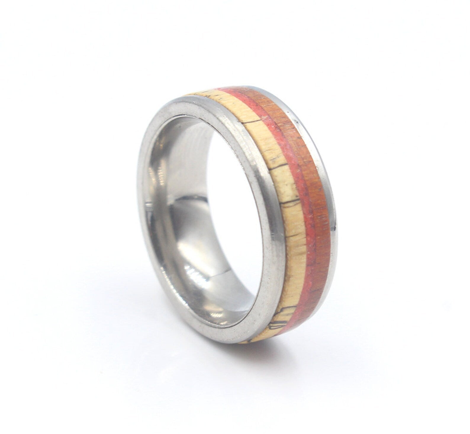 Dieser handgefertigte Herrenring aus Titan mit dreifacher Einlage ist unser eigenes, einzigartiges Design.