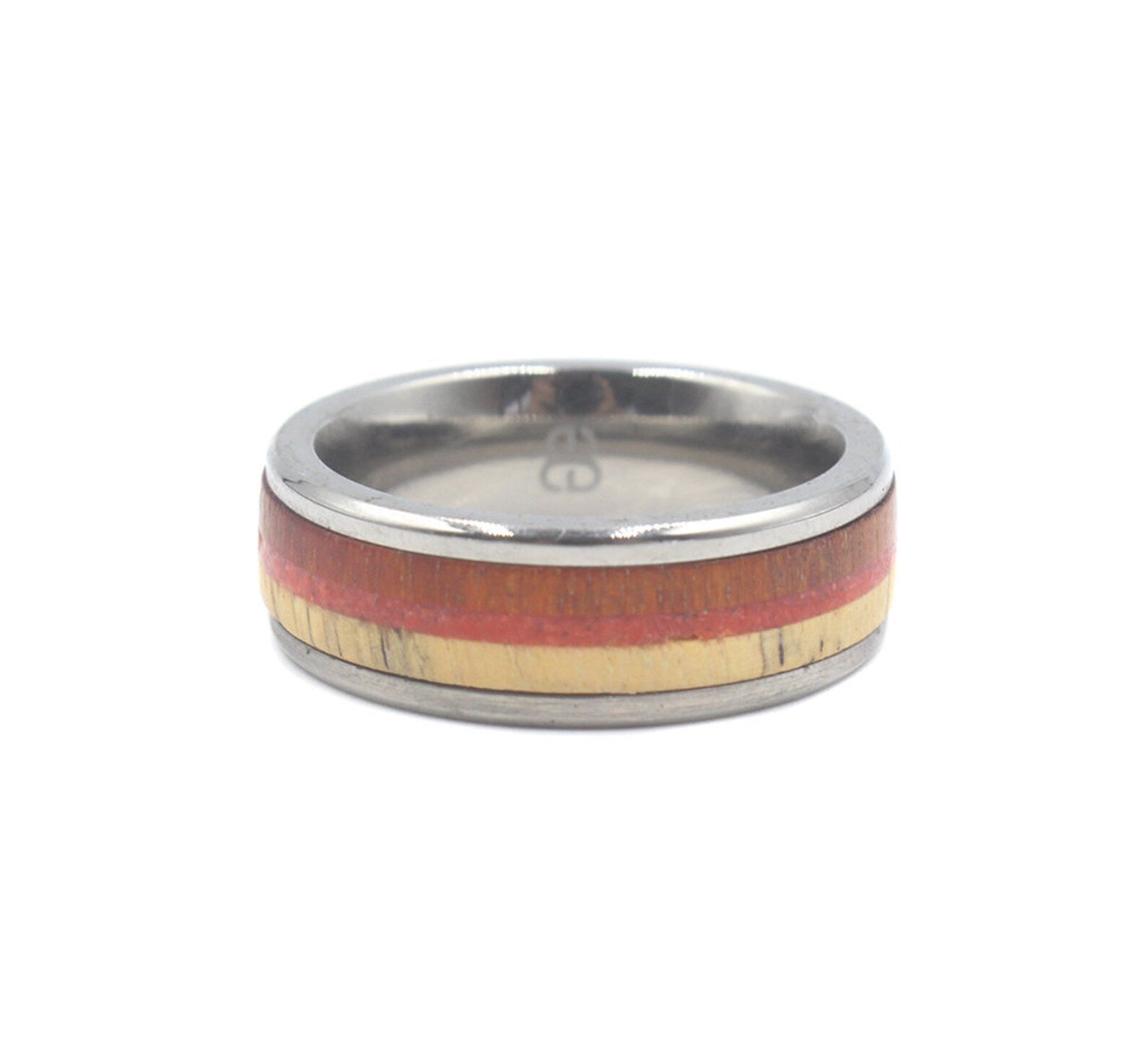 Es besteht aus einem Ring aus schwarzem Rosenholz, gespaltenem Tamarindenholz und rotem Jaspisholz.