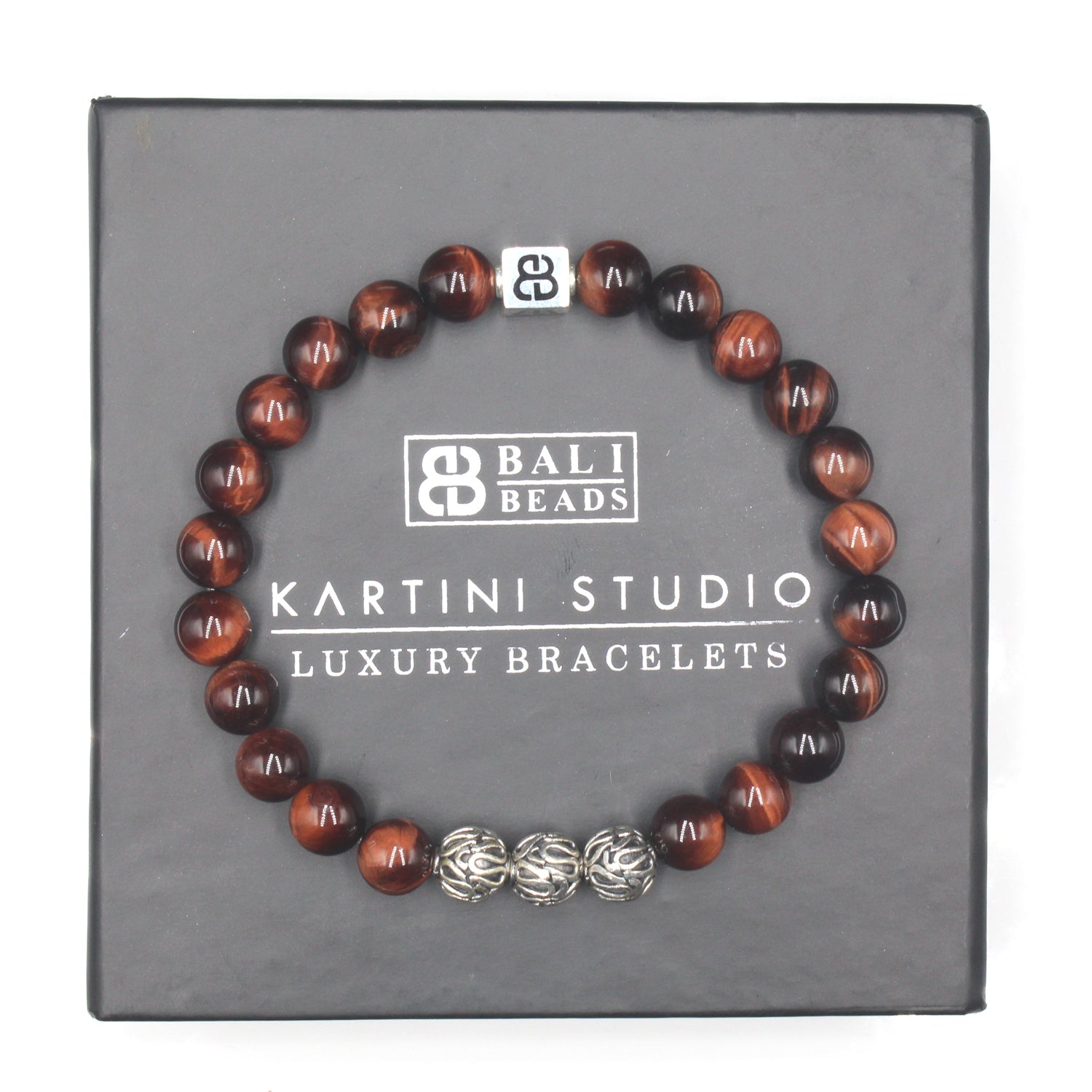 Dieses Armband besteht aus 8 mm großen Perlen aus rotem Tigerauge-Edelstein, akzentuiert mit drei handgemachten 8 mm großen oxidierten Bali-Perlen aus Sterlingsilber und enthält unsere exklusive 8 mm x 8 mm große „Bali Beads“-Logoperle.