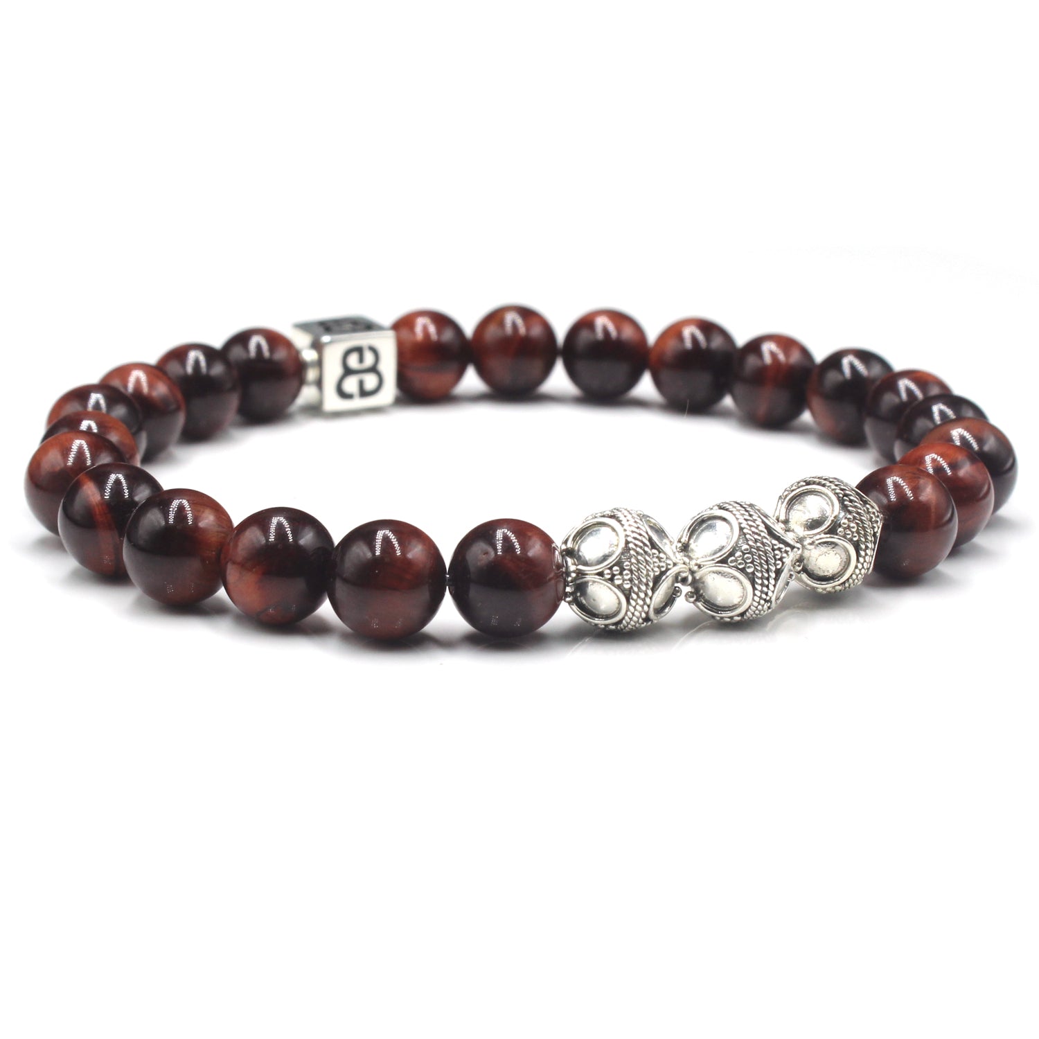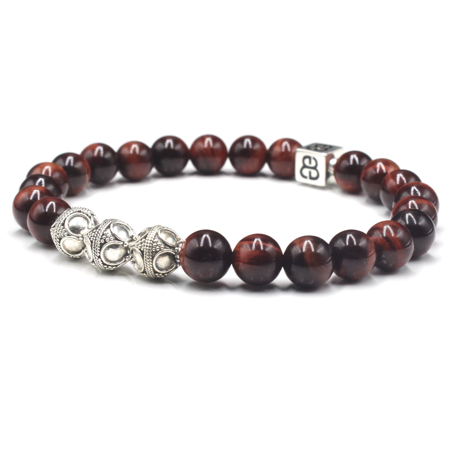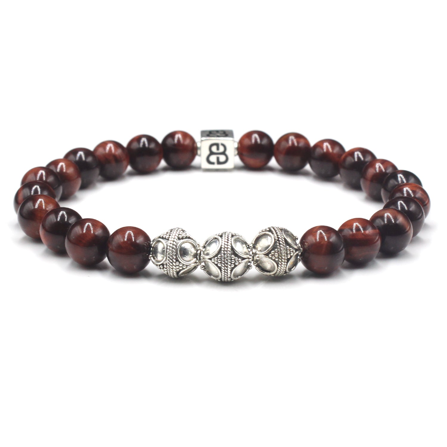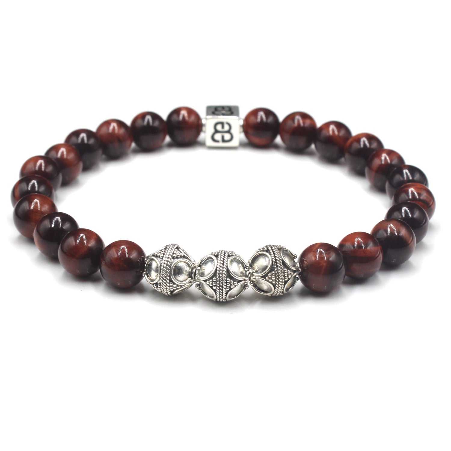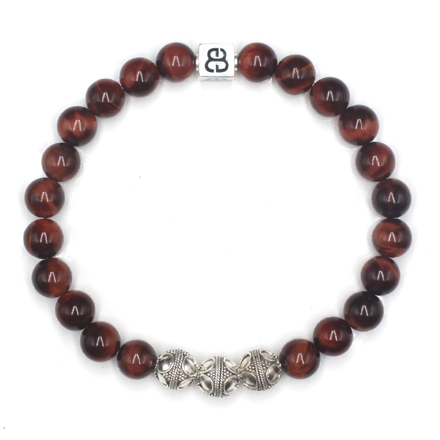 Dieses elastische Armband für Herren besteht aus 8 mm großen Perlen aus rotem Tigerauge-Edelstein, akzentuiert mit drei handgemachten 8 mm großen oxidierten Bali-Perlen aus Sterlingsilber und beinhaltet unsere exklusive 8 mm x 8 mm große „BaliBeads“-Logoperle.