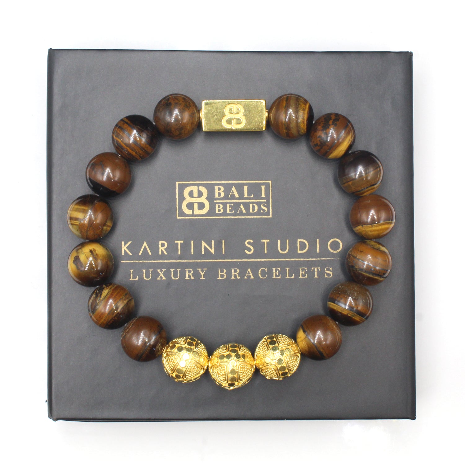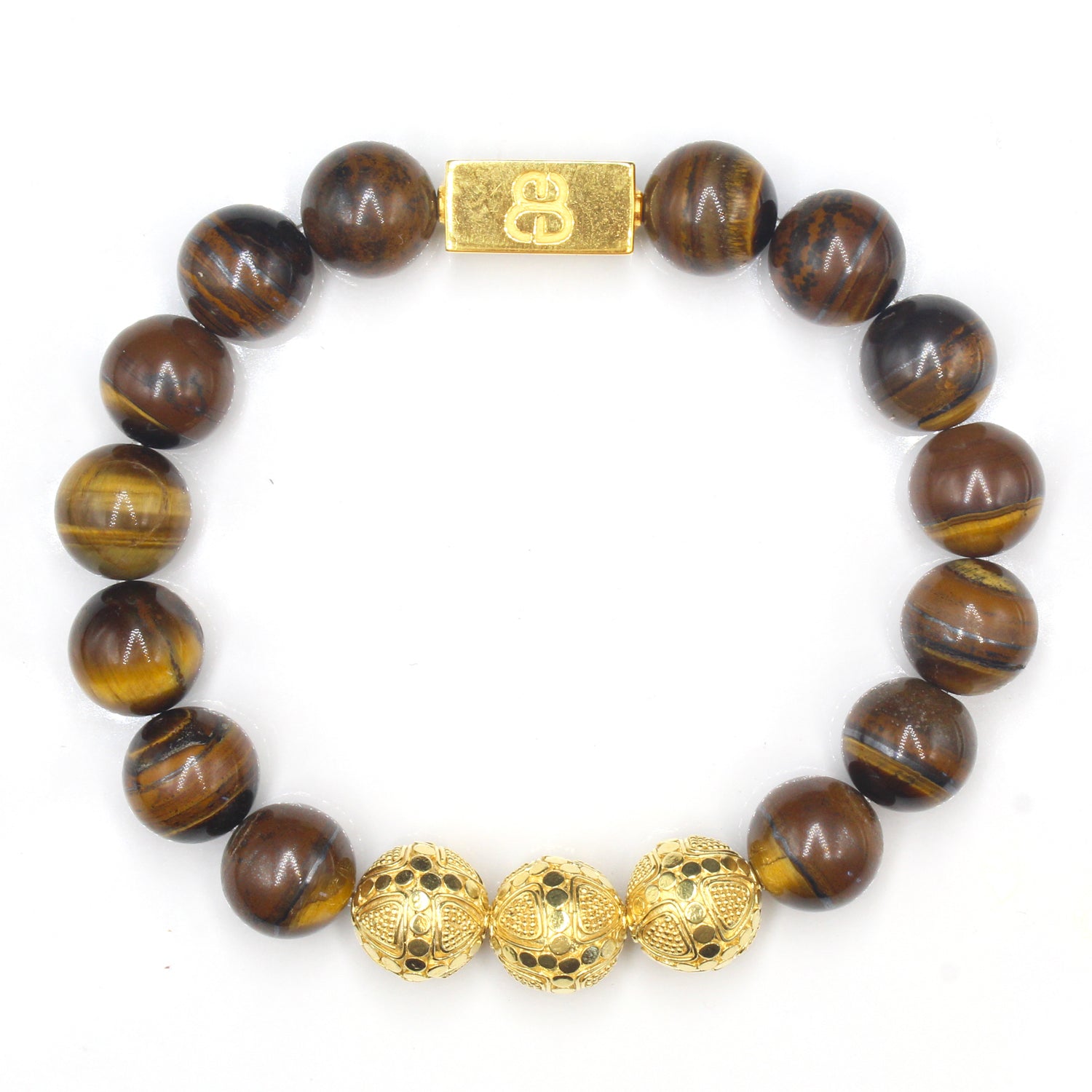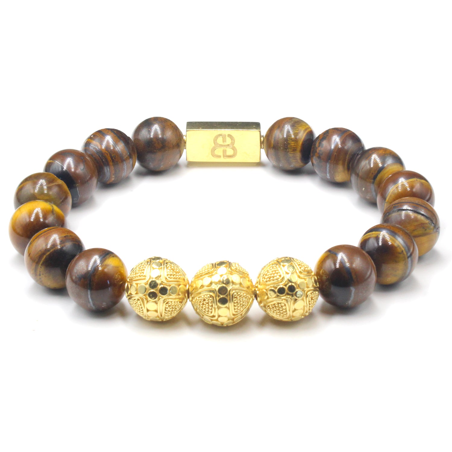 Dieses Armband besteht aus 12 mm großen Tigereisenperlen, akzentuiert mit drei handgefertigten 12 mm großen Bali-Perlen aus Sterlingsilber mit 22 Karat Goldplattierung und einer 16 mm x 8 mm großen Ankerperle mit „Bali Beads“-Logo. Das Gold wird sanft oxidiert, um die vertieften Bereiche abzudunkeln. Wir verwenden ein 1,2 mm dickes Silikon-Stretchband für überragende Festigkeit. Wir fertigen Ihr Armband passend an.