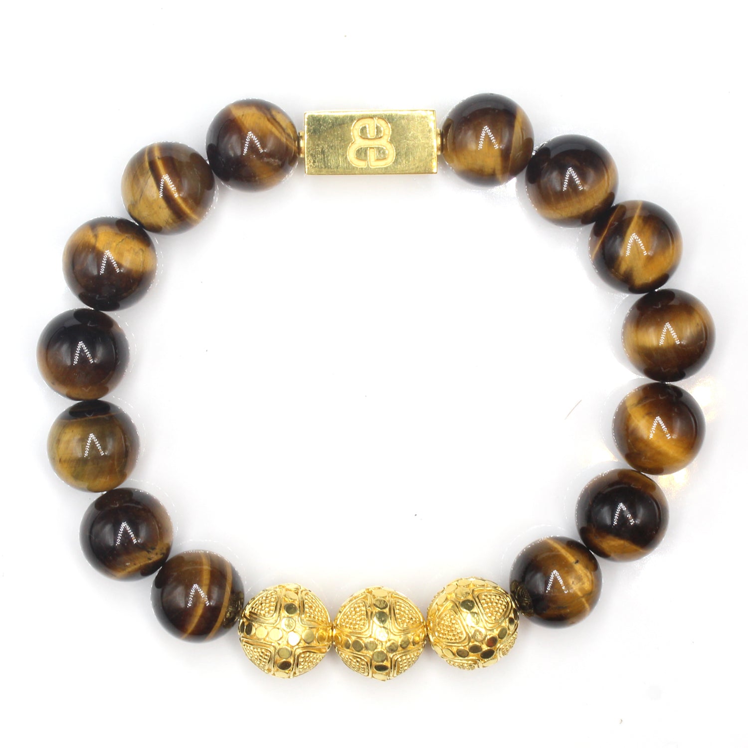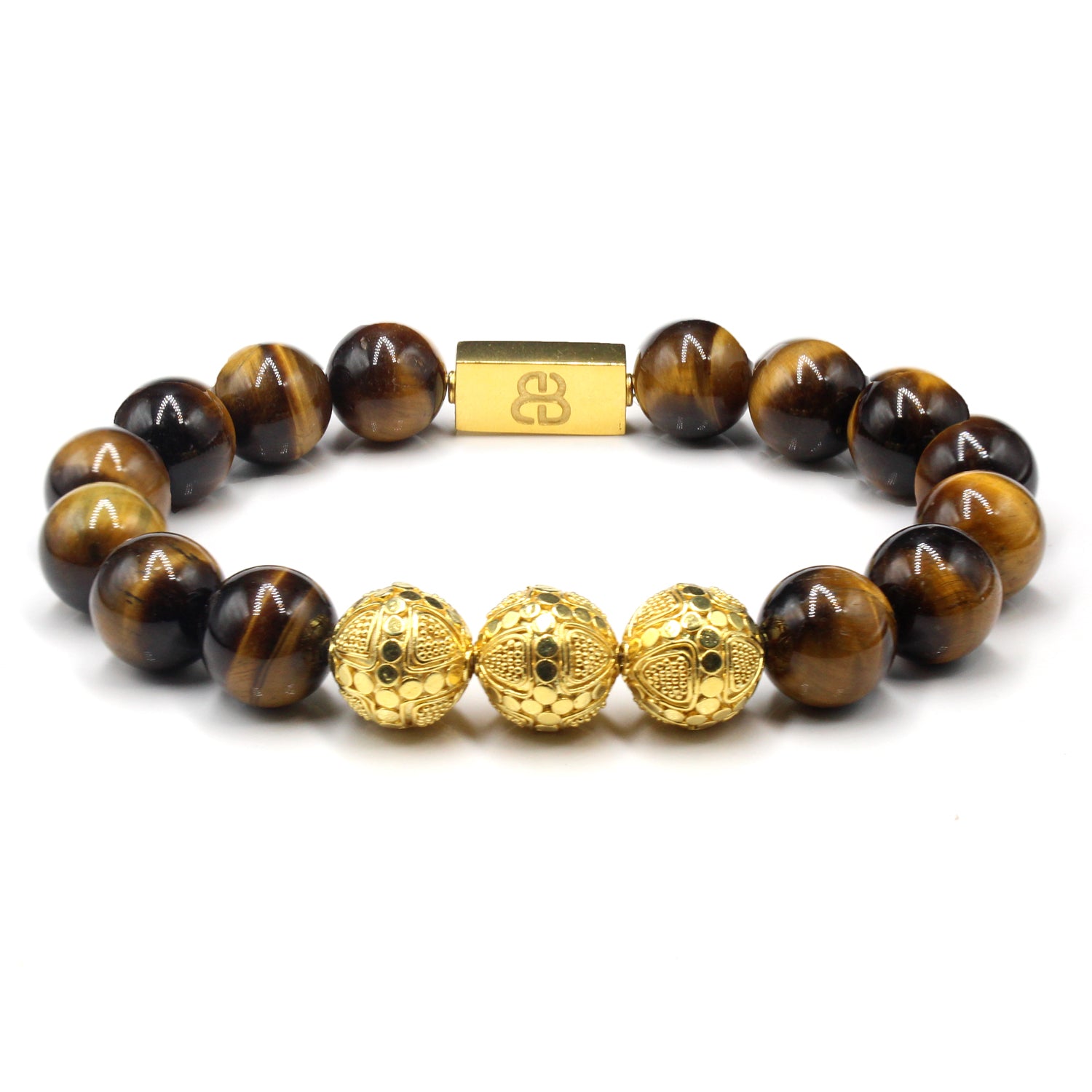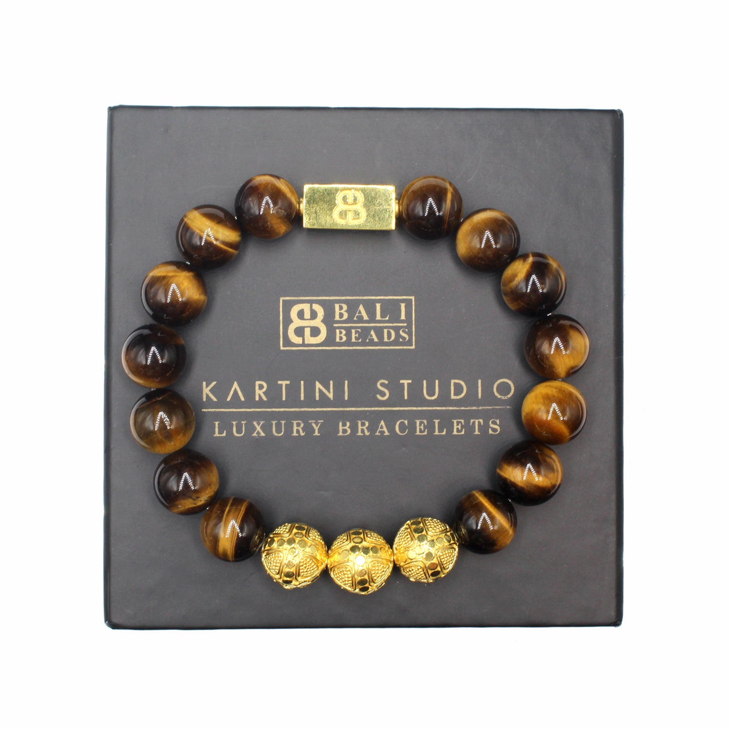 Dieses Designer-Perlenarmband für Herren besteht aus 12 mm Tigerauge-Perlen der Güteklasse A, akzentuiert mit drei handgefertigten Bali-Perlen aus Sterlingsilber mit 22 Karat Goldplattierung und einer 16 mm x 8 mm großen Ankerperle mit Bali-Beads-Logo. Wir verwenden ein 1 mm dickes Silikon-Stretchband für überragende Festigkeit und Belastbarkeit. Ihr Armband wird in einer speziellen Geschenkbox geliefert.