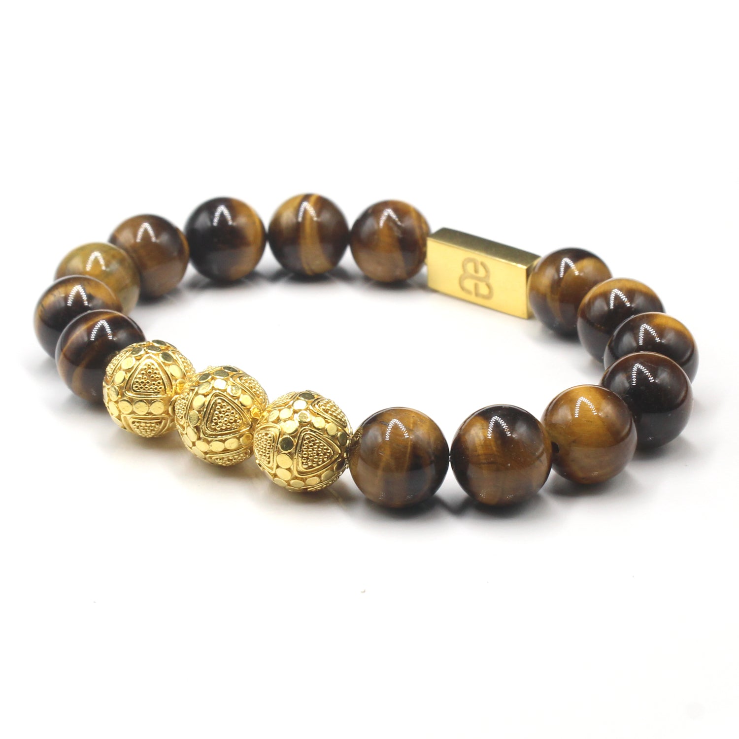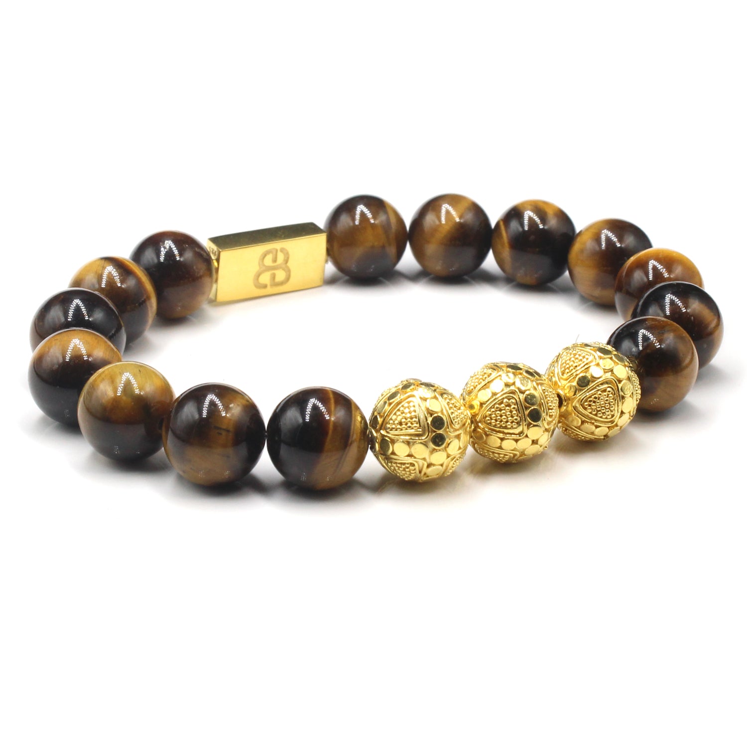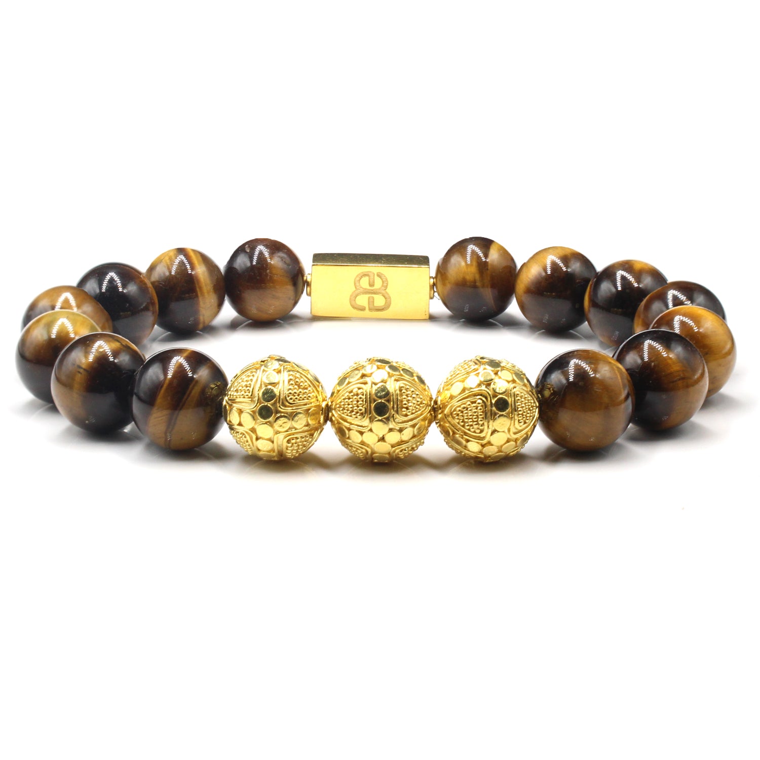 Dieses Designer-Perlenarmband für Herren besteht aus 12 mm Tigerauge-Perlen der Güteklasse A, akzentuiert mit drei handgefertigten Bali-Perlen aus Sterlingsilber mit 22 Karat Goldplattierung und einer 16 mm x 8 mm großen Ankerperle mit Bali-Beads-Logo. Wir verwenden ein 1 mm dickes Silikon-Stretchband für überragende Festigkeit und Belastbarkeit. Ihr Armband wird in einer speziellen Geschenkbox geliefert.