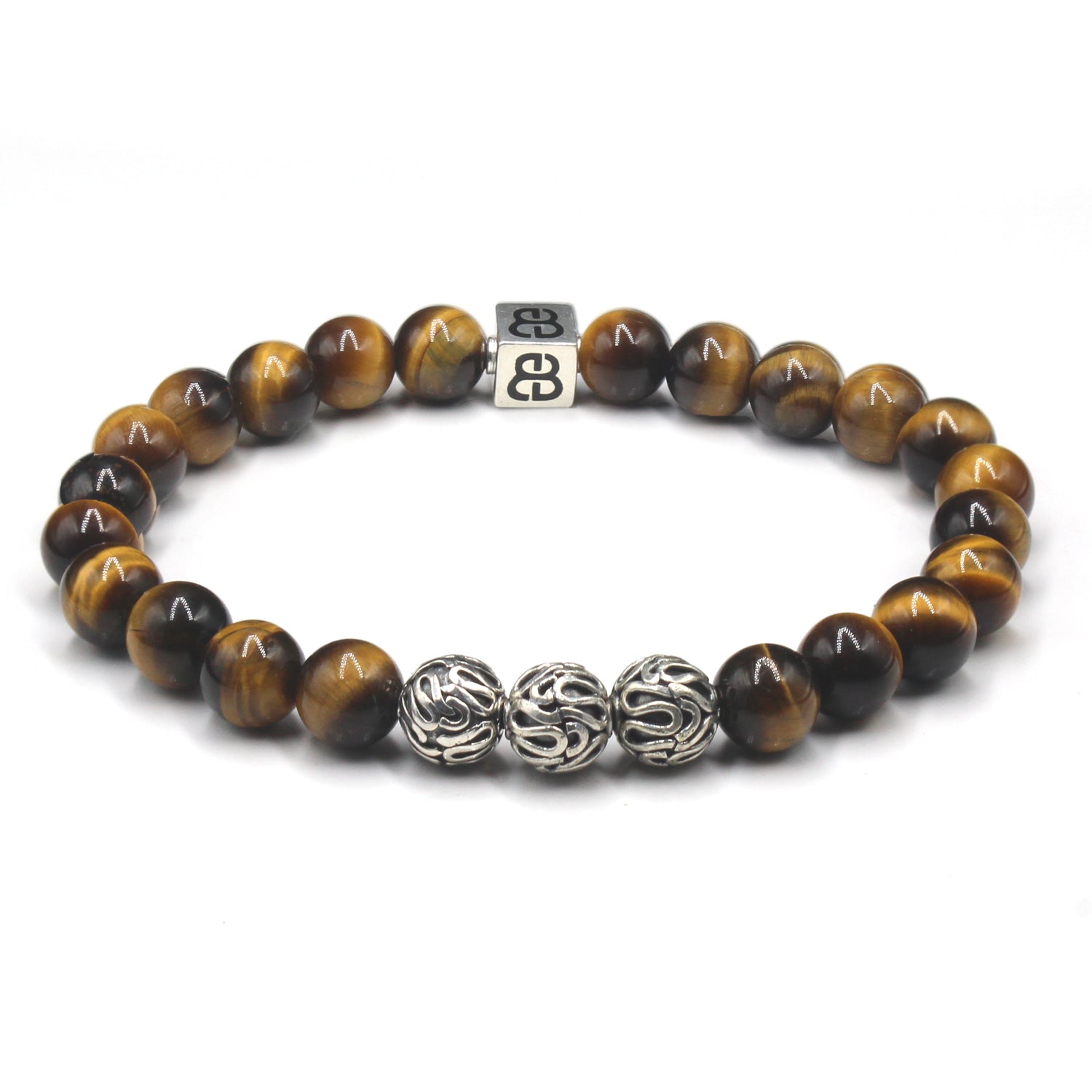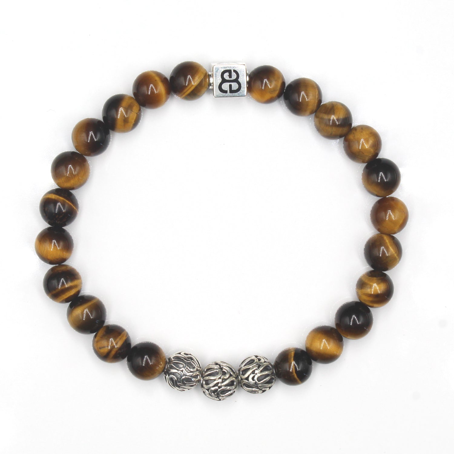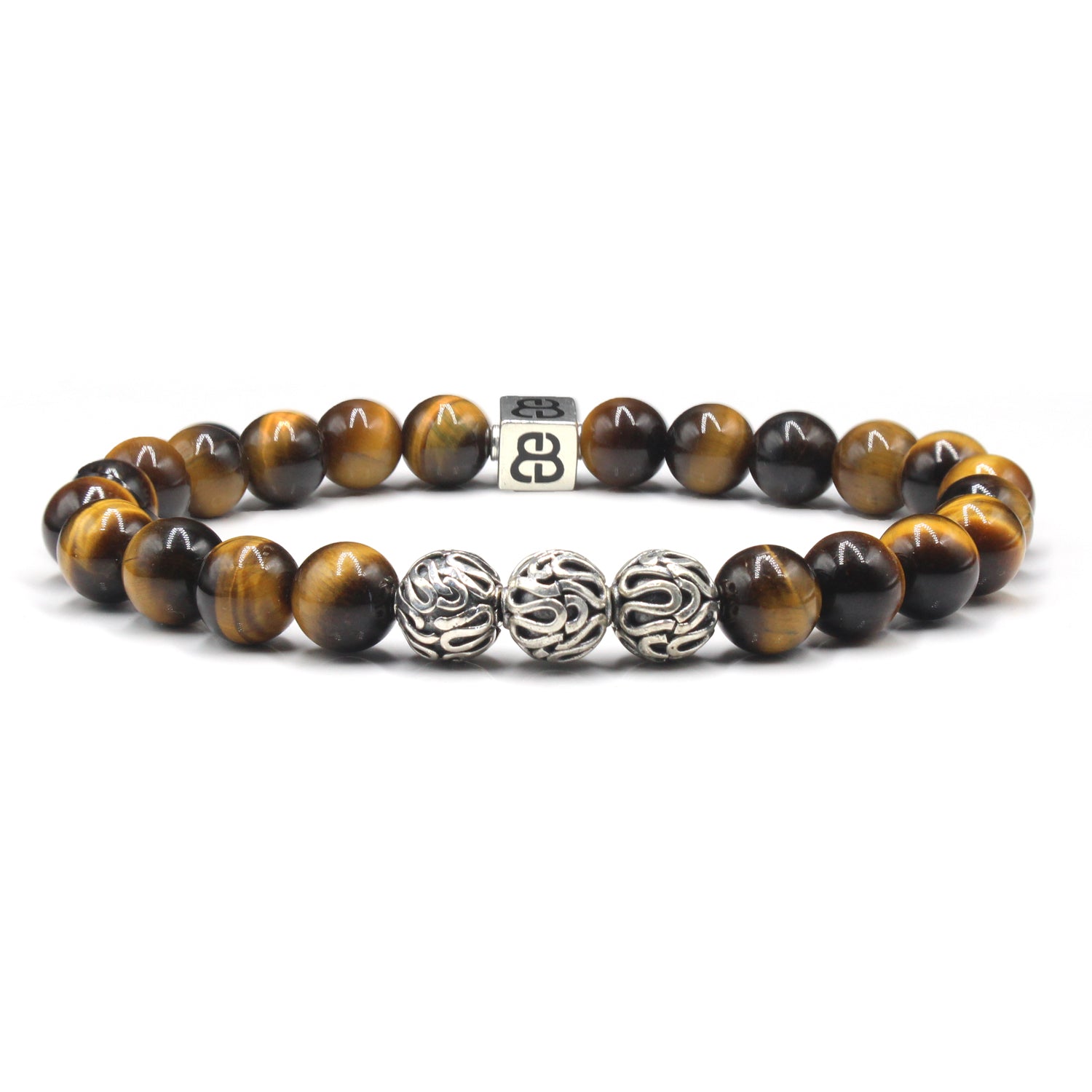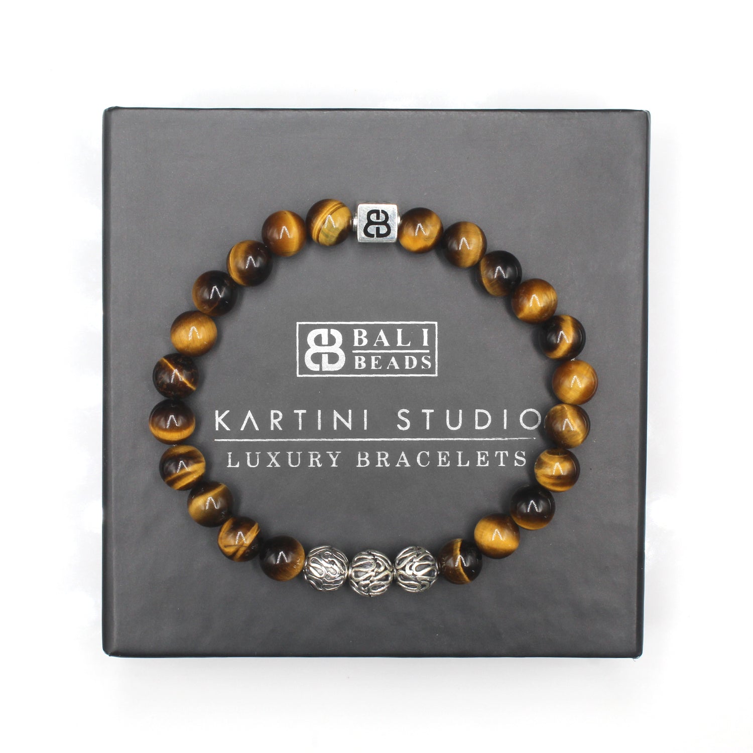 Dieses Armband besteht aus 8 mm großen Tigerauge-Steinperlen, akzentuiert durch drei 8 mm große Bali-Perlen aus Sterlingsilber und eine 8 mm x 8 mm große Ankerperle „Bali Beads“. Wir verwenden ein 1 mm dickes Silikon-Stretchband für überragende Festigkeit und Belastbarkeit. Ihr Armband wird in einem Leinenbeutel geliefert.