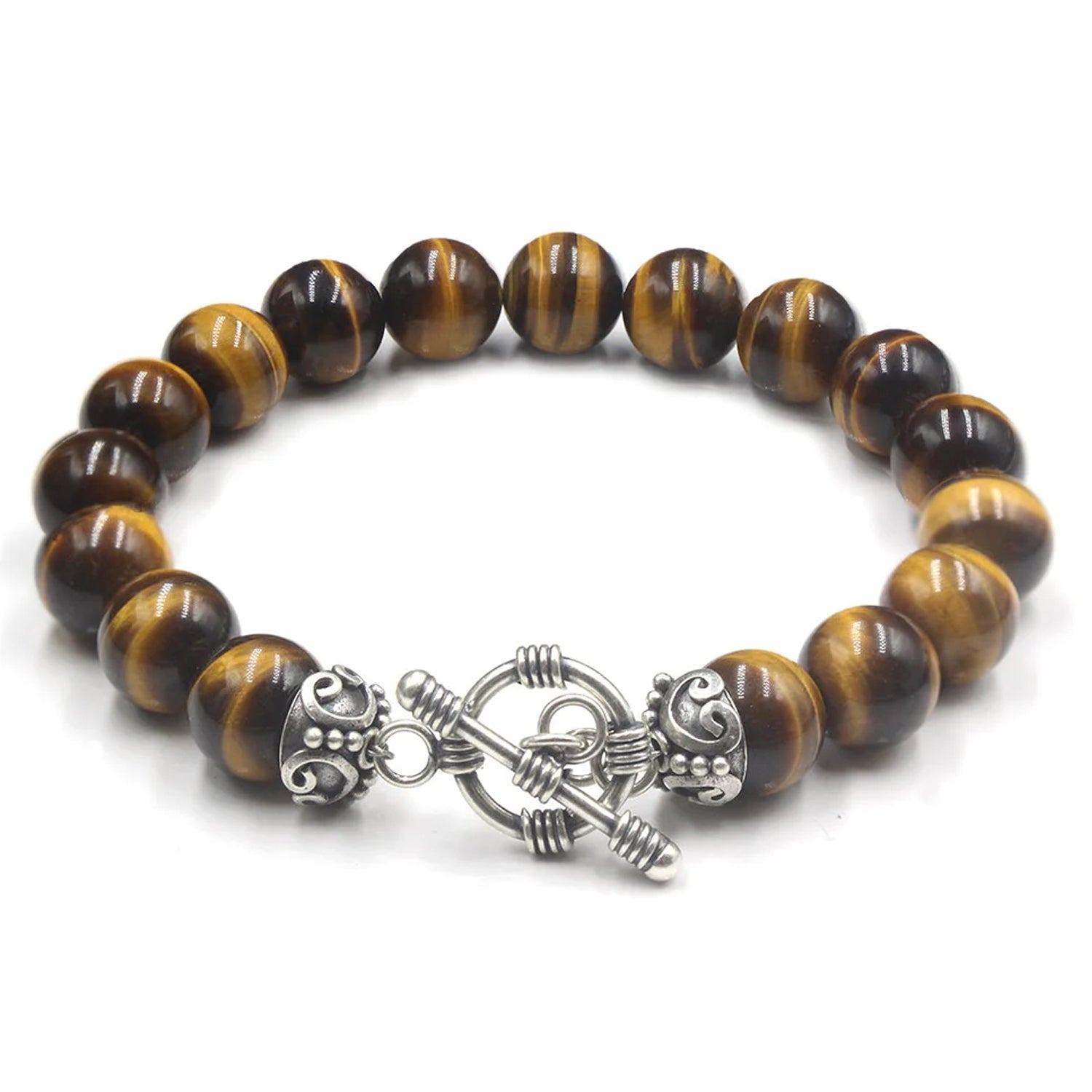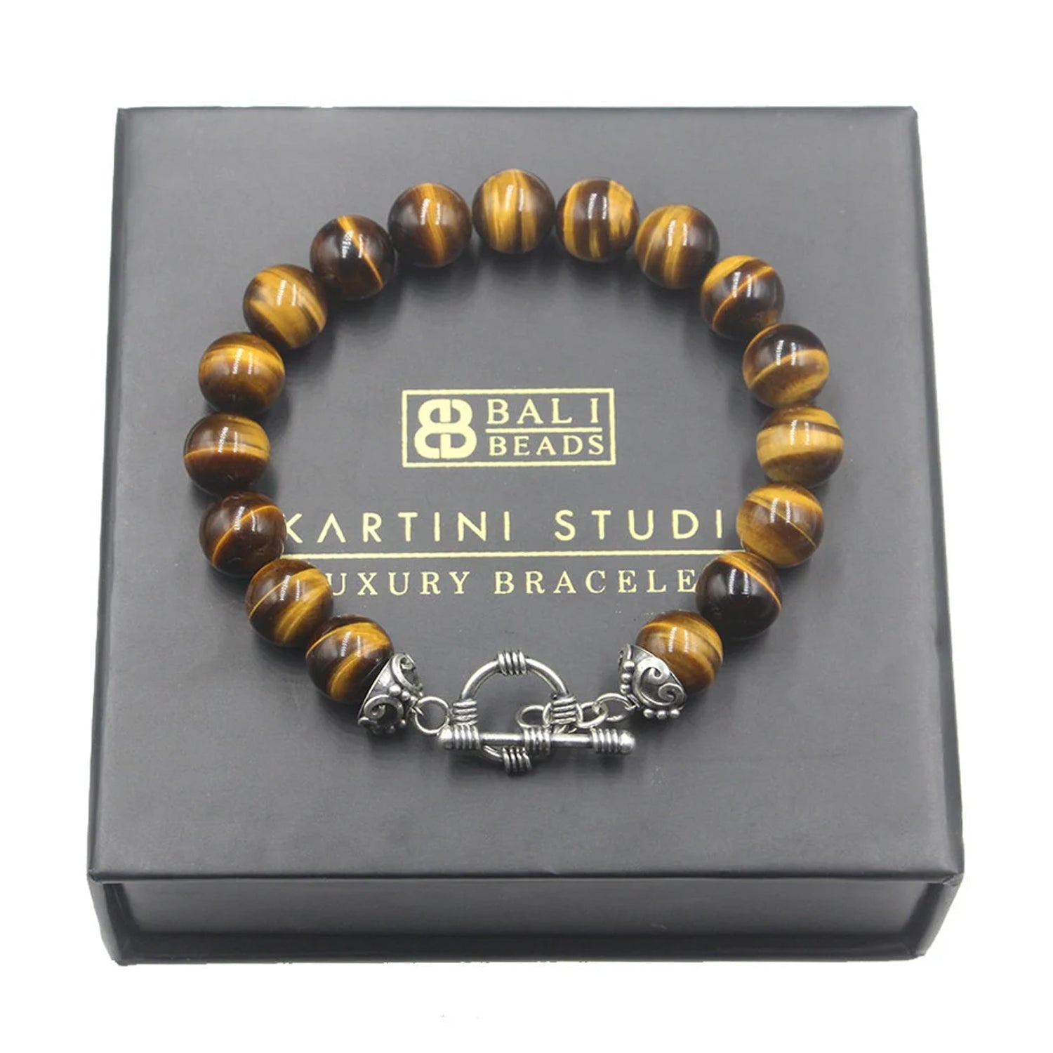 Dieses Armband besteht aus 10 mm großen Tigerauge-Steinperlen höchster Qualität und zwei Perlenkappen aus Sterlingsilber, die für besondere Festigkeit auf Edelstahldraht aufgefädelt sind.