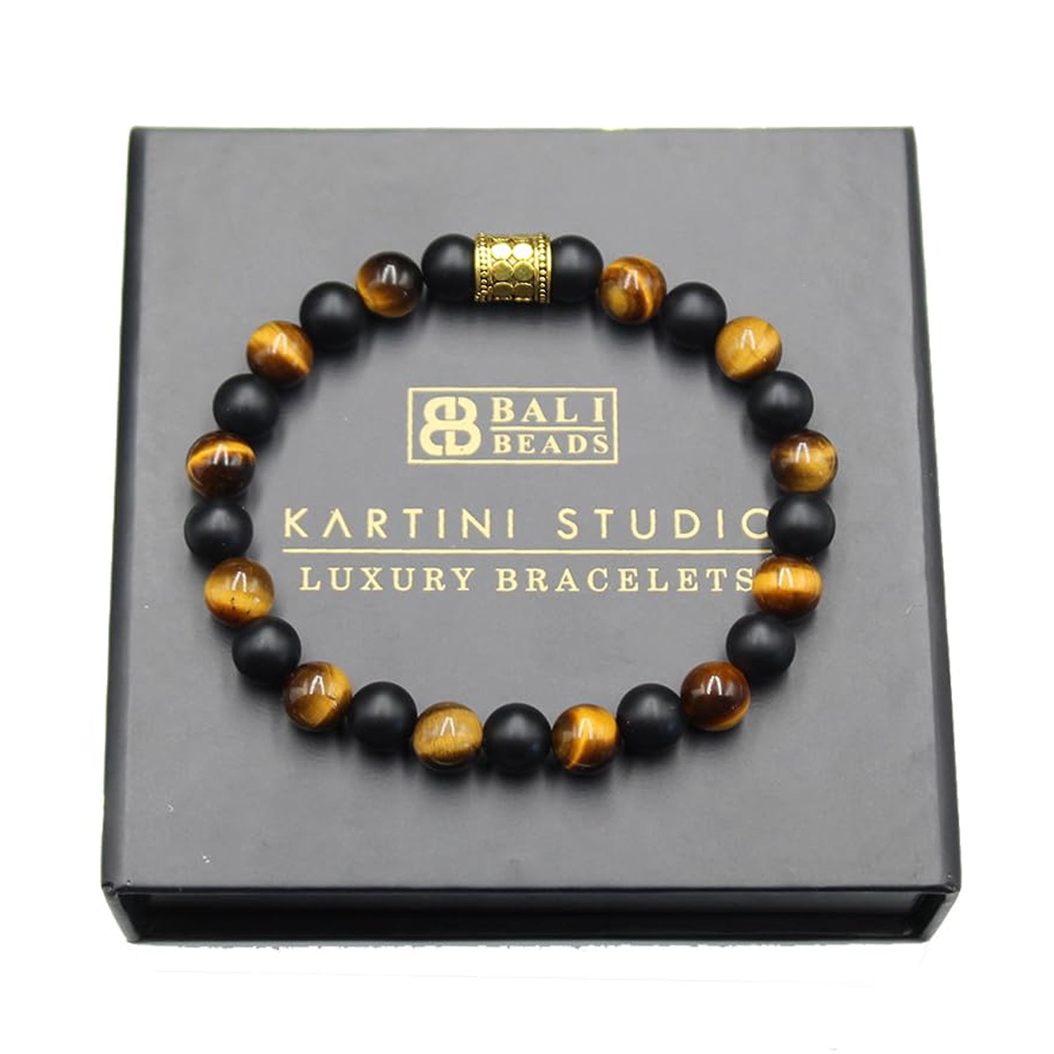 Dieses Armband besteht aus 8 mm großen Tigerauge-Perlen und 8 mm großen mattschwarzen Onyx-Perlen, akzentuiert mit einer handgefertigten, 22 Karat vergoldeten gehämmerten „Punkt“-Perle aus Sterlingsilber.