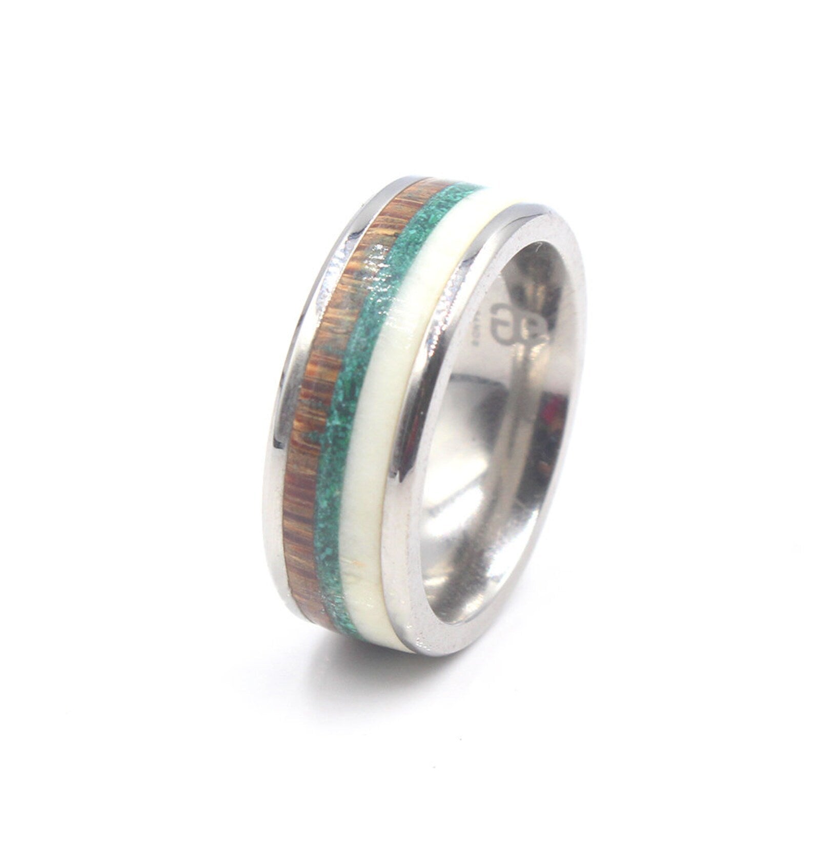 Dieser handgefertigte Herrenring aus Titan mit dreifacher Einlage ist unser eigenes, einzigartiges Design.