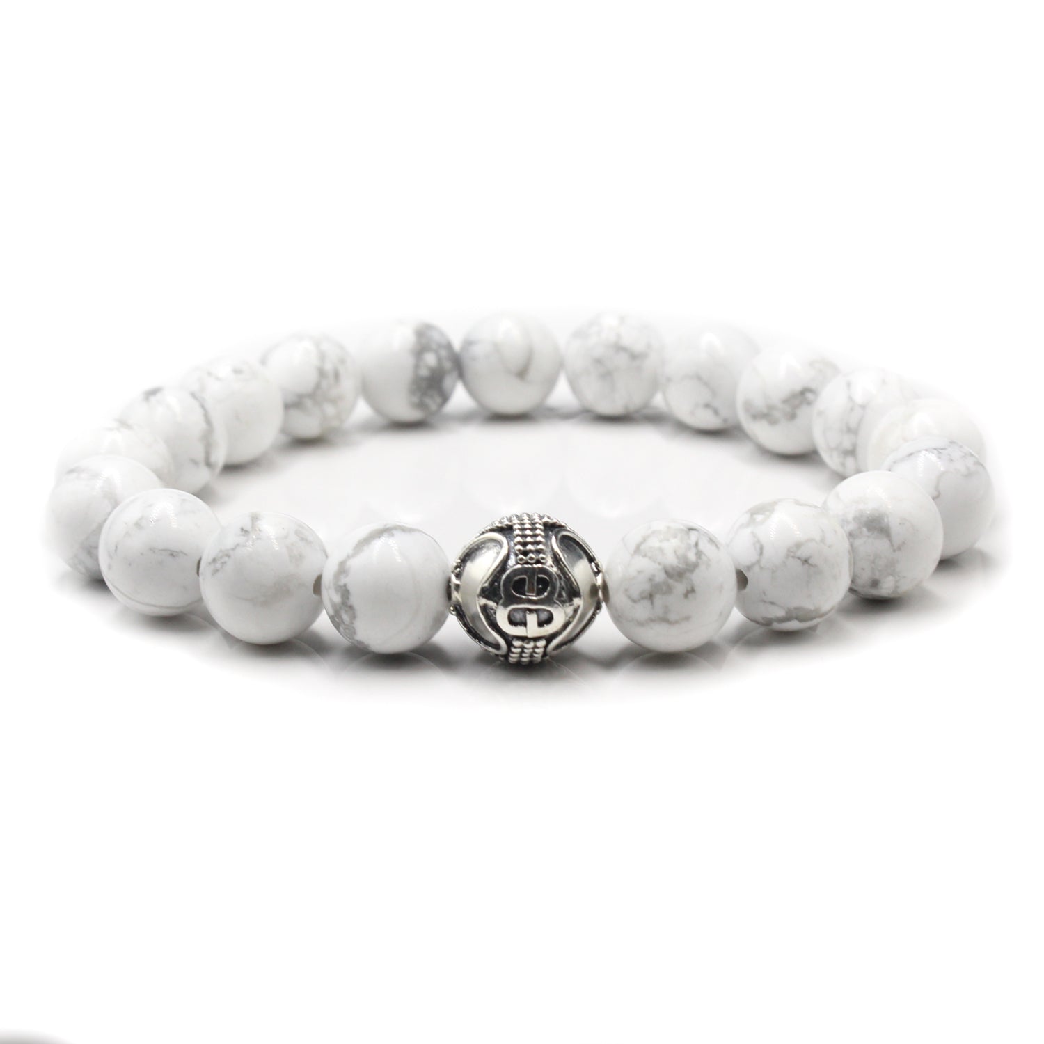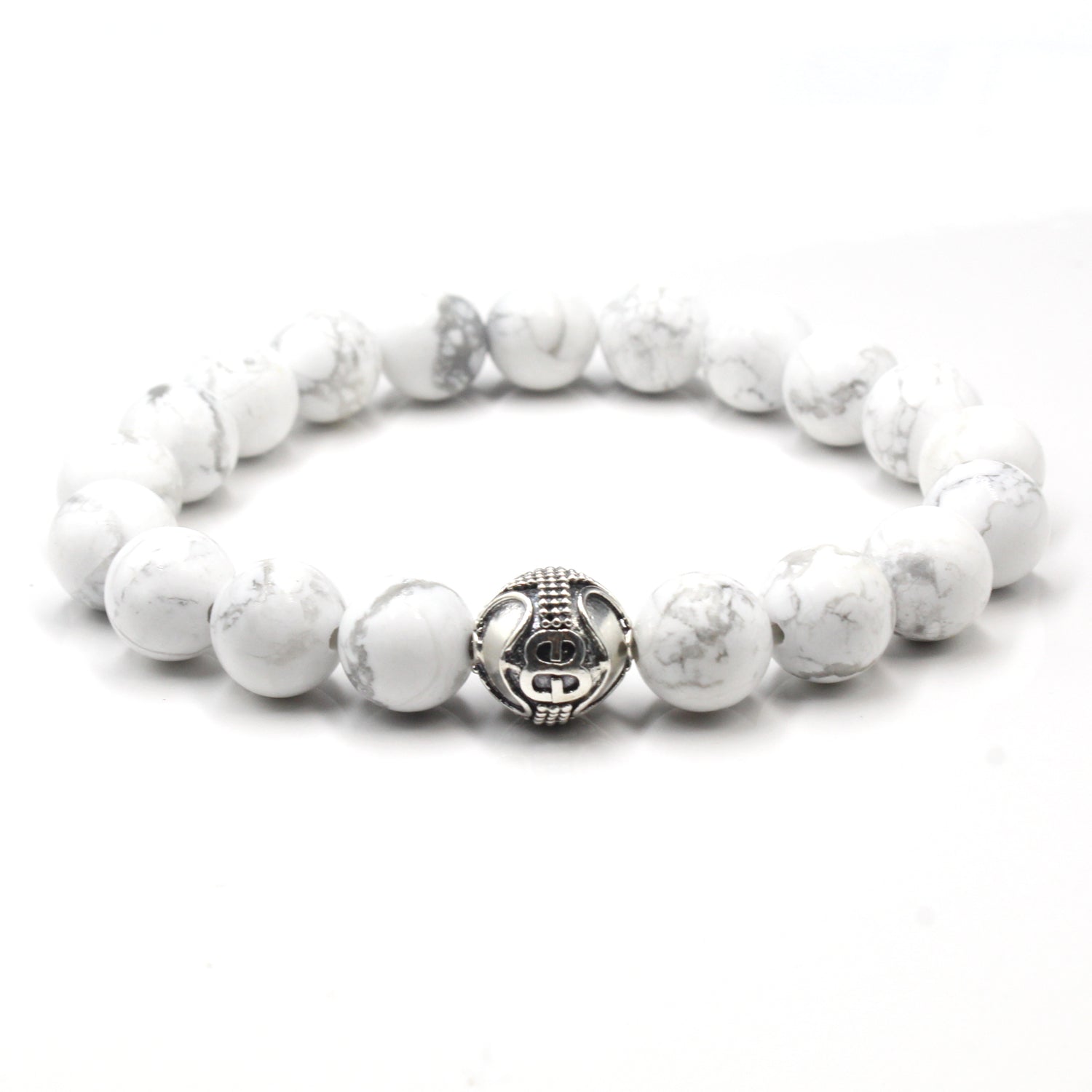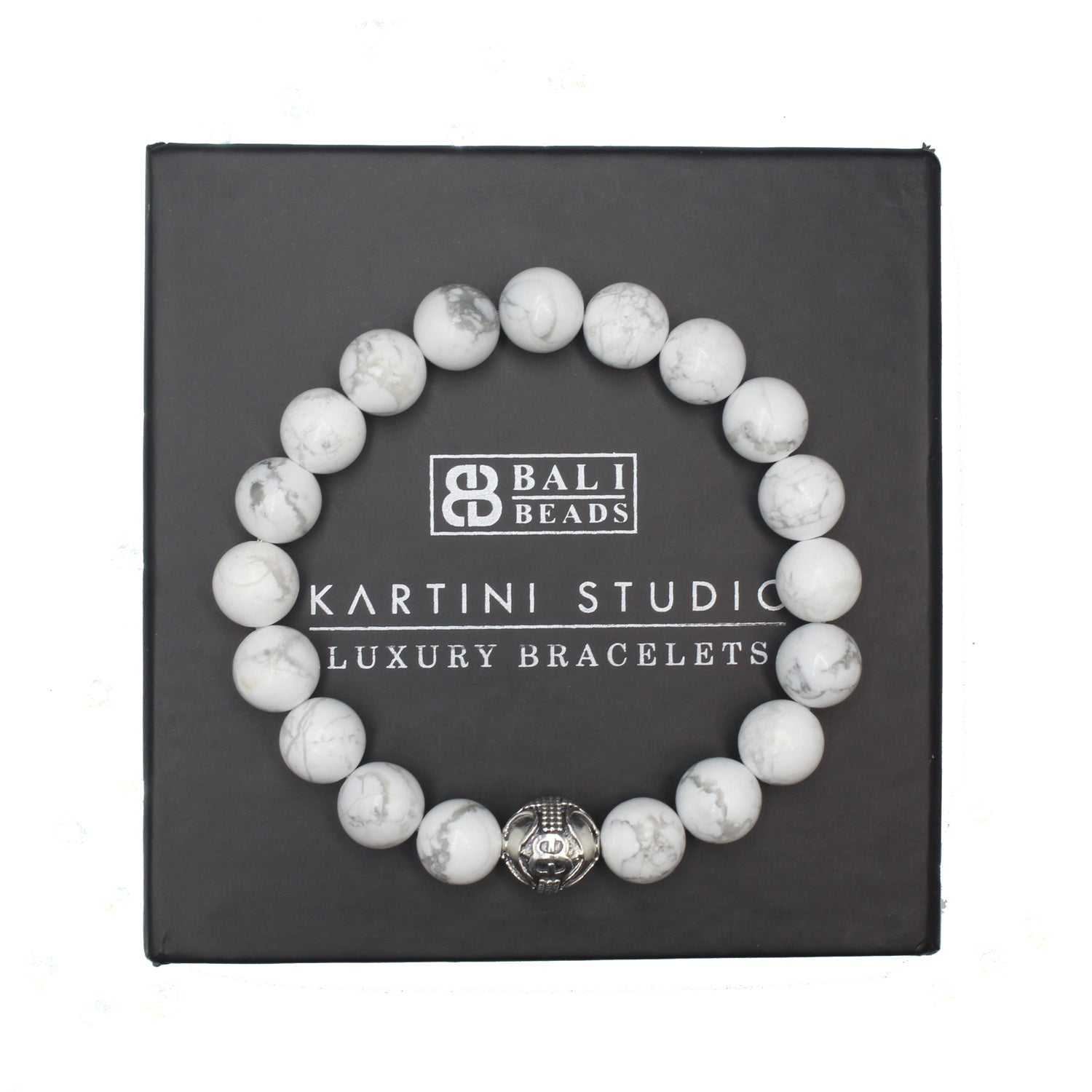 Dieses Designerarmband für Herren besteht aus 10 mm großen weißen Howlithperlen, akzentuiert durch eine handgefertigte Ankerperle mit „Bali Beads“-Logo aus 925er Sterlingsilber. Wir verwenden Silikon-Stretchband für überragende Festigkeit. Ihr Armband wird in einer Geschenkbox geliefert. Wählen Sie Ihre Handgelenkgröße aus dem Dropdown-Menü.