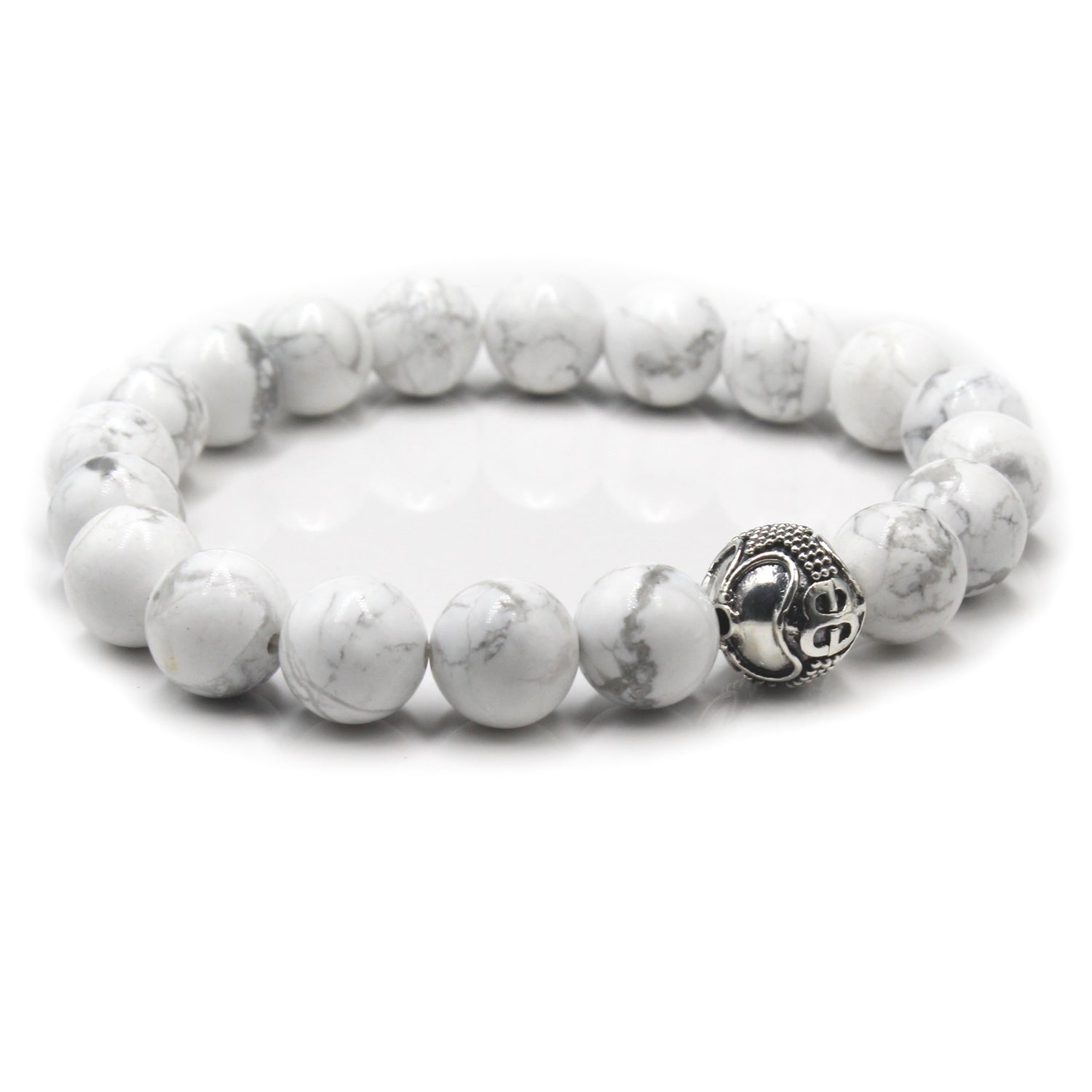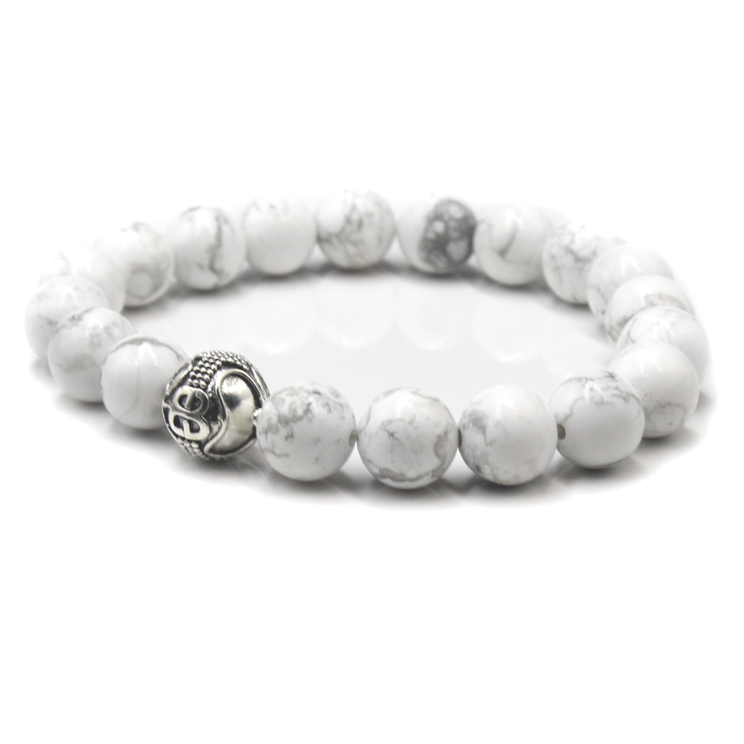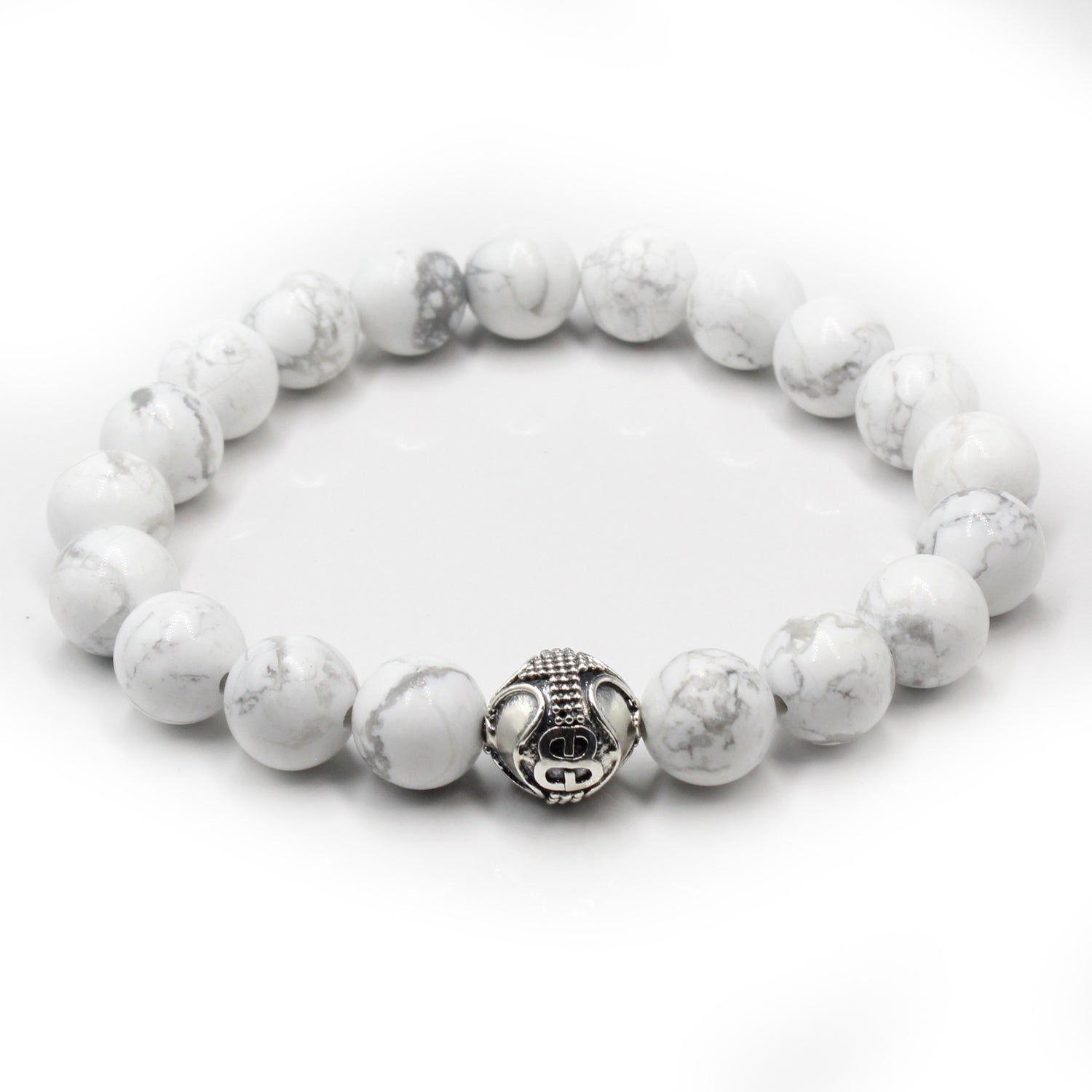 Dieses Designerarmband für Herren besteht aus 10 mm großen weißen Howlithperlen, akzentuiert durch eine handgefertigte Ankerperle mit „Bali Beads“-Logo aus 925er Sterlingsilber. Wir verwenden Silikon-Stretchband für überragende Festigkeit. Ihr Armband wird in einer Geschenkbox geliefert. Wählen Sie Ihre Handgelenkgröße aus dem Dropdown-Menü.