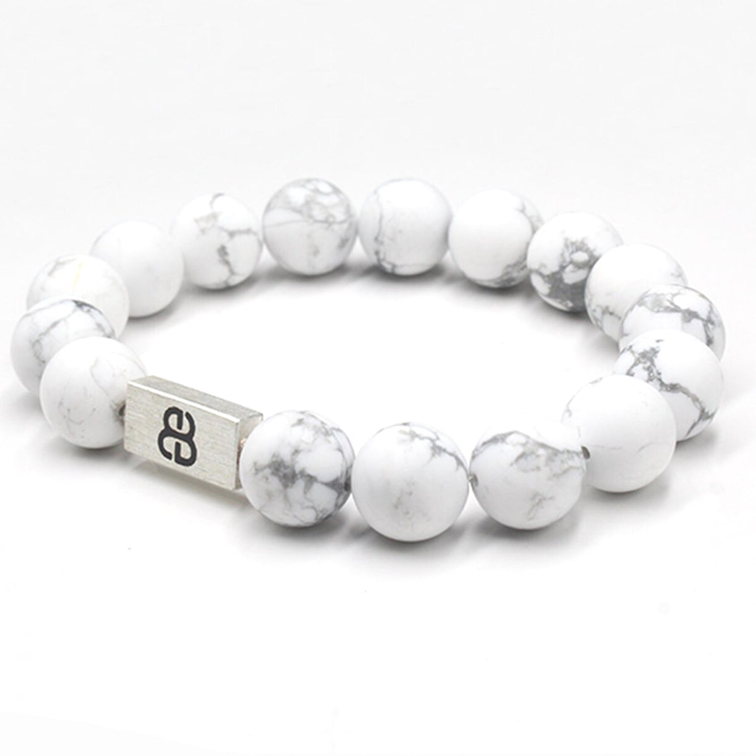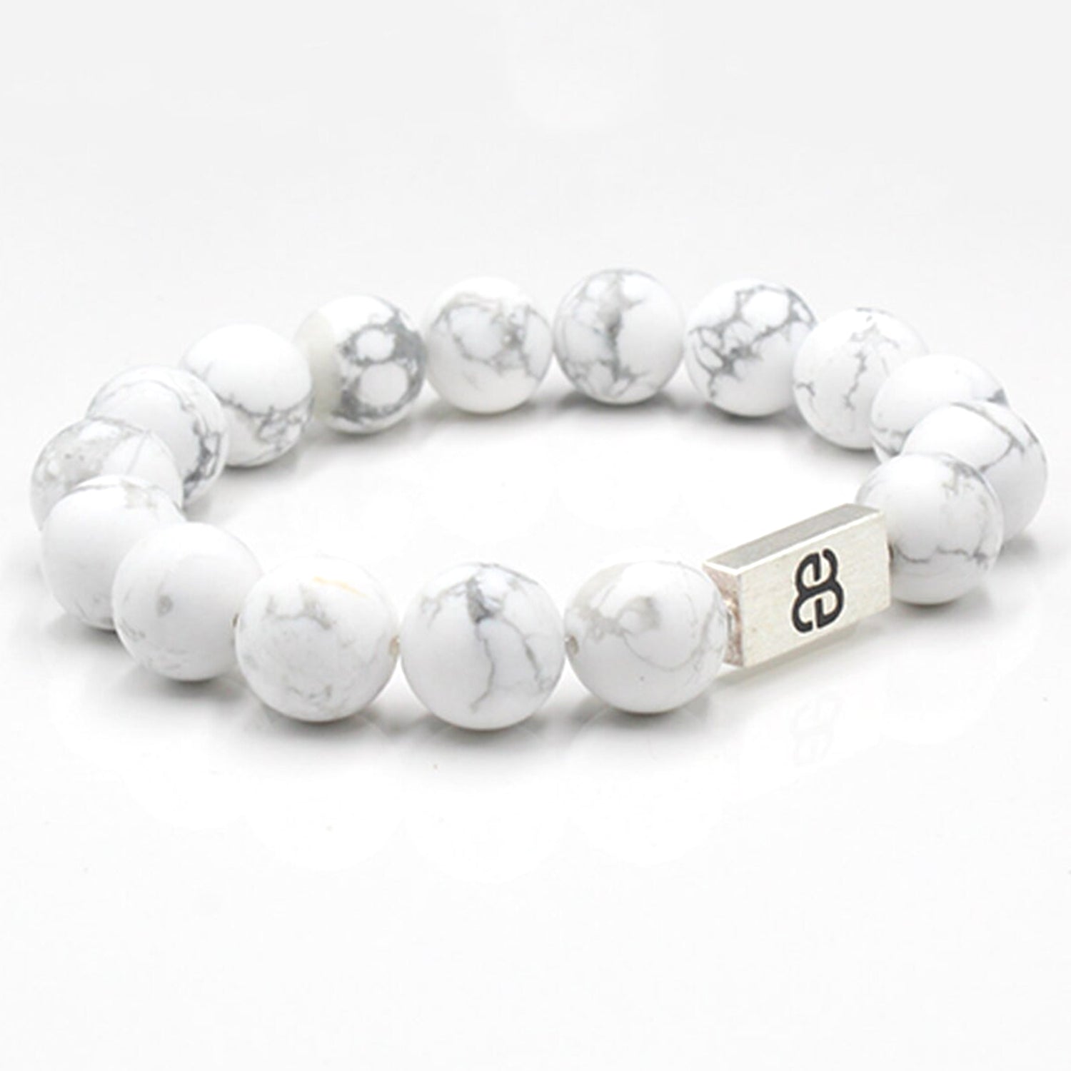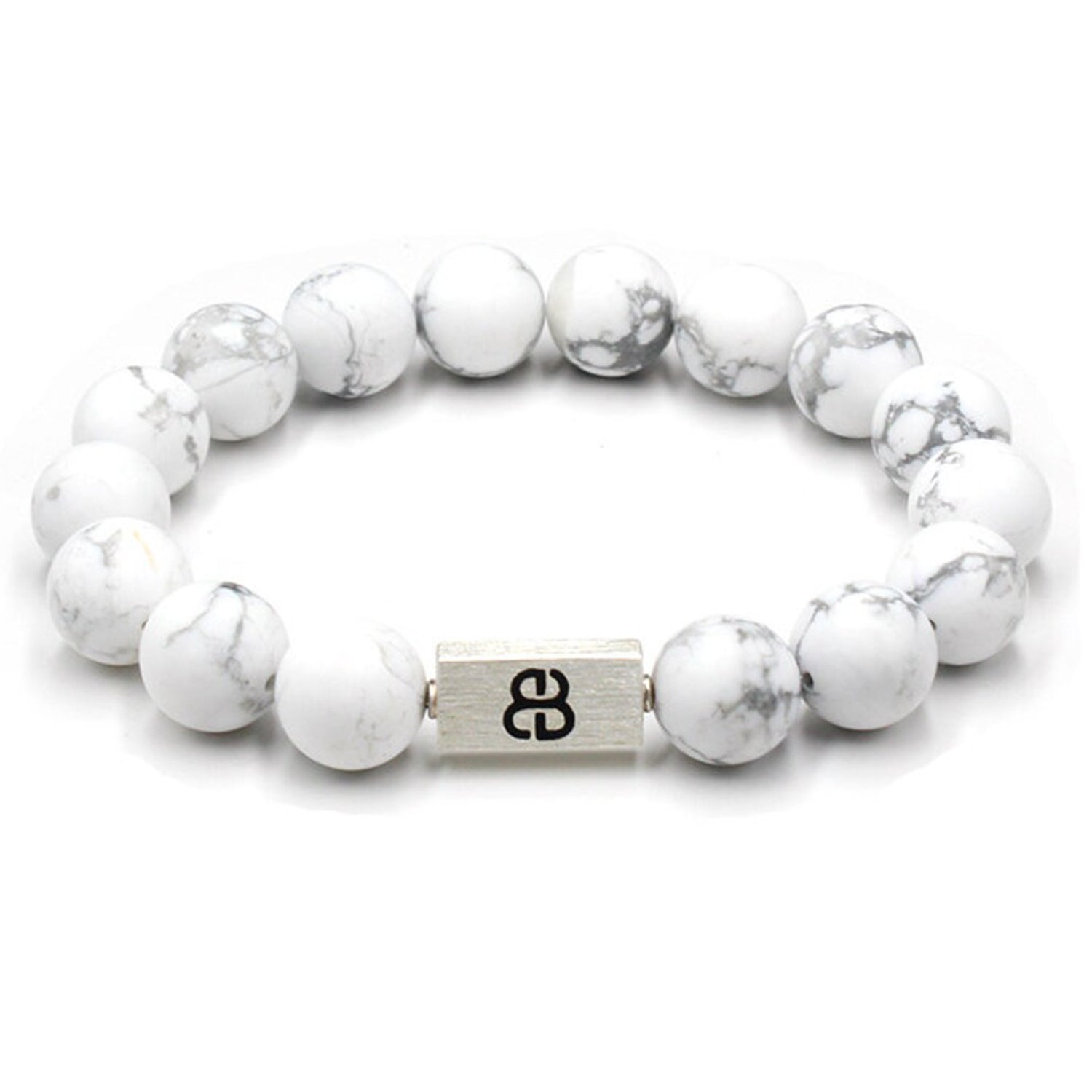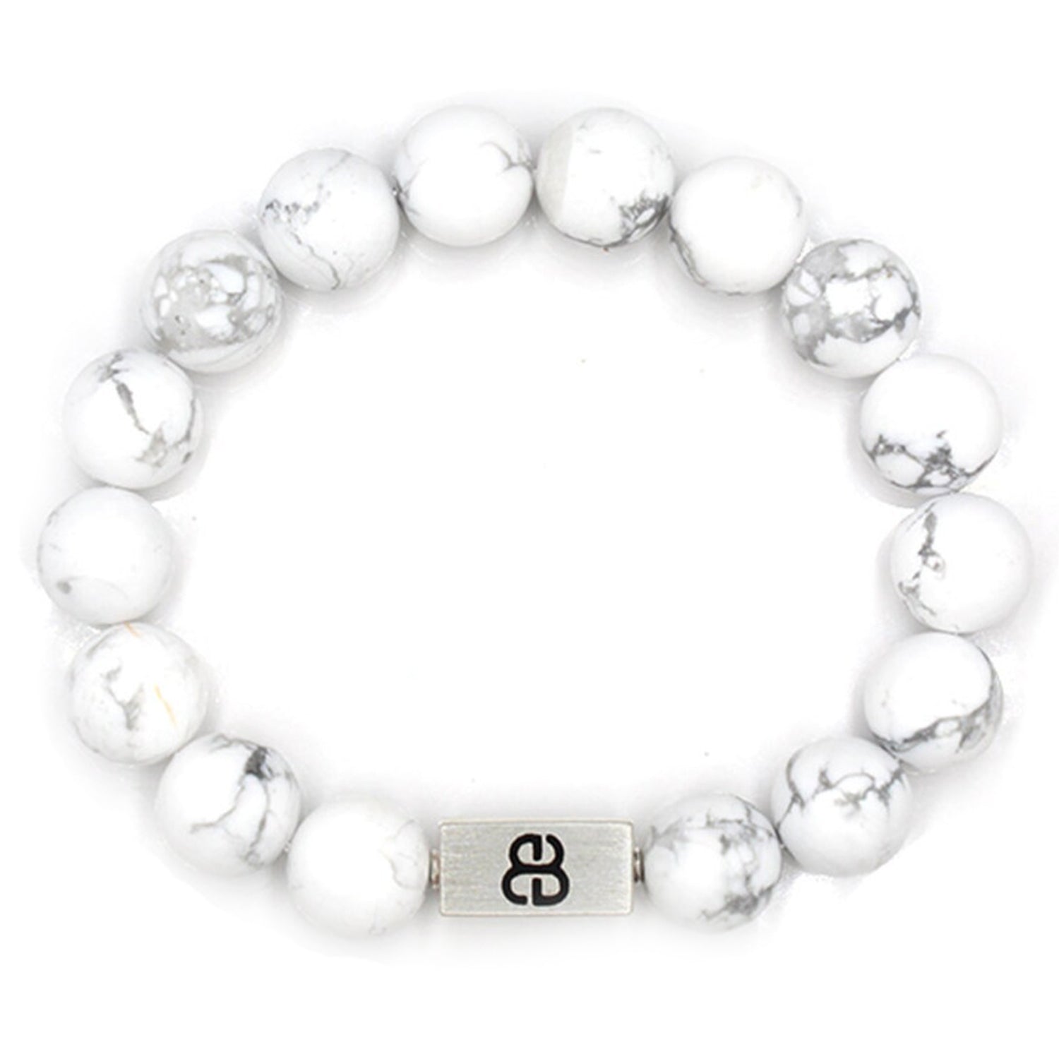 Dieses Armband besteht aus 12 mm großen mattweißen Howlith-Steinperlen, akzentuiert mit einer 16 mm x 8 mm großen Perle aus gebürstetem Sterling-Silber mit dem „Bali Beads“-Logo.
