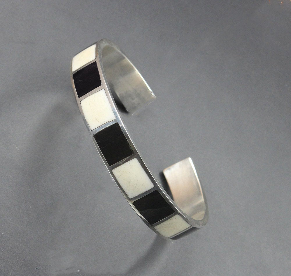 This is a solid sterling silver handmade cuff bracelet with alternating inlays of black buffalo horn and white buffalo bone, collected from local Balinese water buffalo that have died from natural causes. The bracelet width is 12mm (1/2 inch). The bracelet is made with a one gap that is not adjustable due to the precise inlay. Please select your wrist size from the drop down menu and we will make your bracelet to fit. It takes approximately two weeks to make this bracelet.