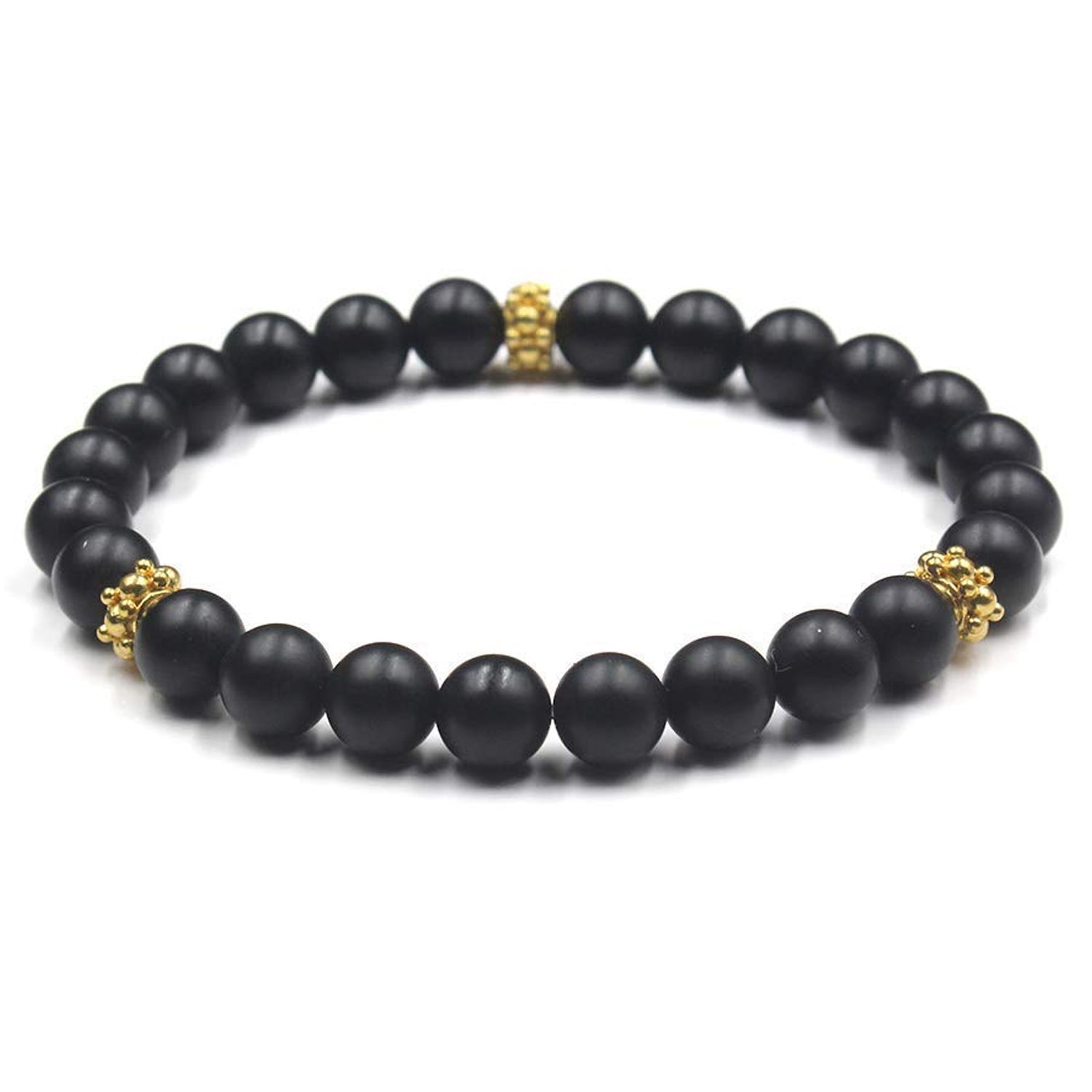 This bracelet features 8mm matte black onyx gemstone beads accented with three 6mm 22 karat gold plated sterling silver rondelle beads.