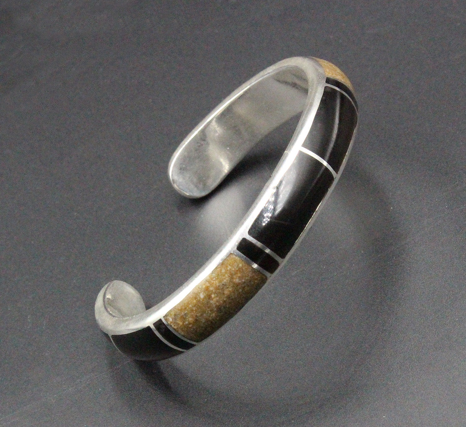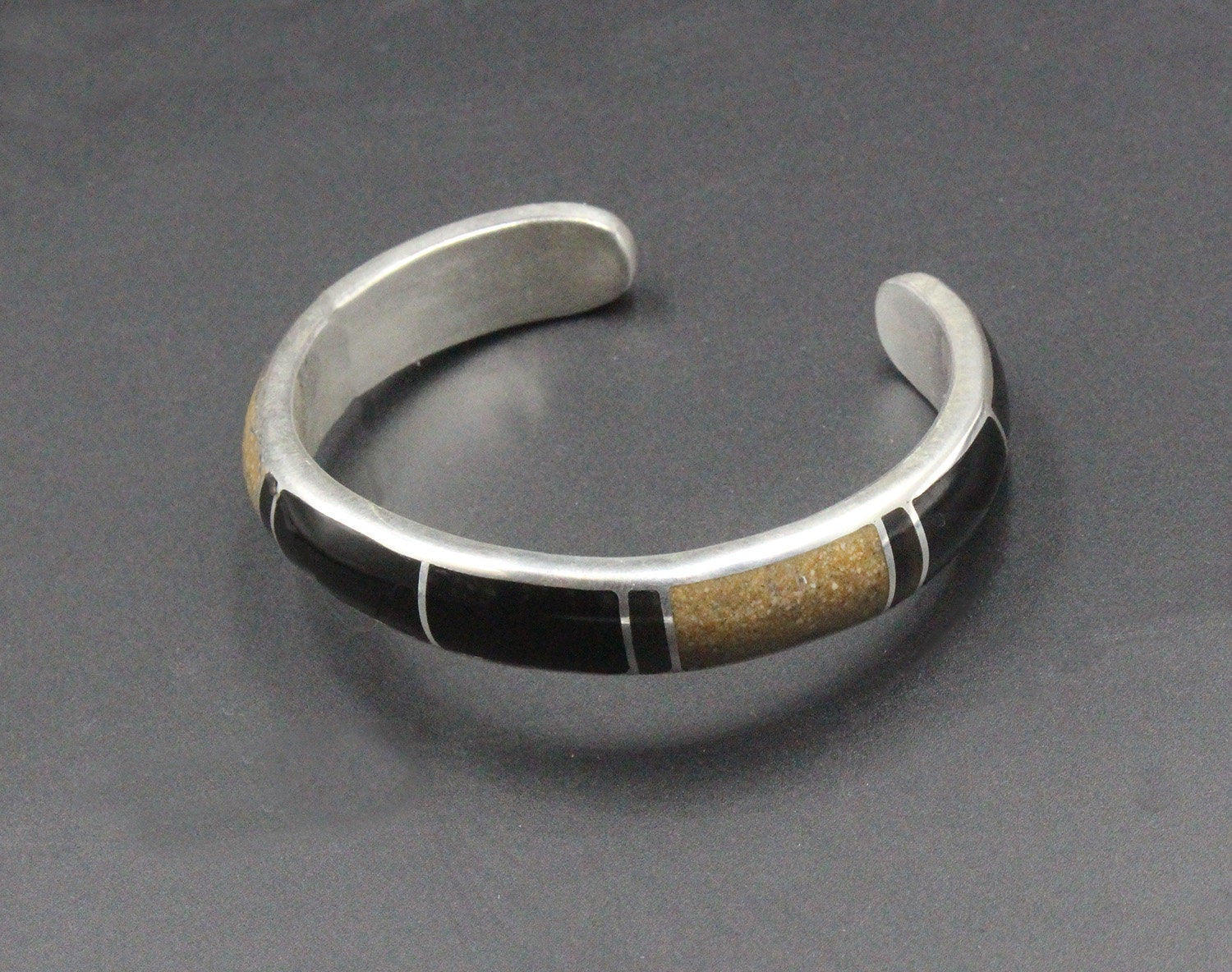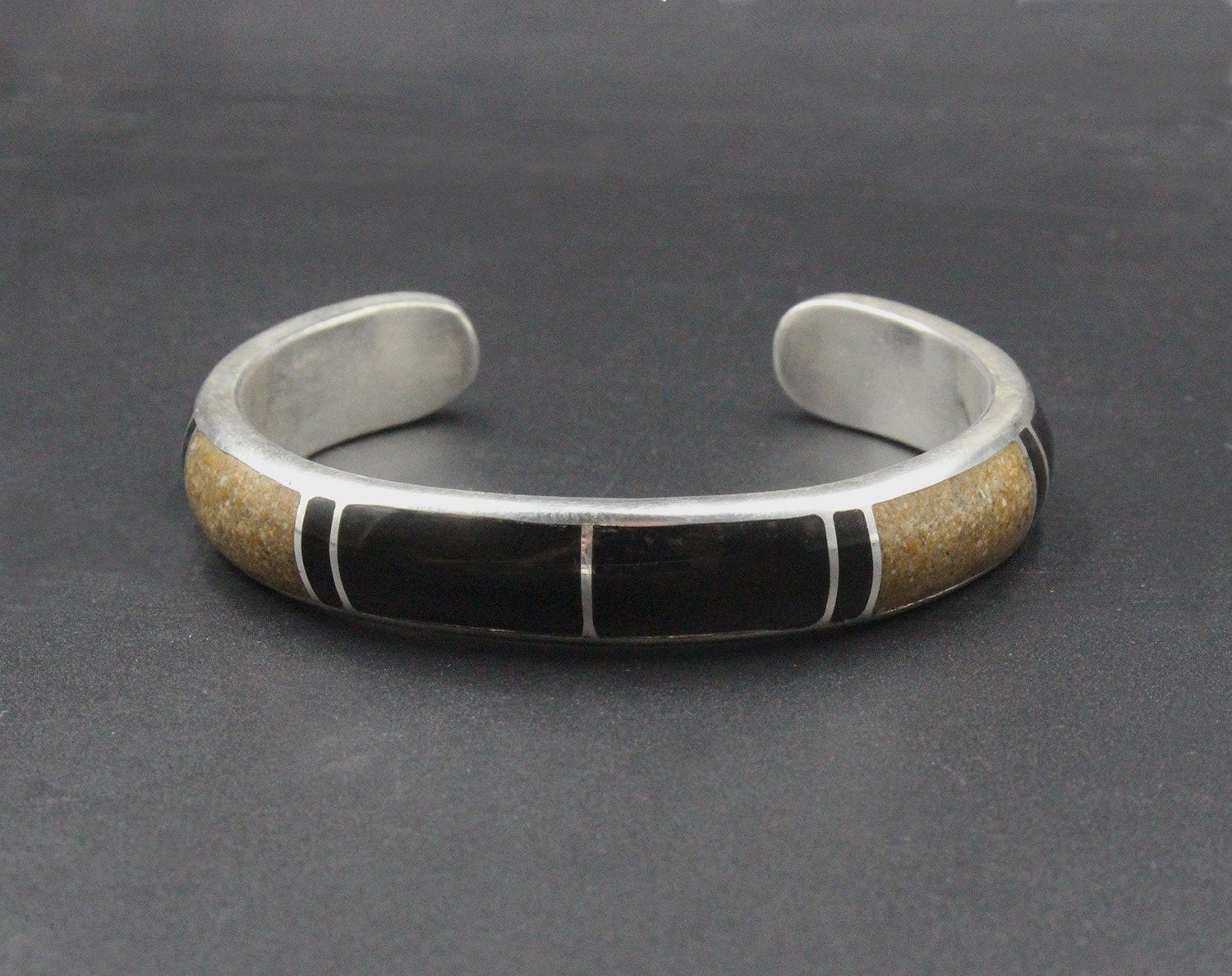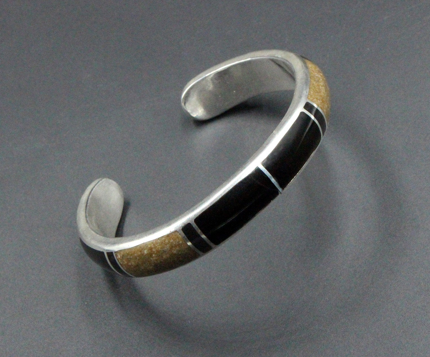 This cuff bracelet is made from solid sterling silver with inlaid black onyx and crushed picture jasper stone. The bracelet width is 10mm. The gap is 1.25 inches for a man's wrist size; 1 inch for a woman's wrist size. Select your wrist size from the drop down menu, and we will make your bracelet to fit. At the moment, it takes approximately 2 weeks to make this bracelet. Please measure your wrist size if you are not sure of the size.