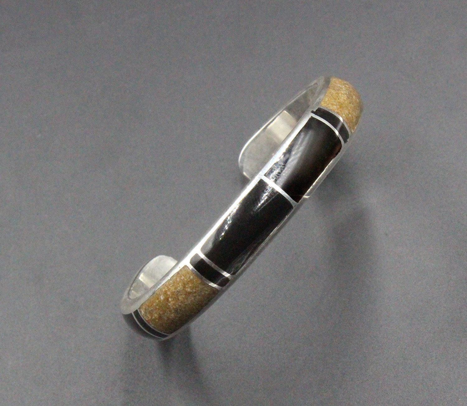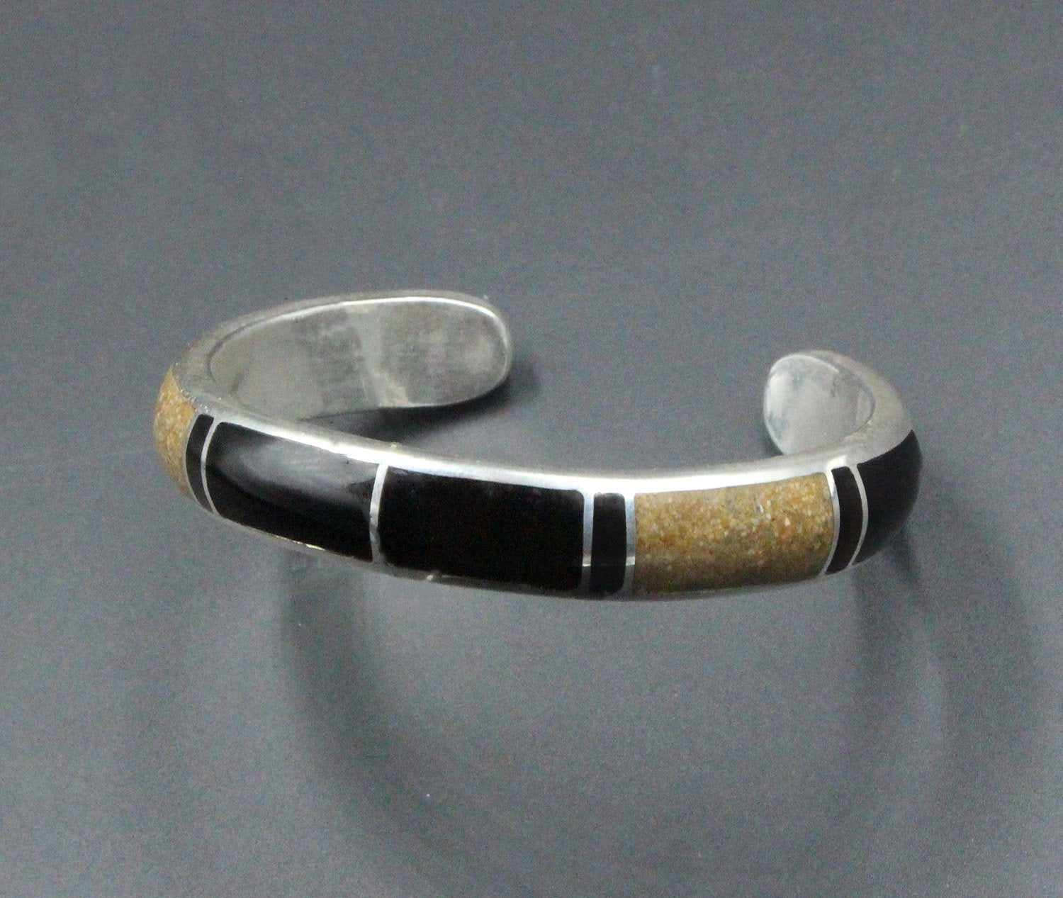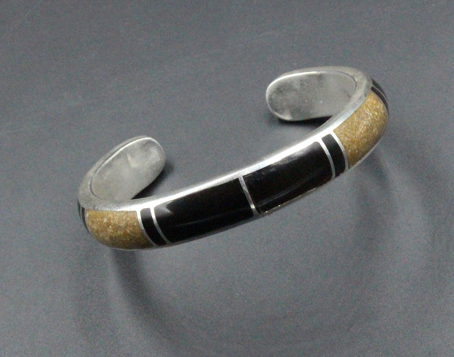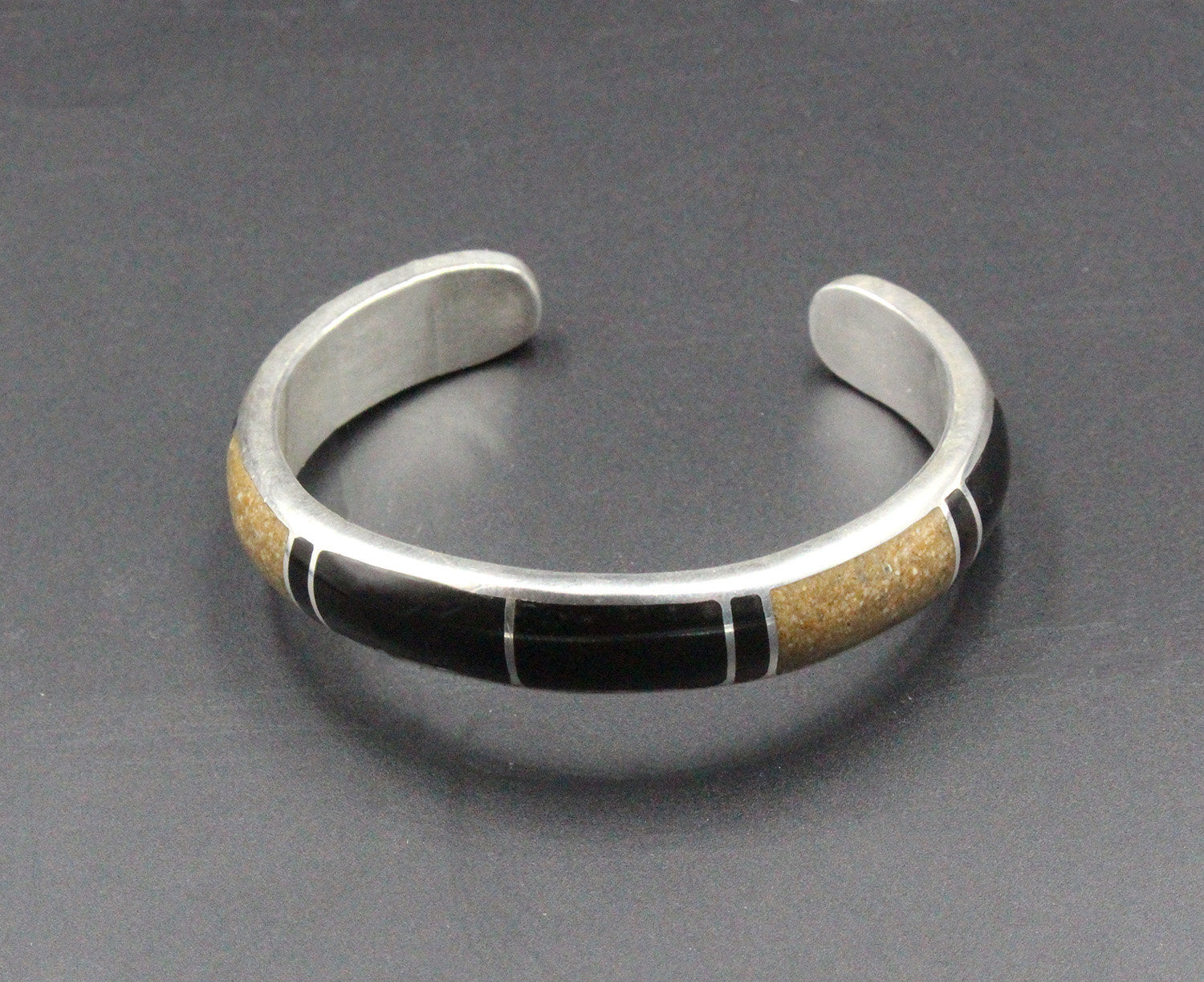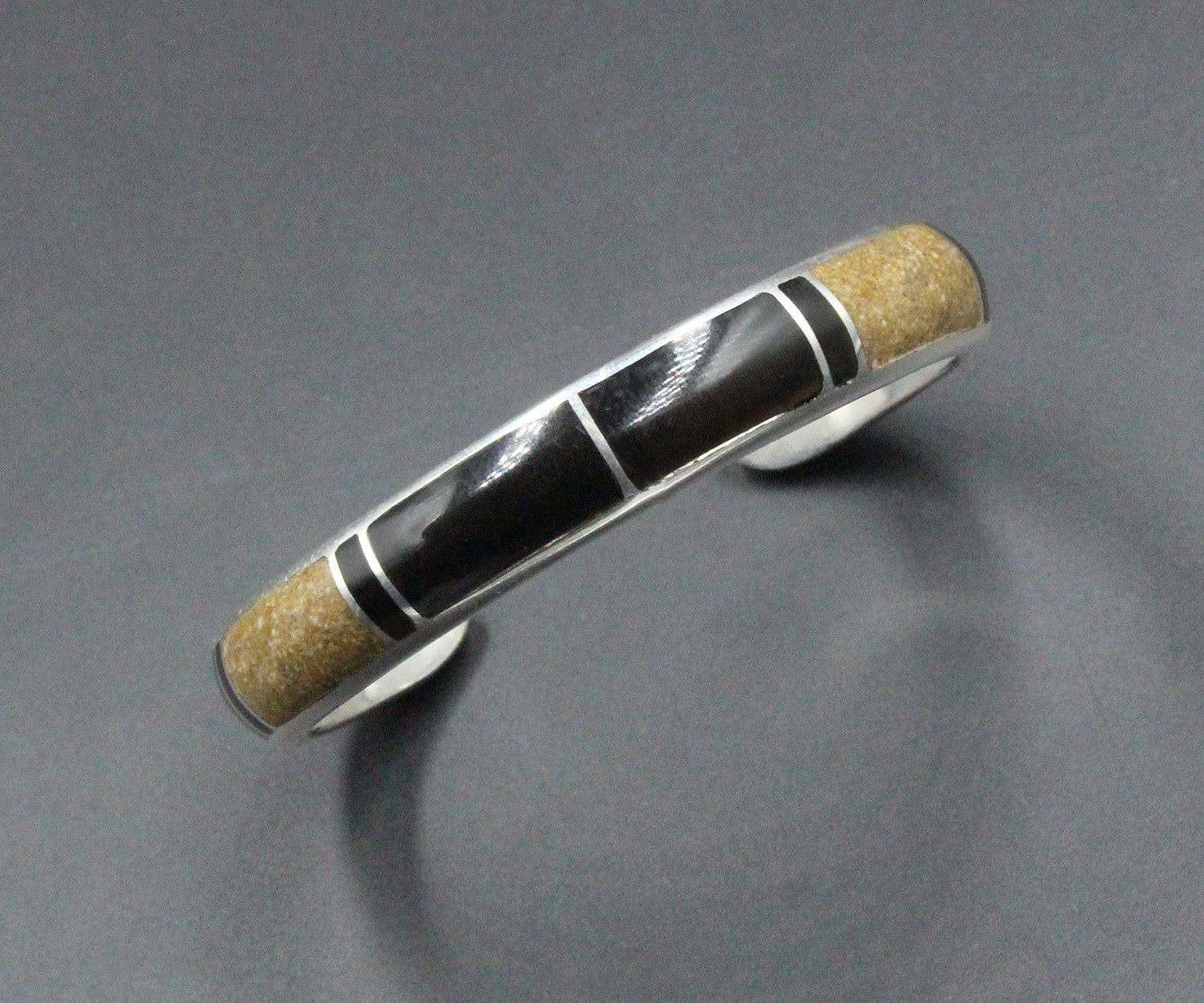 This cuff bracelet is made from solid sterling silver with inlaid black onyx and crushed picture jasper stone. The bracelet width is 10mm. The gap is 1.25 inches for a man's wrist size; 1 inch for a woman's wrist size. Select your wrist size from the drop down menu, and we will make your bracelet to fit. At the moment, it takes approximately 2 weeks to make this bracelet. Please measure your wrist size if you are not sure of the size.