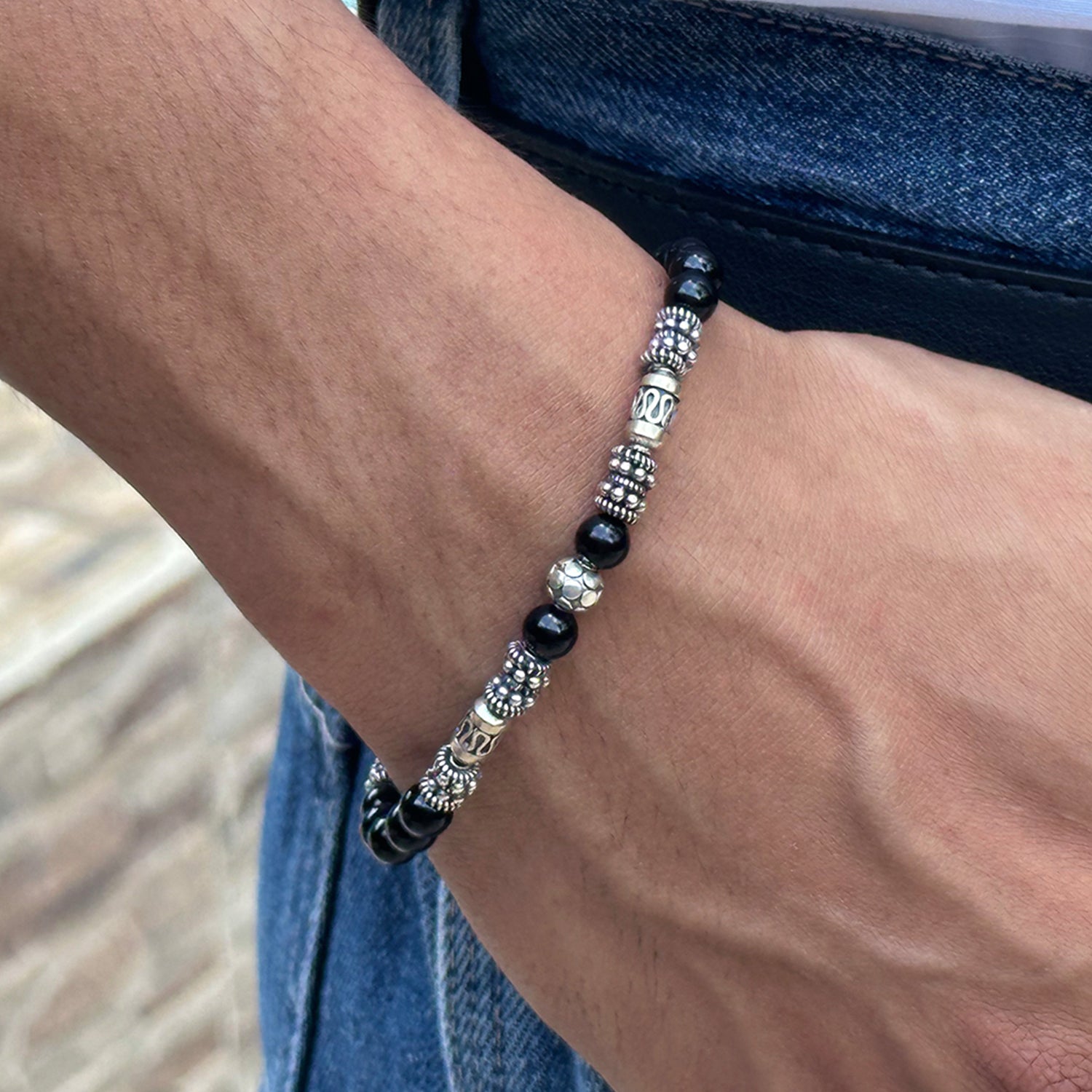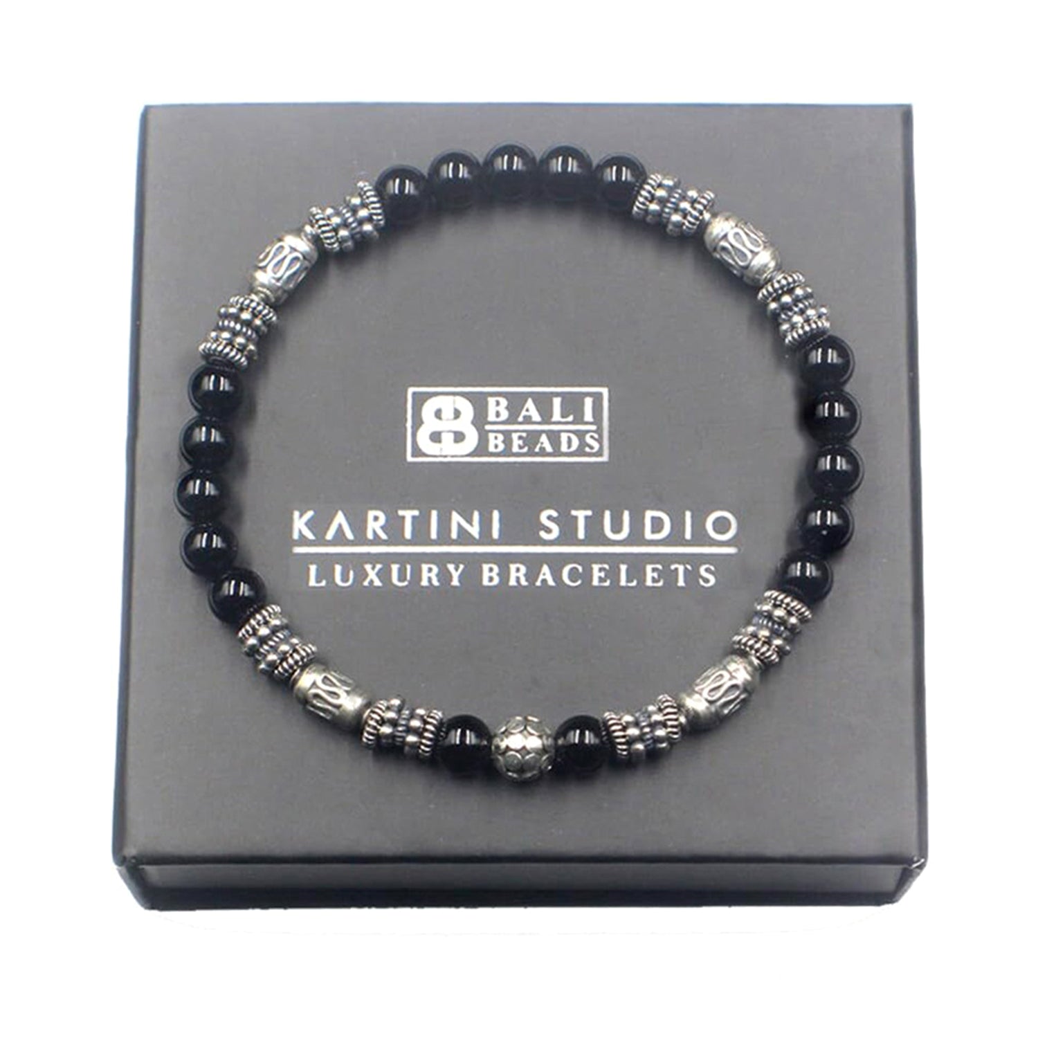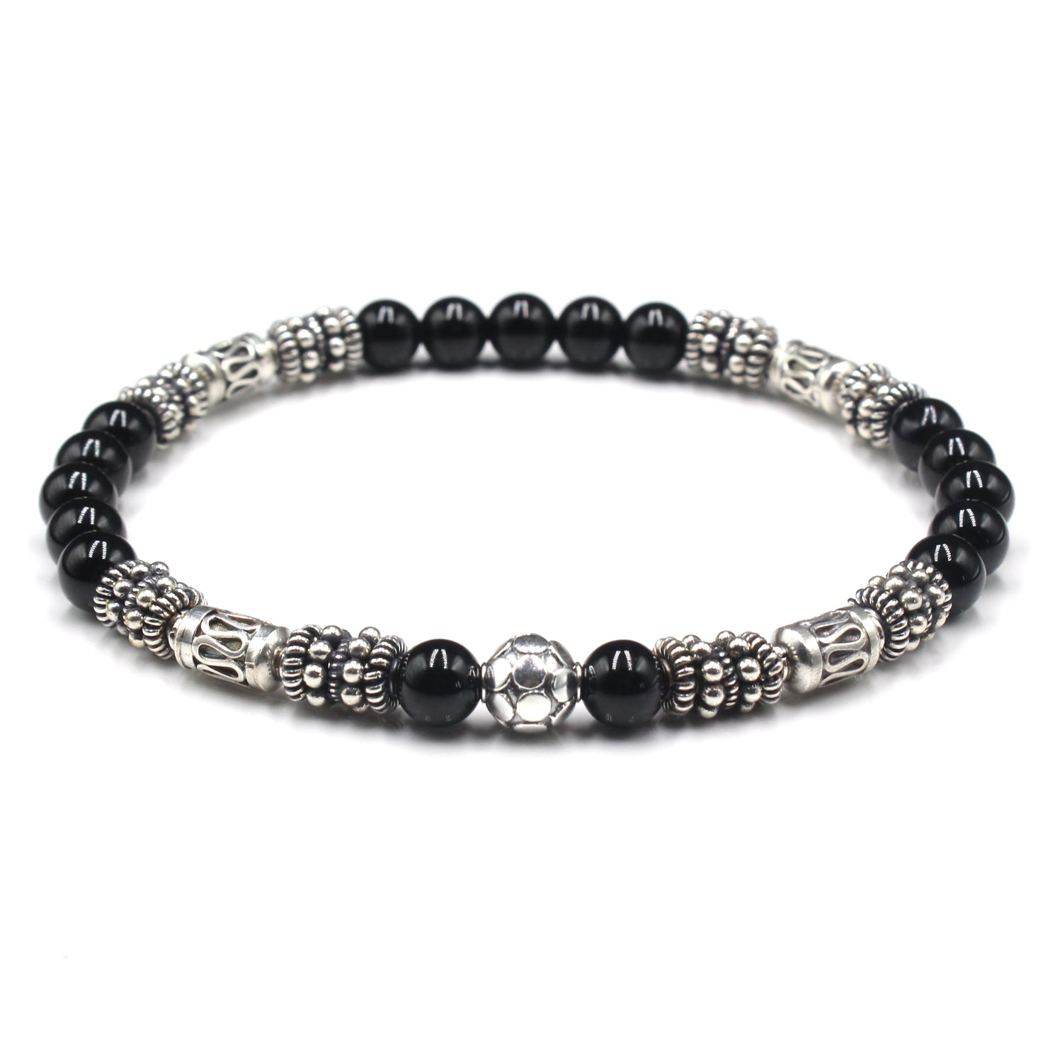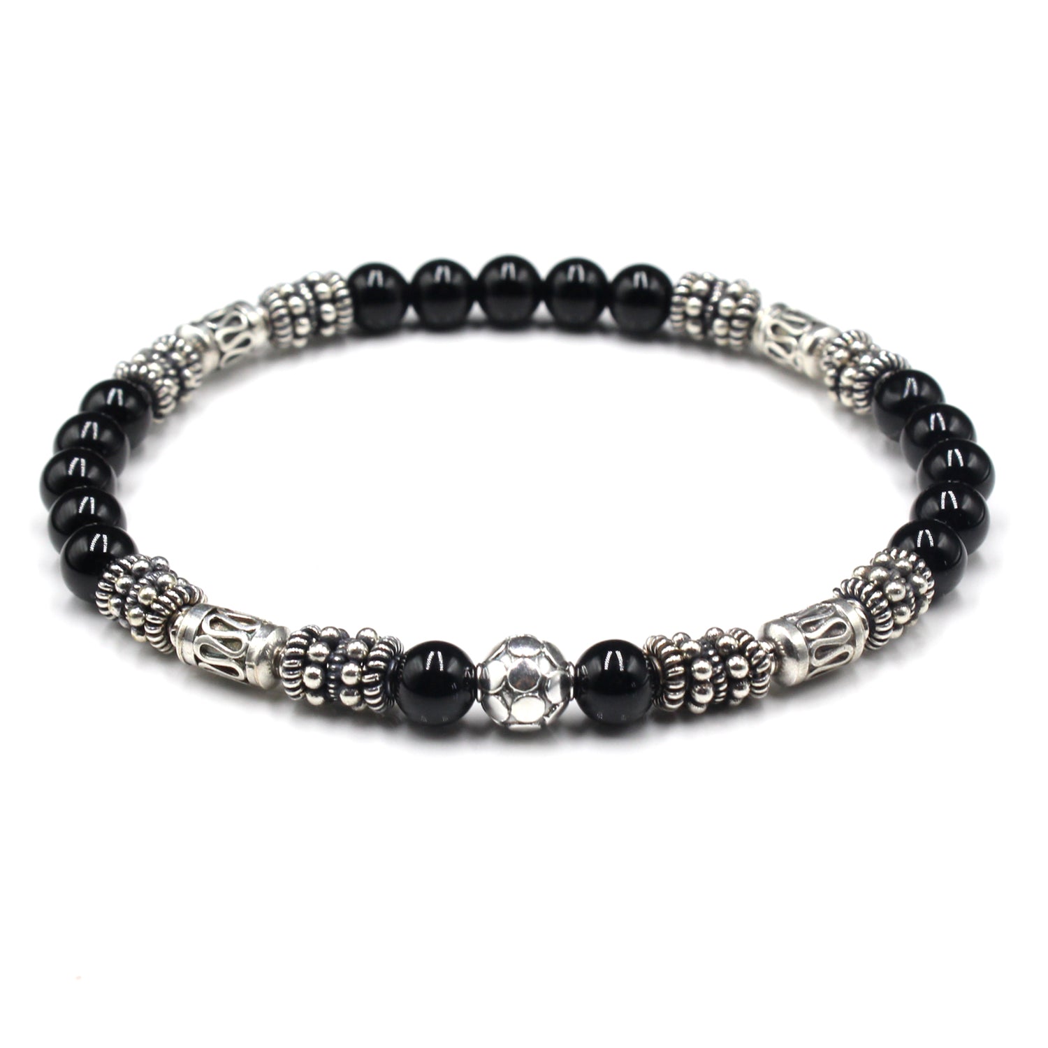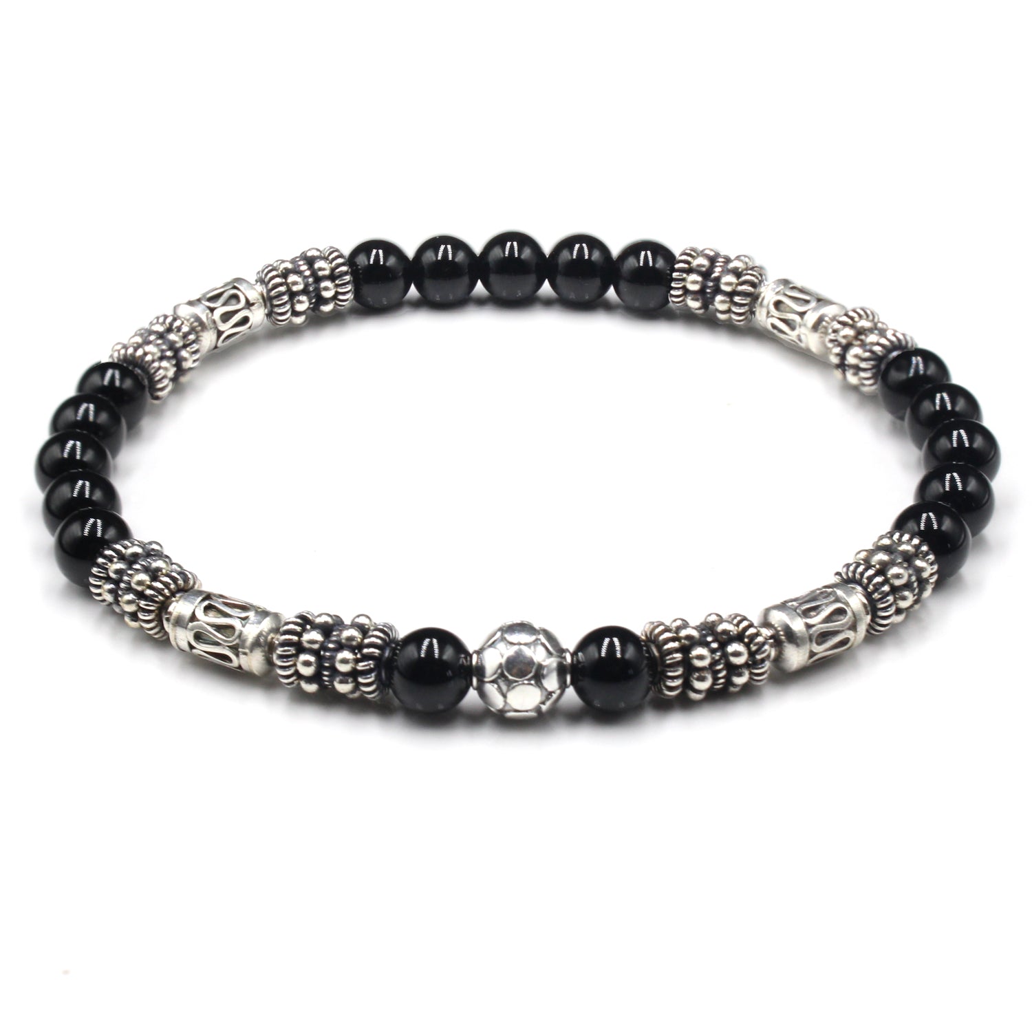 This bracelet features handmade 6mm sterling silver Bali beads and a selection of sterling silver spacer beads together with 6mm black onyx stone beads.