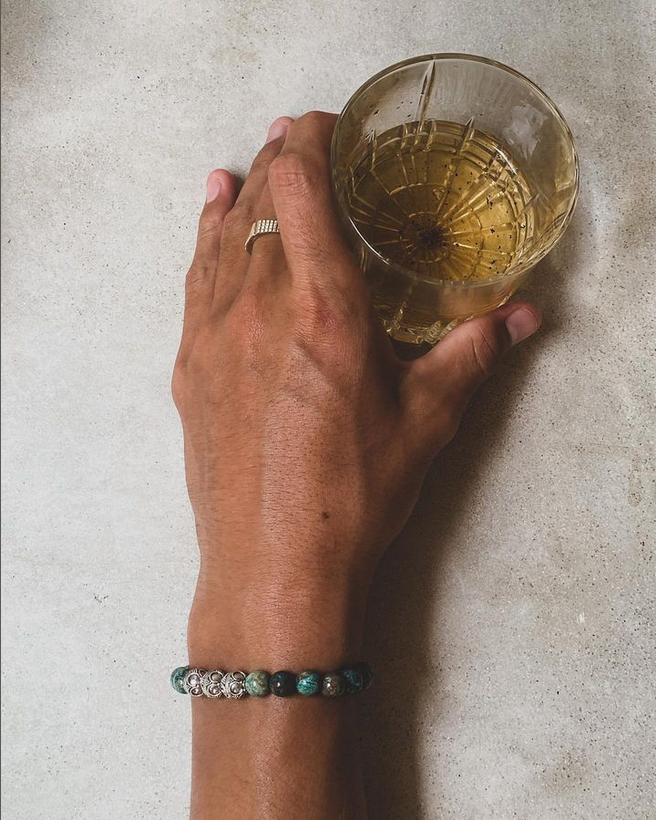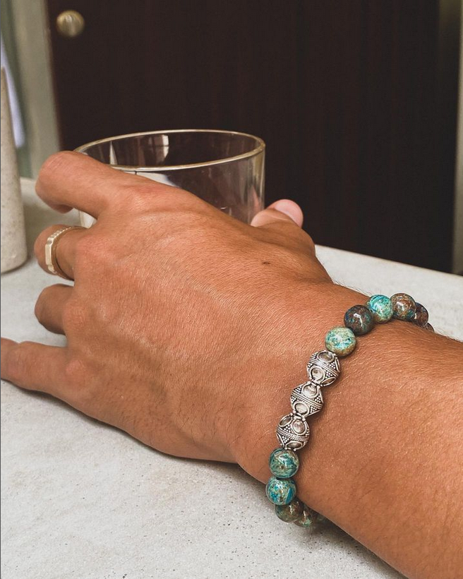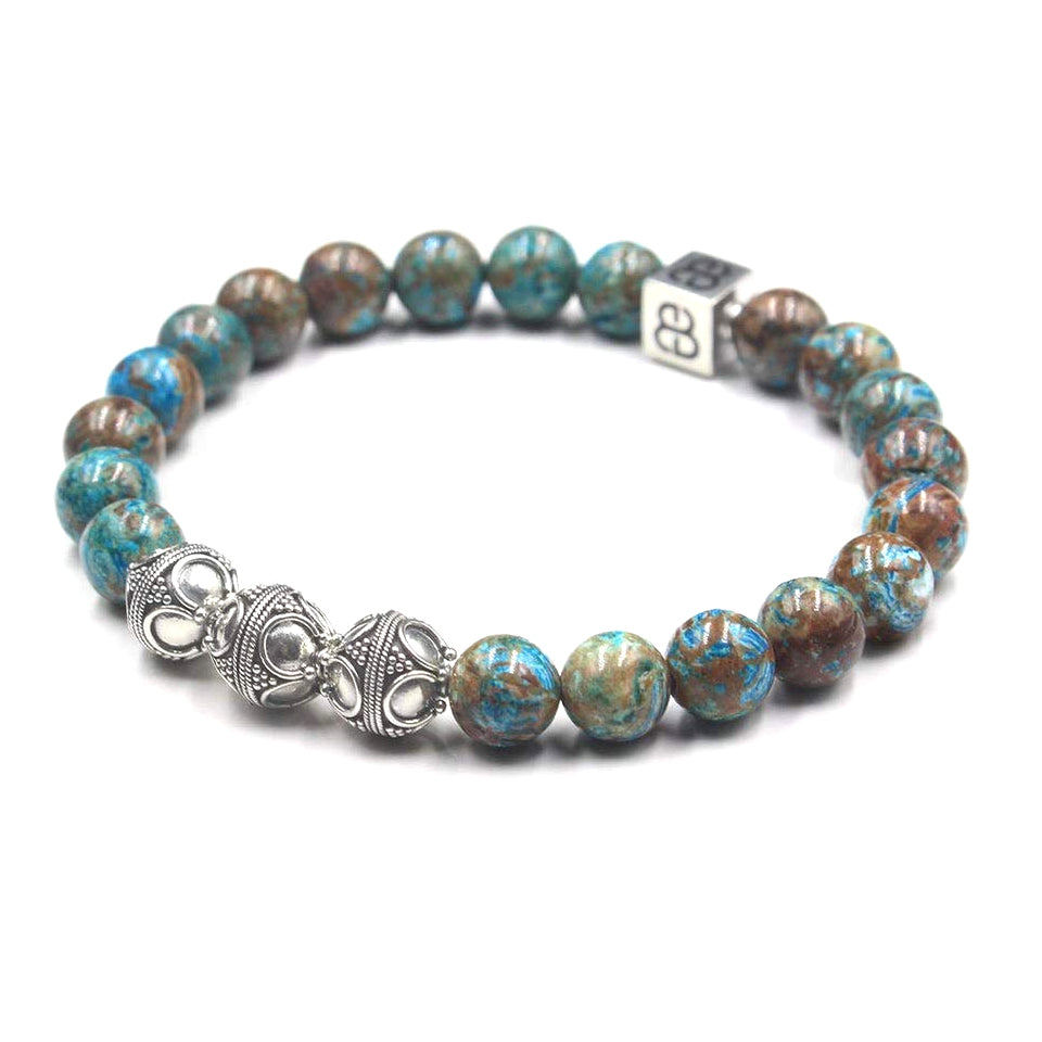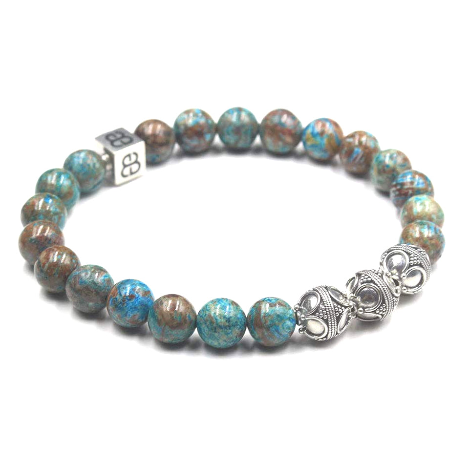 This bracelet features 8mm blue jasper stone beads accented with three sterling silver Bali beads and a 8mm x 8mm "Bali Beads" logo bead.
