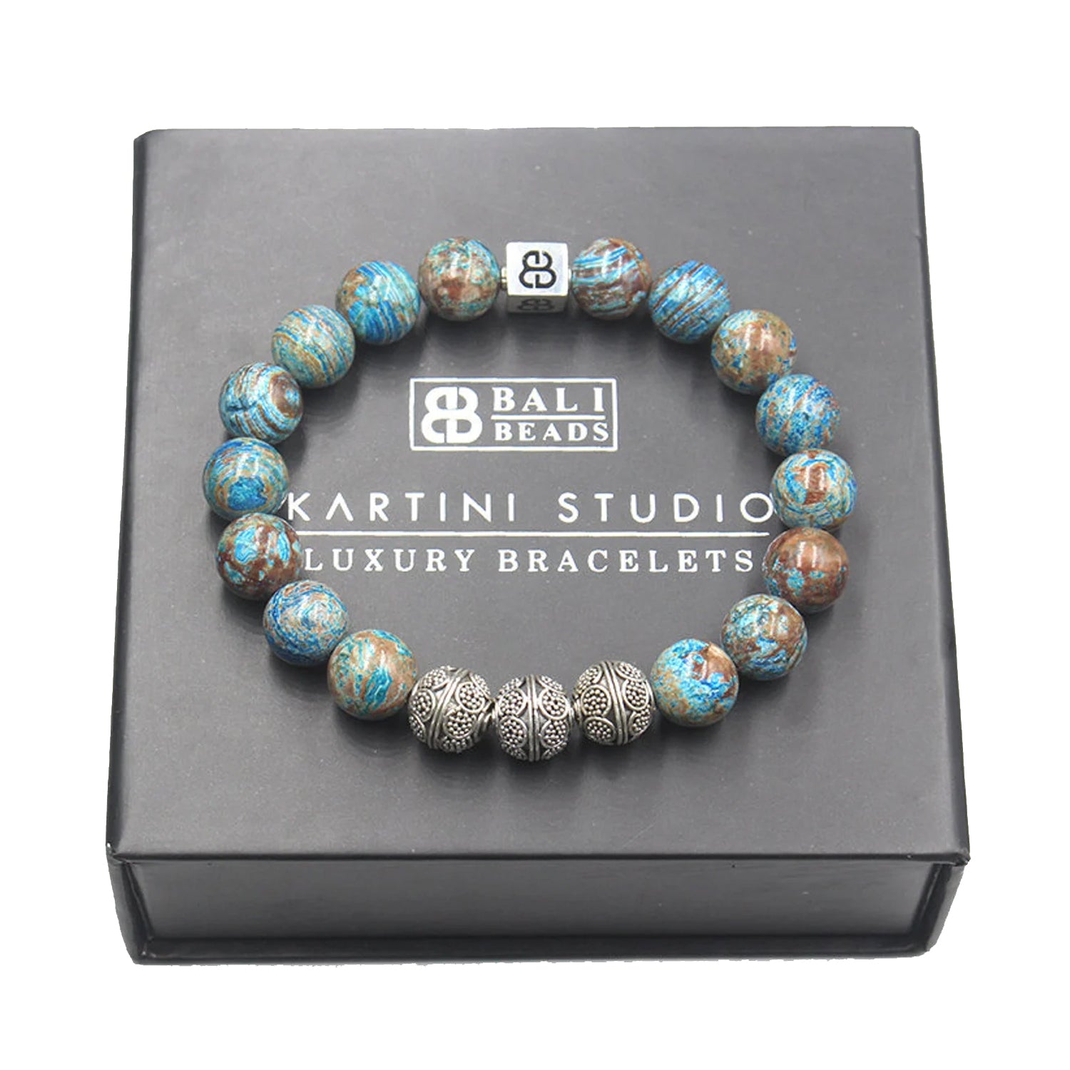 This deluxe bracelet features 10mm blue jasper beads accented with three 10mm 925 sterling silver Bali beads and a 8mm x 8mm 925 sterling silver "Bali Beads" logo bead.