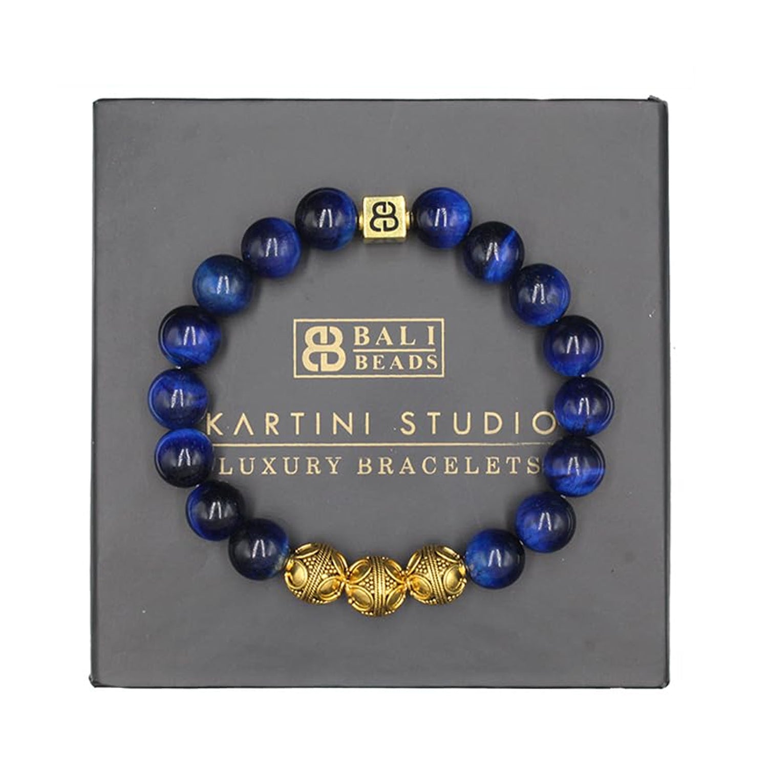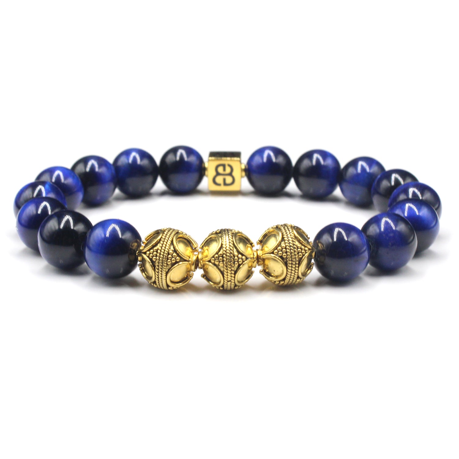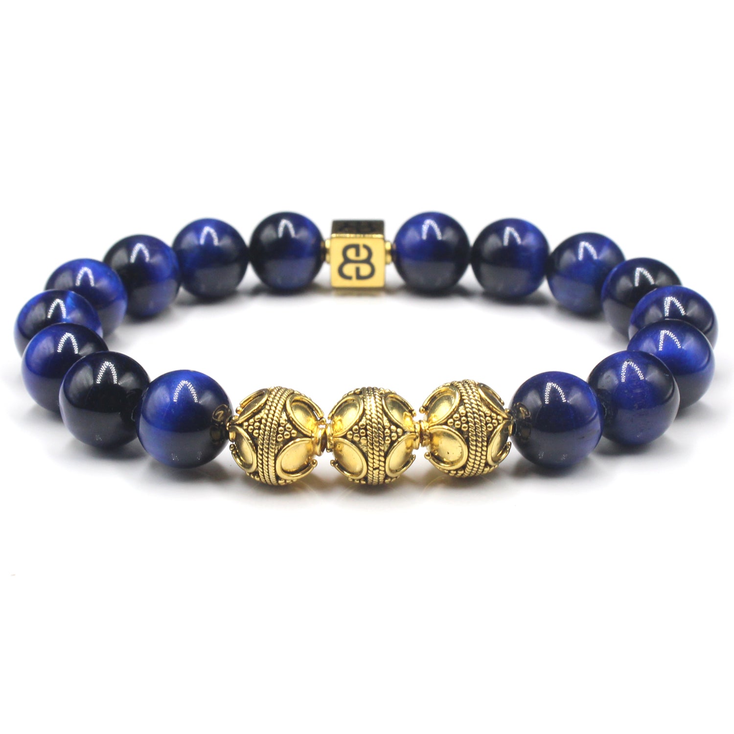 - This bracelet features 10mm blue Tiger’s Eye beads accented with three handmade 22 karat gold plated sterling silver beads and a 16mm x 8mm 22 karat gold plated sterling silver “Bali Beads” logo bead. The gold is gently oxidized to darken the recessed areas.