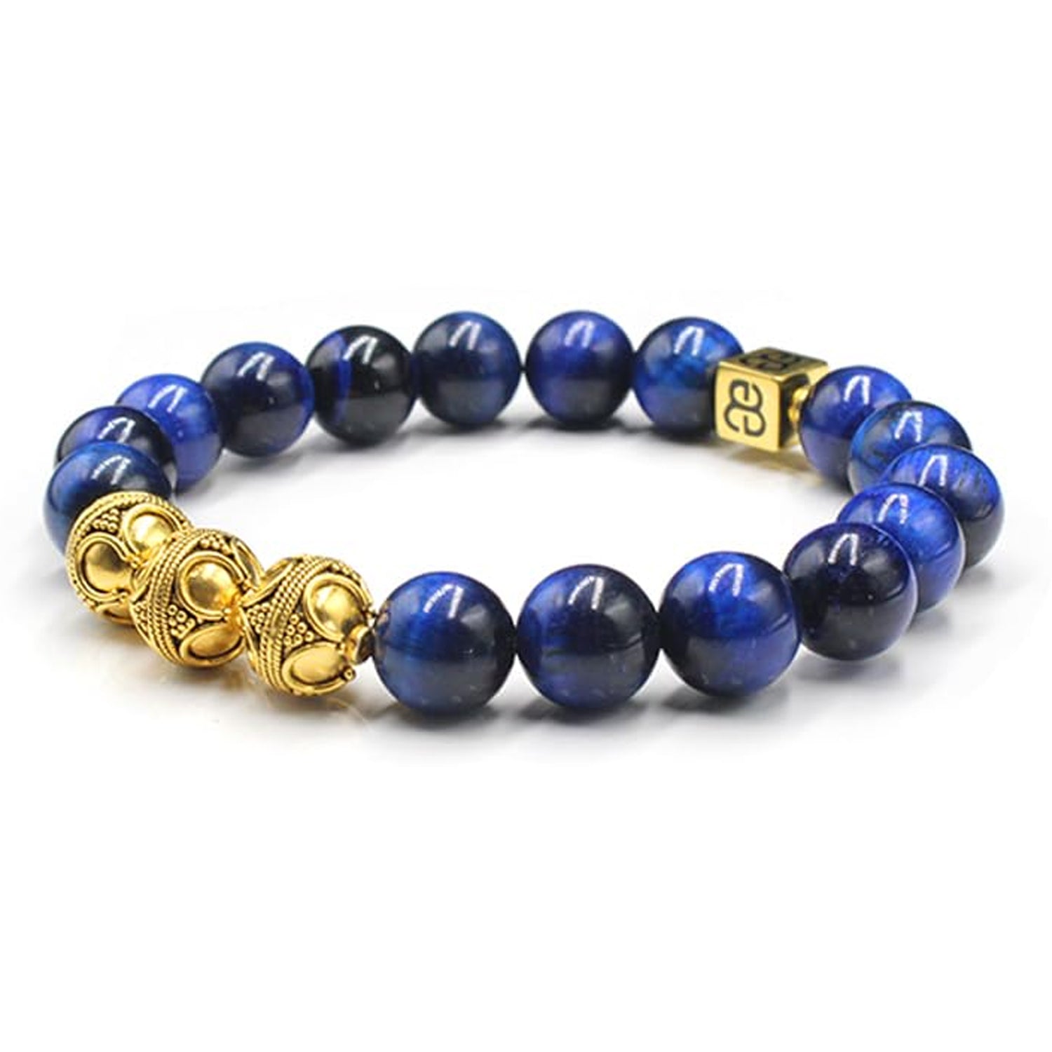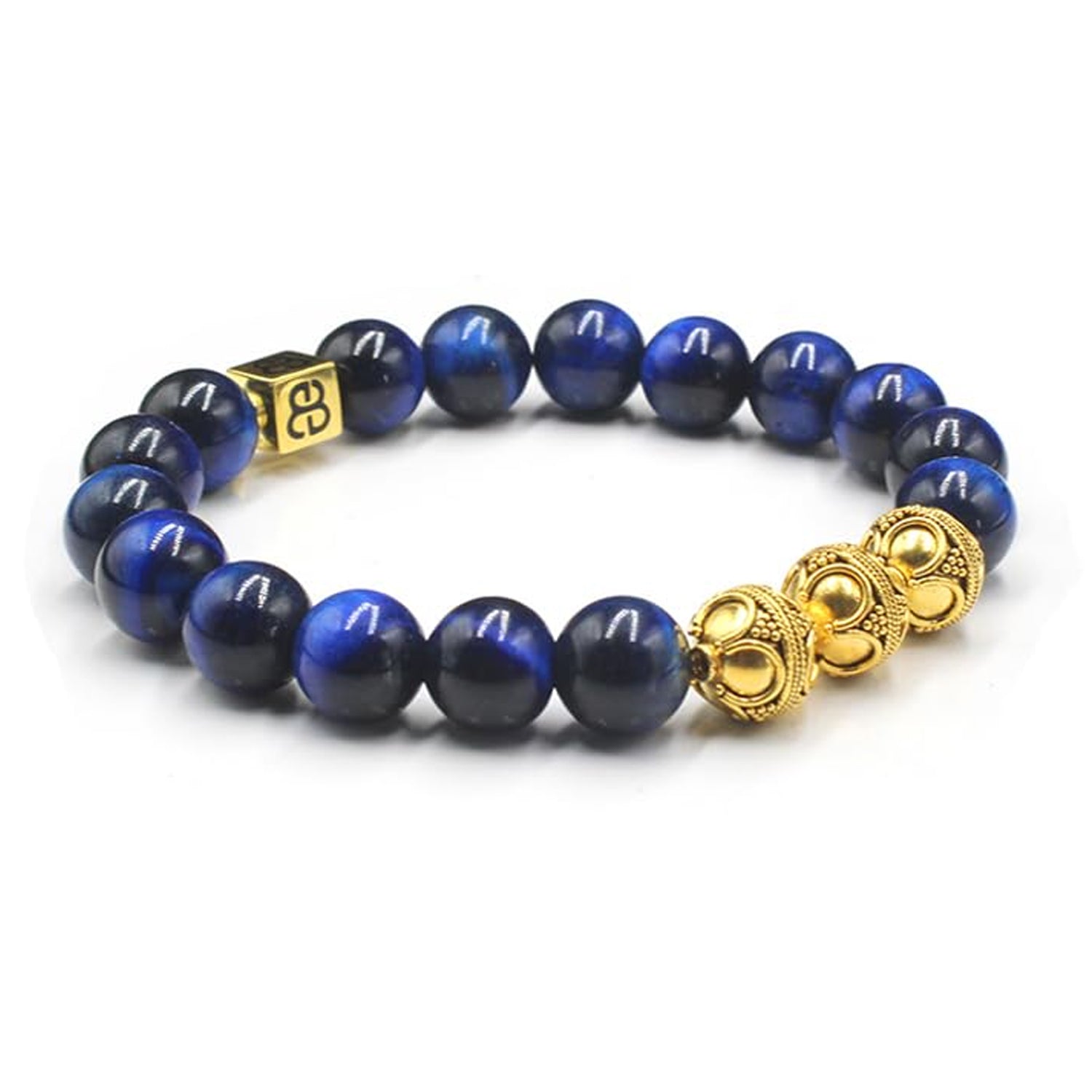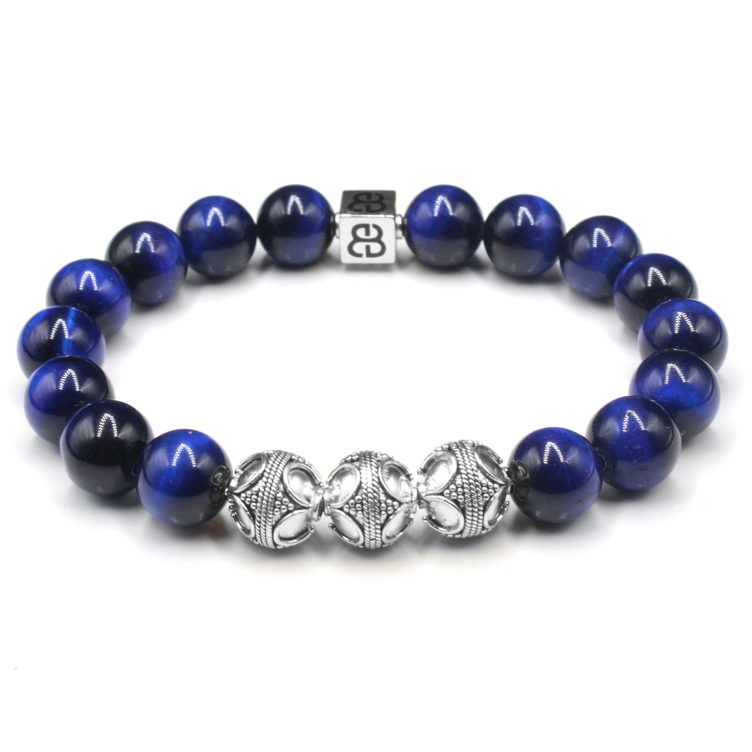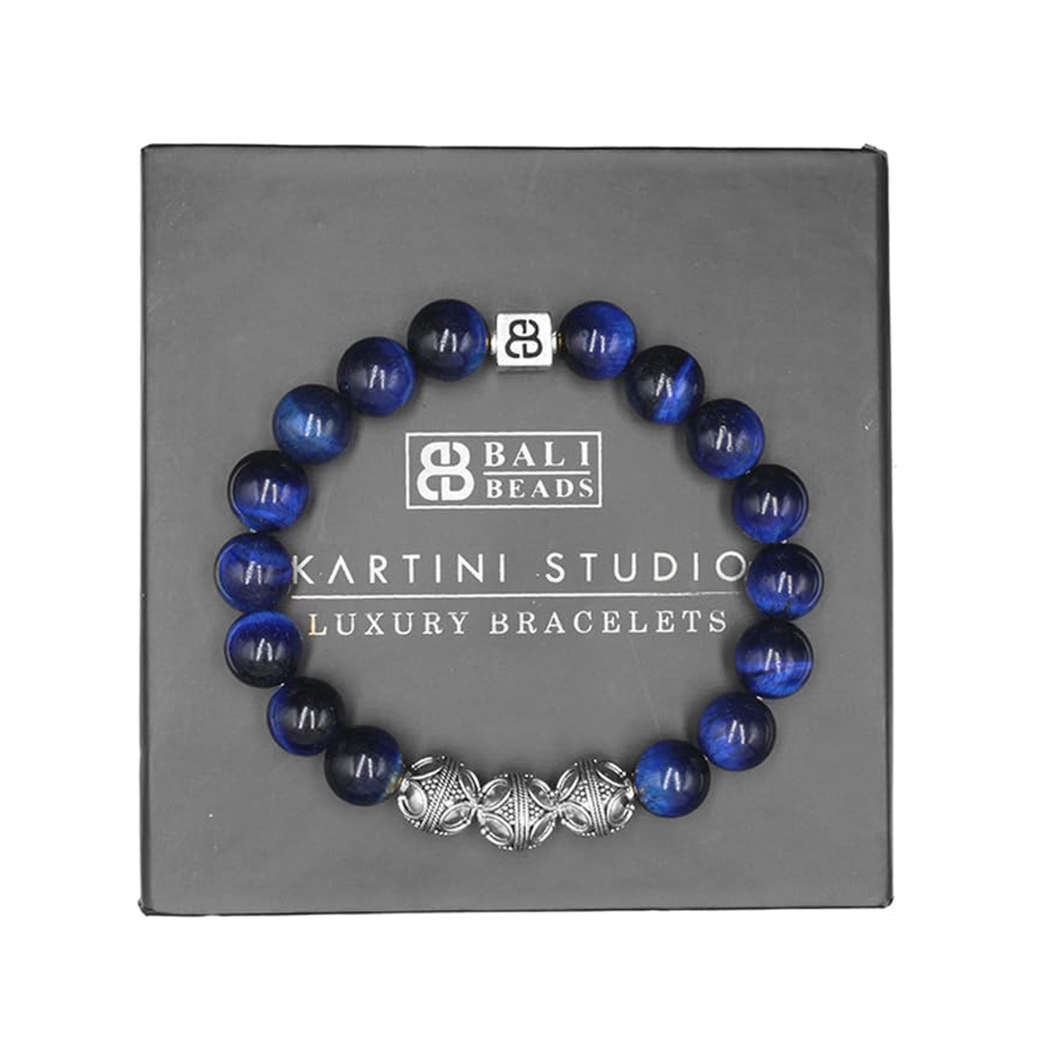 - This bracelet features 10mm blue Tiger’s Eye beads accented with three handmade 22 karat gold plated sterling silver beads and a 16mm x 8mm 22 karat gold plated sterling silver “Bali Beads” logo bead. The gold is gently oxidized to darken the recessed areas.