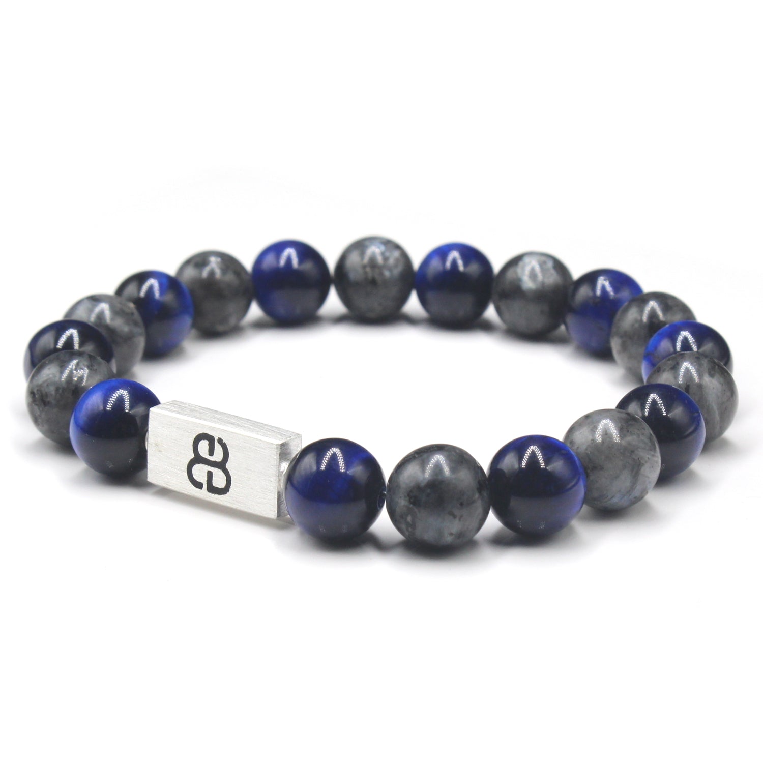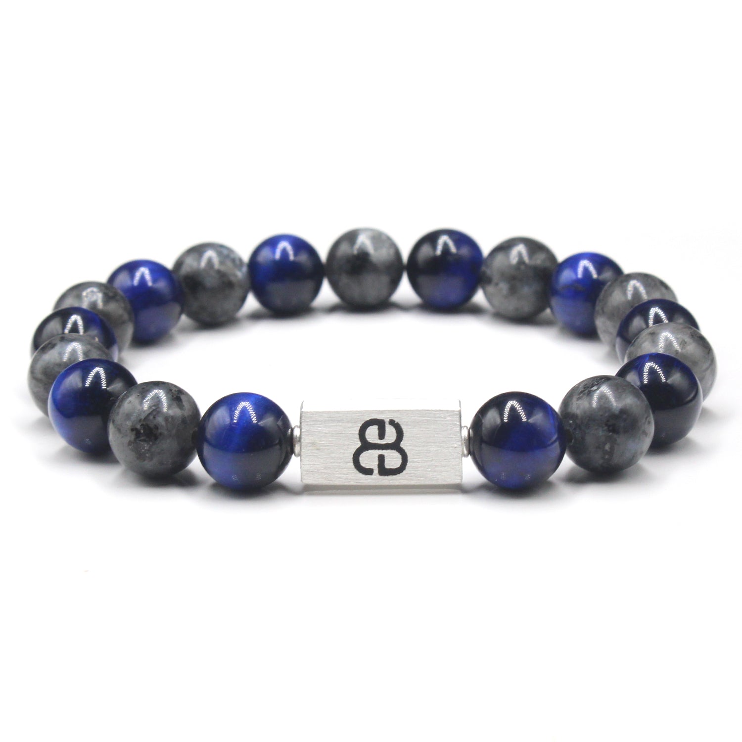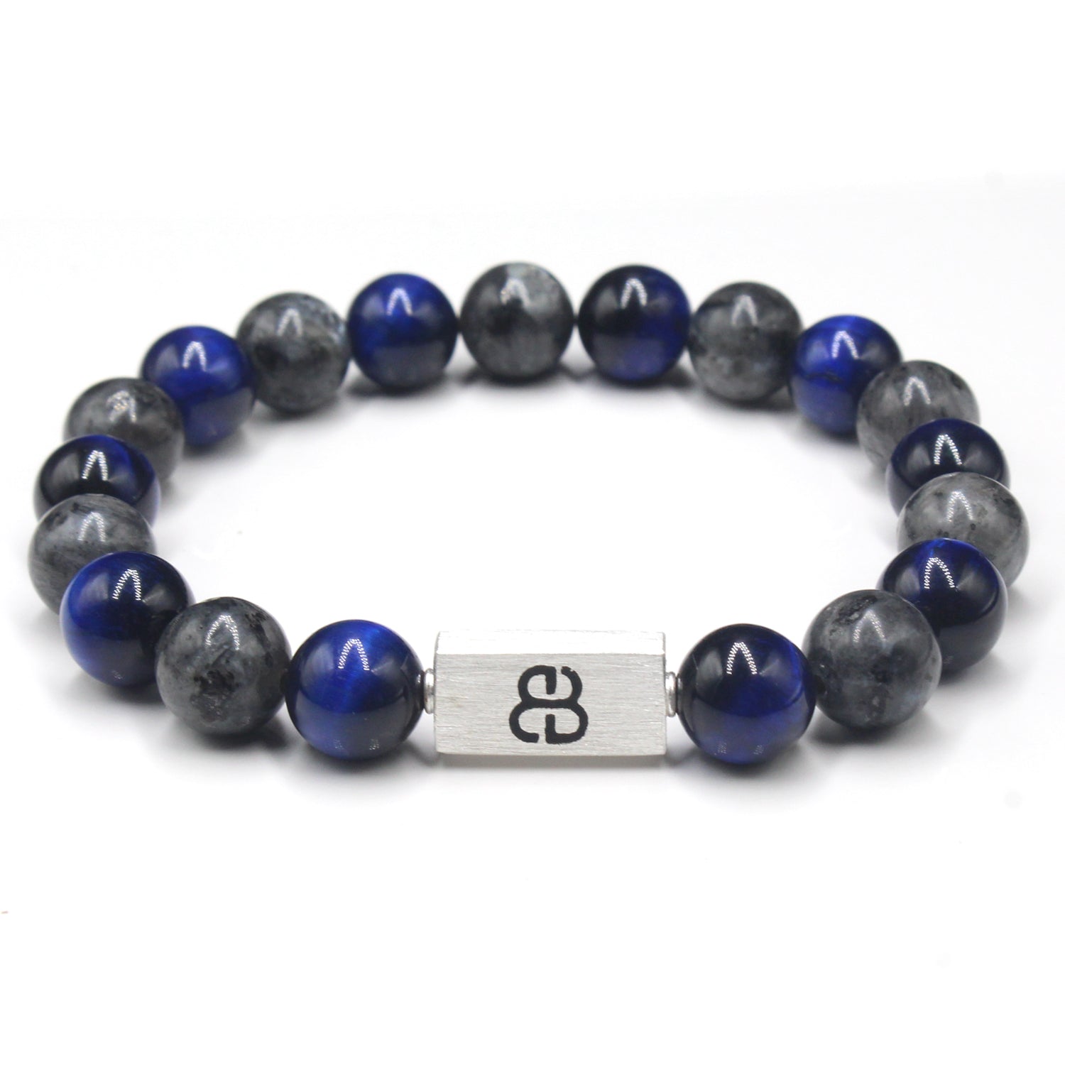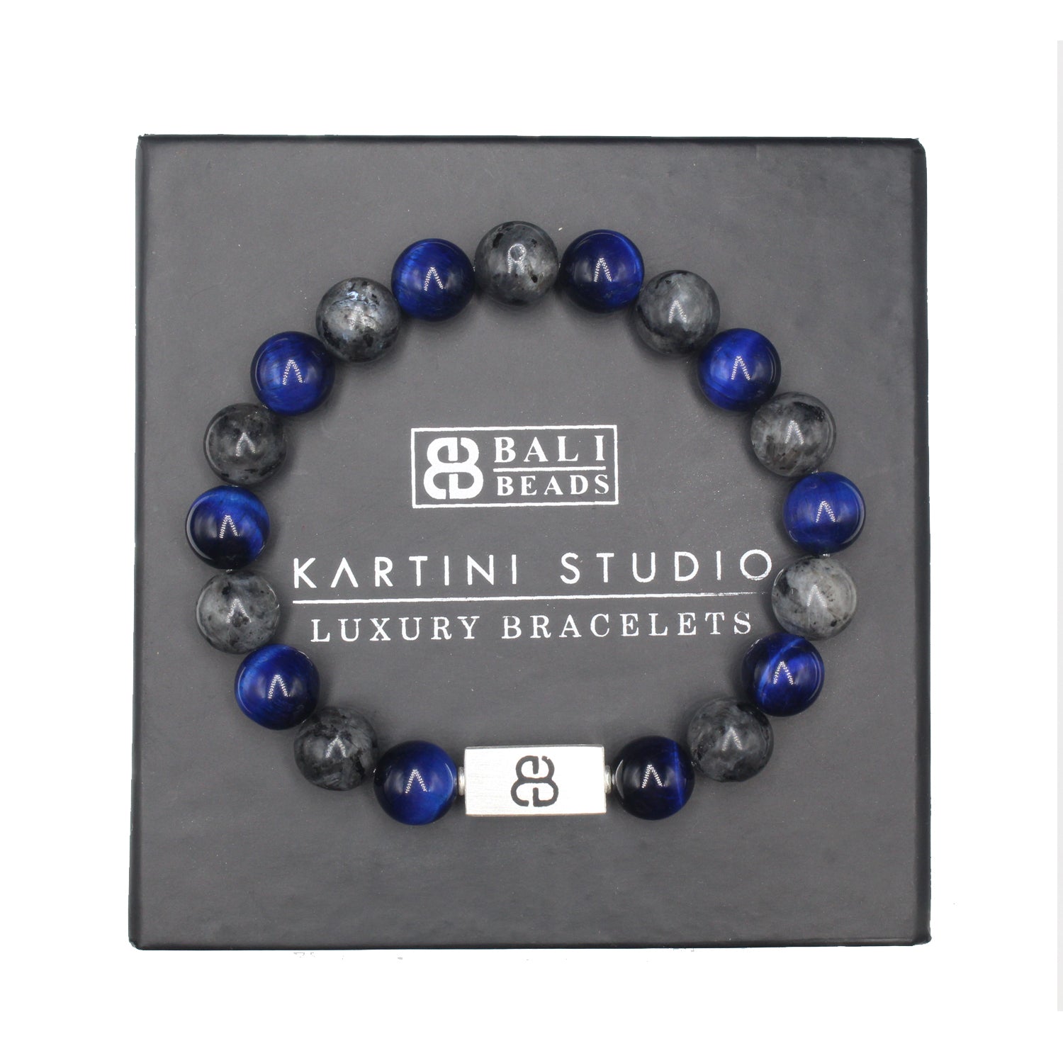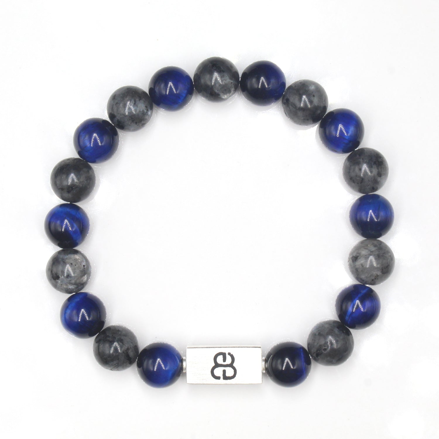 This bracelet features 10mm blue tiger's eye beads and 10mm labradorite beads accented with a 16mm x 8mm brushed sterling silver "Bali Beads" logo bead.