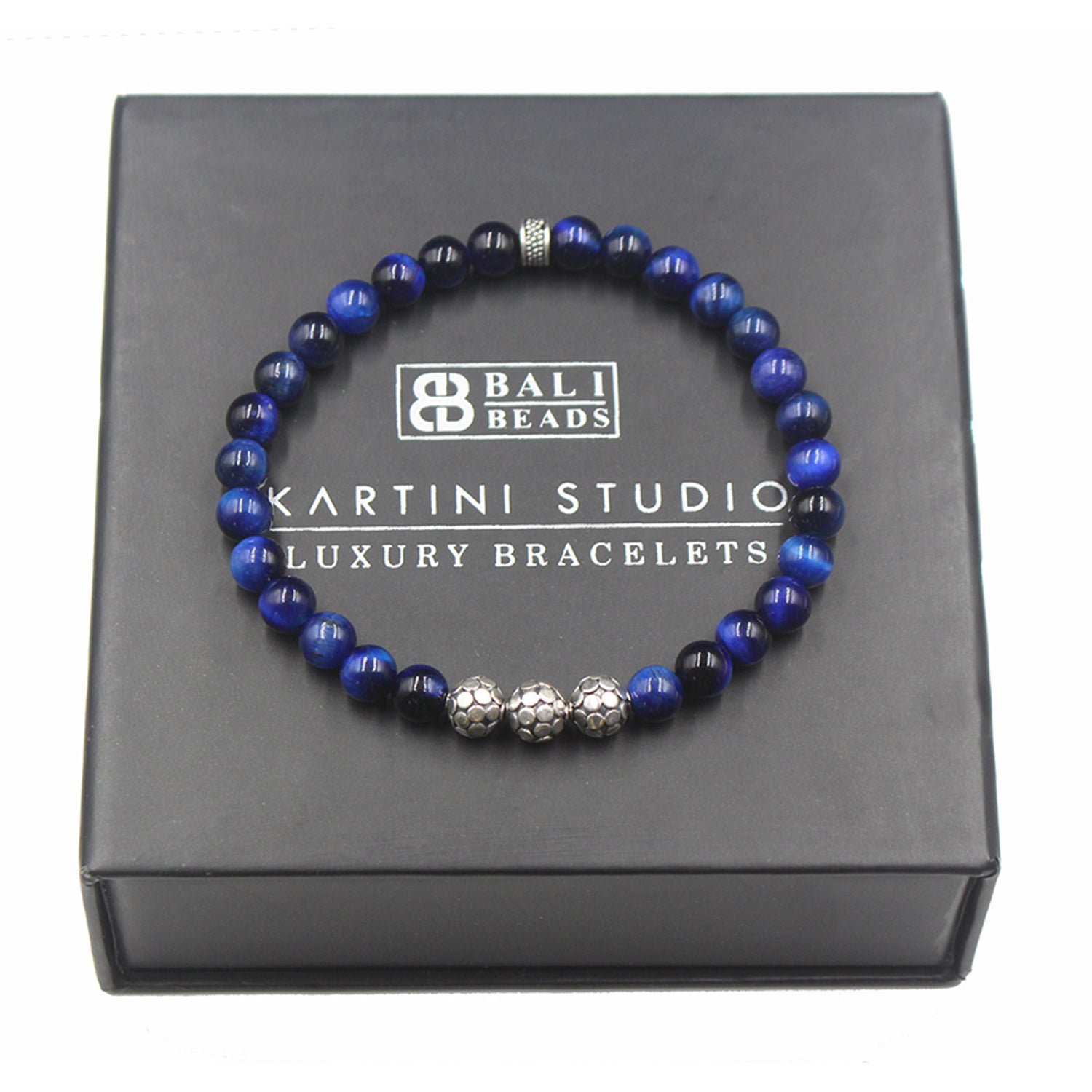 This bracelet features 6mm blue tiger's eye beads accented with three handmade sterling silver "dots" beads and a sterling silver rondelle bead.